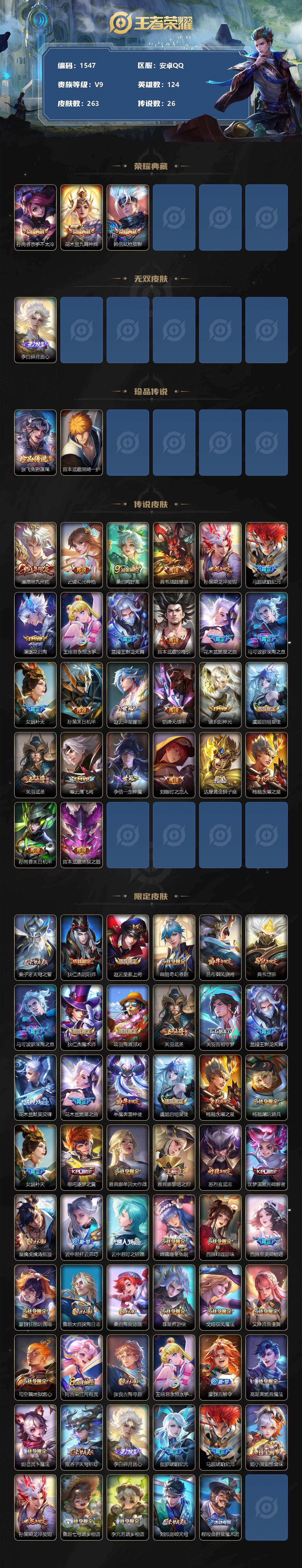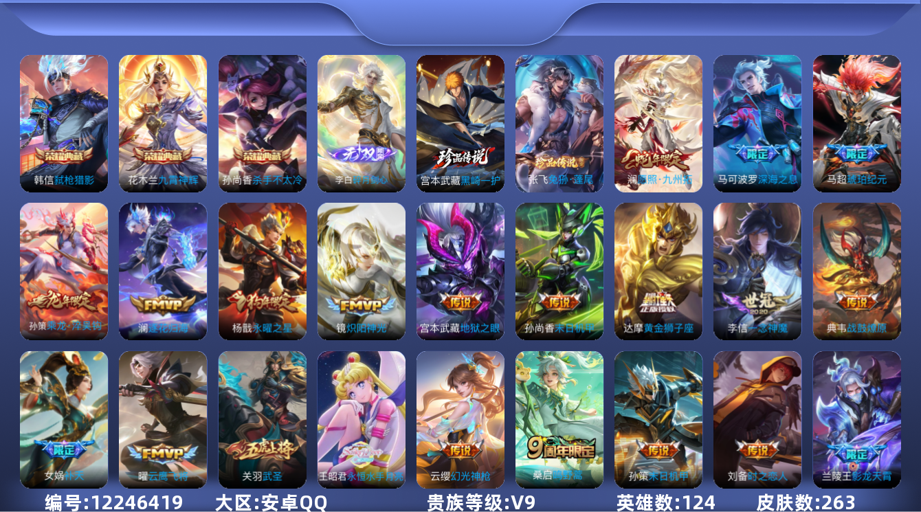 [12246419]【商品标题】:安卓Q-V9-最强王者段位-124英雄-263皮肤-3典藏-0珍品无双-1无双-2珍品传说-26传说-82史诗