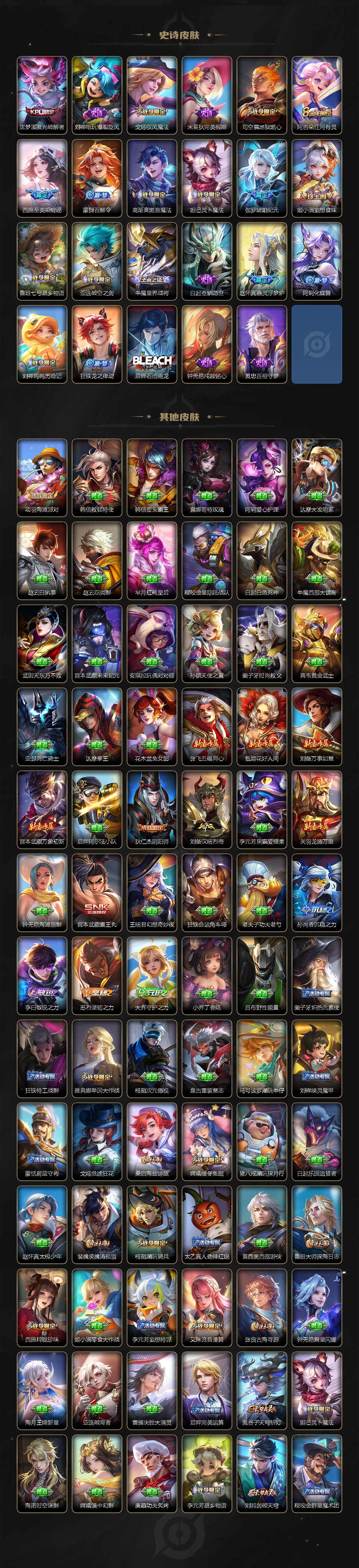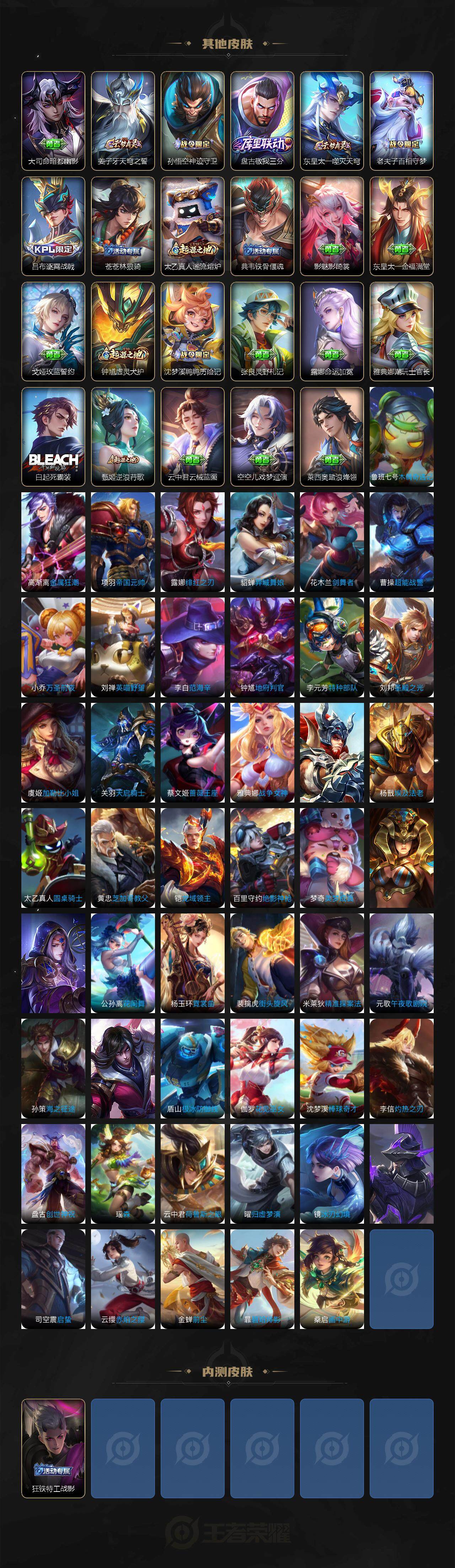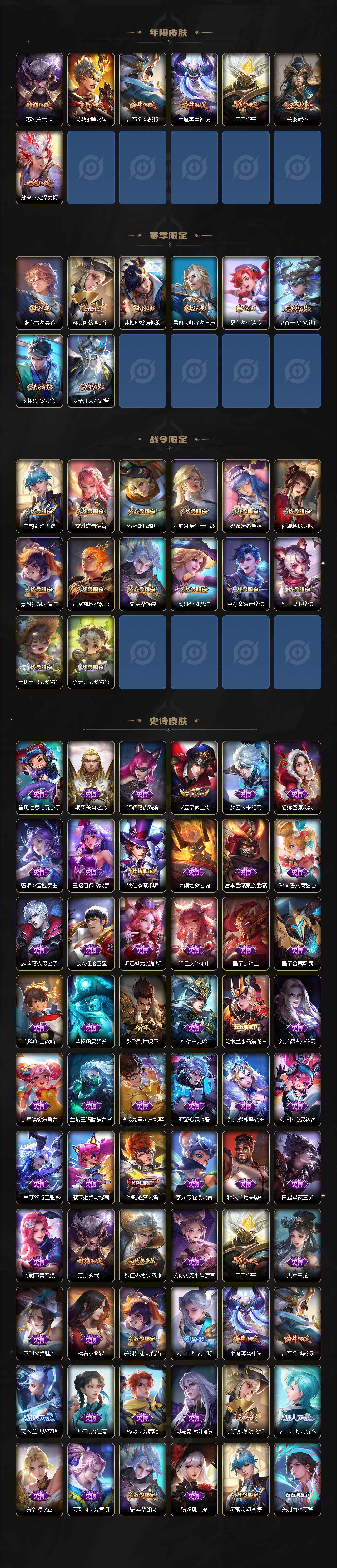 【限定皮肤】:姜子牙天穹之誓,狄仁杰阴阳师,赵云皇家上将,扁鹊奇幻香踪,吕布御风骁将,典韦岱宗,马可波罗深海之息,狄仁杰魔术师,项羽海滩派对,关羽武圣,关羽百相守梦,兰陵王影龙天霄,花木兰默契交锋,花木兰燃星之曲,牛魔奔雷神使,虞姬启明星使,杨戬永曜之星,杨戬潮玩骑兵,女娲补天,哪吒逐梦之翼,雅典娜单词大作战,雅典娜黎明之约,苏烈玄武志,沈梦溪匿光破解者,裴擒虎擒涛扼浪,云中君纤云弄巧,云中君时之祈愿,嫦娥暖冬兔眠,西施玲珑珍味,西施至美乘鲤谣,蒙犽狂想玩偶喵,鲁班大师探海日志,桑启海盐诗旅,暃星界游侠,戈娅驭风魔法,艾琳流音漫舞,司空震地狱燃心,阿古朵江河有灵,张良古海寻踪,王昭君永恒水手月亮,蒙犽百解令,高渐离燃音魔法,妲己灵卜魔法,鬼谷子天穹祈灯,李白碎月剑心,伽罗琥珀纪元,马超琥珀纪元,姬小满妄想食味,孙策乘龙淬吴钩,鲁班七号蔬乡物语,李元芳蔬乡物语,刘邦剑破天穹,程咬金群星魔术团
