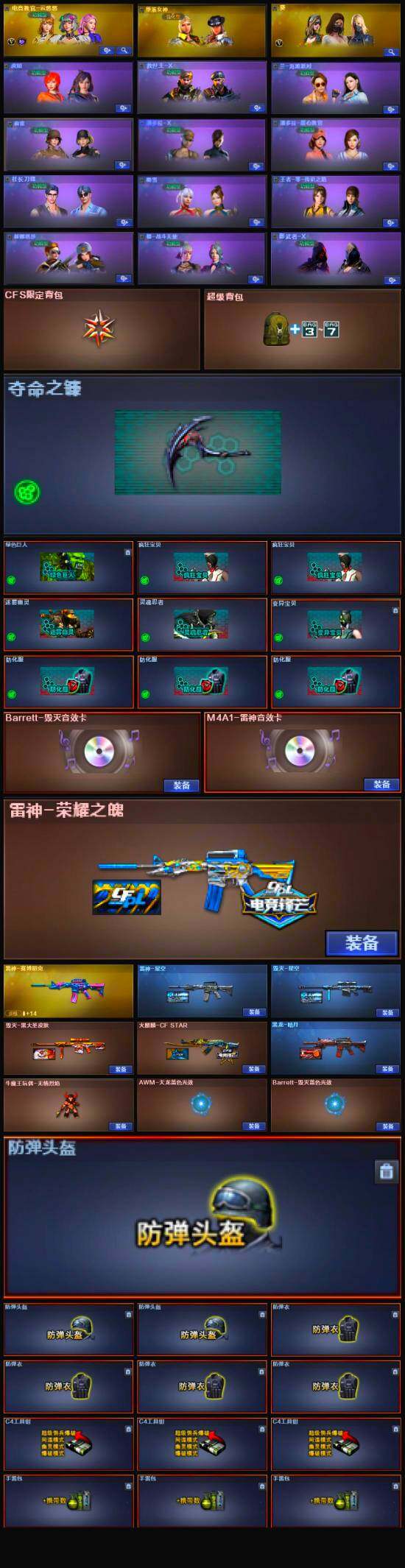 【英雄级武器】:M200-竞技荣光,柯尔特-竞技荣光,擎天-竞技荣光,高爆手雷-竞技荣光,烟雾弹-竞技荣光,闪光弹-竞技荣光,USP-雷暴,M4A1-雷神,M4A1-黑龙*2,汤姆逊-烈龙*6,AK47-无影*4,AK47-火麒麟,AN94-超新星,AWM-天龙,Barrett-毁灭*4,Barrett-极光,AWM-裁决,AK-47-猩红传说*3,沙鹰-天神*3,屠龙*3