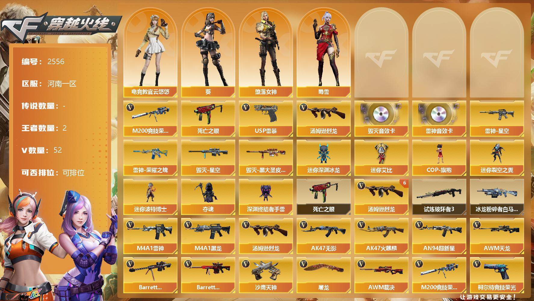 [12246626]【商品标题】:河南一区-52V-2王者-0炫金 【热门武器】:M200-竞技荣光,死亡之眼,汤姆逊-烈龙*6,USP-雷暴 【音效卡】:M4A1-雷神音效卡,Barrett-毁灭音效卡 【稀有皮肤】:雷神-荣耀之魄,雷神-星空,毁灭-星空,毁灭-黑大圣皮肤 【角色】:堕落女神,葵,电竞教官-云悠悠,蜀雪 【人偶武器】:COP-旗袍,迷你深渊冰龙,迷你艾比,迷你裂空之翼,迷你波特博士,夺魂,深渊终结者手雷 【暴走生化】:死亡之眼 【挑战大师】:试炼破坏者III,冰龙粉碎者-白马银枪 【英雄级武器】:M200-竞技荣光,柯尔特-竞技荣光,擎天-竞技荣光,高爆手雷-竞技荣光,烟雾弹-竞技荣光,闪光弹-竞技荣光,USP-雷暴,M4A1-雷神,M4A1-黑龙*2,汤姆逊-烈龙*6,AK47-无影*4,AK47-火麒麟,AN94-超新星,AWM-天龙,Barrett-毁灭*4,Barrett-极光,AWM-裁决,AK-47-猩红传说*3,沙鹰-天神*3,屠龙*3 【特殊枪械】:6烈龙