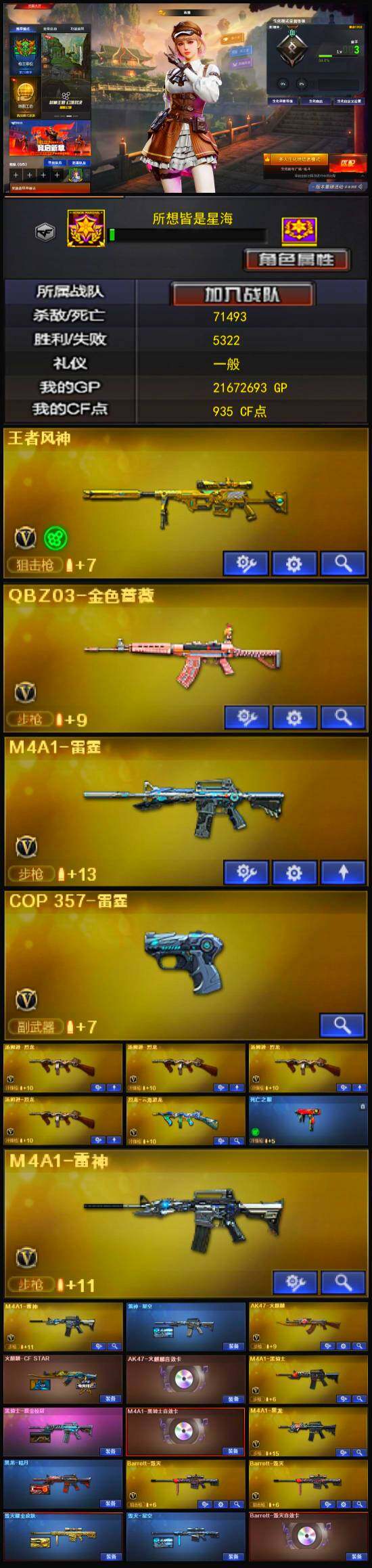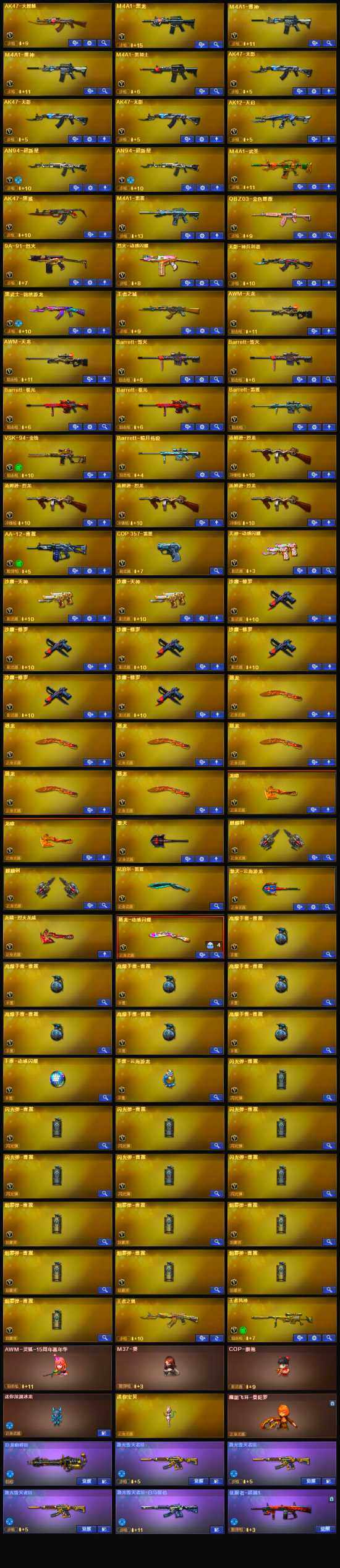 【英雄级武器】:M4A1-雷霆,M4A1-武圣,烈火-动感闪耀,天神-动感闪耀,屠龙-动感闪耀,手雷-动感闪耀,QBZ03-金色蔷薇,无影-神兵利器,M4A1-雷神*2,M4A1-黑龙,M4A1-黑骑士,汤姆逊-烈龙*4,AK47-无影*3,AK47-火麒麟,AK12-天启,AN94-超新星*2,AWM-天龙*2,Barrett-毁灭*2,Barrett-极光*2,AA-12-雷霆,AK47-黑鲨,VSK-94-金蚀,黑武士-锦绣游龙,AK-47-猩红传说,沙鹰-天神*2,沙鹰-修罗*6,麒麟刺*2,擎天,龙啸*2,屠龙*6,擎天-云海游龙