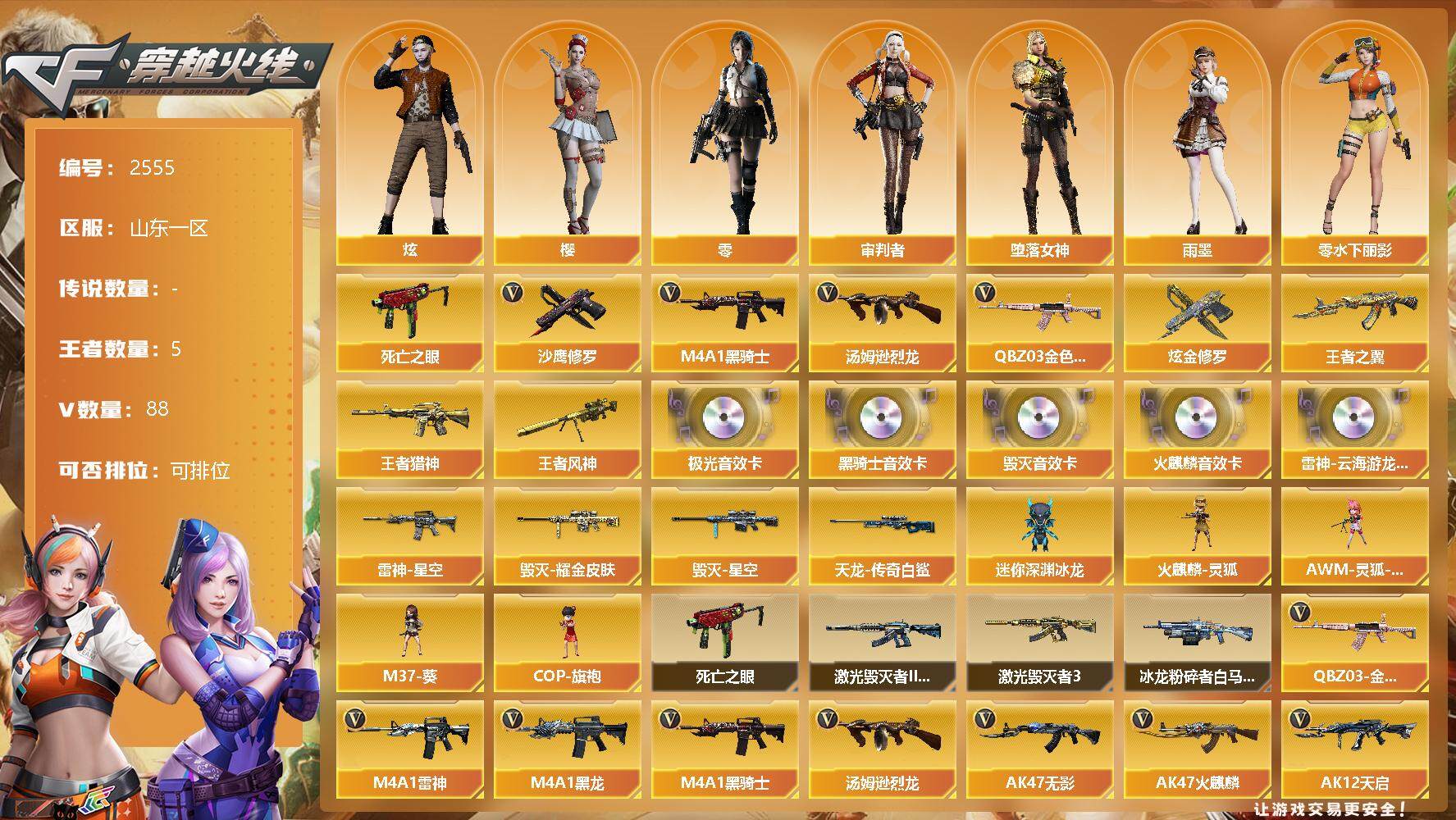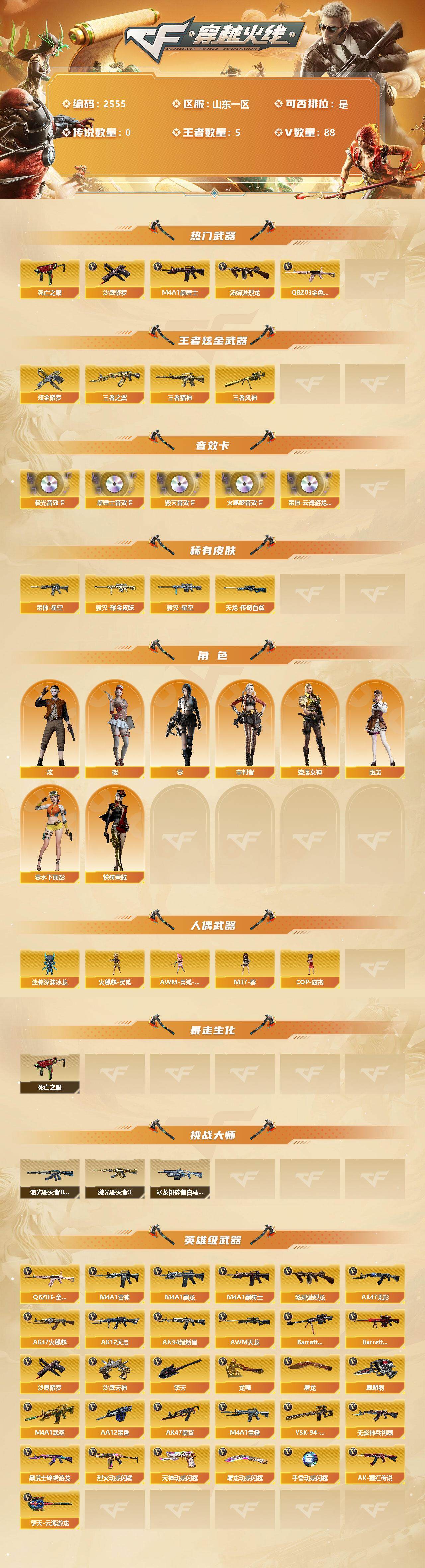 [12246723]【商品标题】:山东一区-88V-5王者-1炫金 【热门武器】:QBZ03-金色蔷薇,死亡之眼,M4A1-黑骑士,汤姆逊-烈龙*4,沙鹰-修罗*6 【王者炫金武器】:炫金修罗,王者之翼,王者风神,王者猎神 【音效卡】:AK47-火麒麟音效卡,M4A1-雷神-云海游龙音效卡,M4A1-黑骑士音效卡,Barrett-毁灭音效卡,Barrett-极光音效卡 【稀有皮肤】:雷神-星空,毁灭耀金皮肤,毁灭-星空,AWM-天龙-传奇白鲨 【角色】:堕落女神,零-水下丽影,审判者,零,樱,炫,雨墨,铁骑荣耀 【人偶武器】:火麒麟-灵狐,AWM-灵狐-15周年嘉年华,M37-葵,COP-旗袍,迷你深渊冰龙 【暴走生化】:死亡之眼 【挑战大师】:激光毁灭者III*3,激光毁灭者III-白马银枪,冰龙粉碎者-白马银枪 【英雄级武器】:M4A1-雷霆,M4A1-武圣,烈火-动感闪耀,天神-动感闪耀,屠龙-动感闪耀,手雷-动感闪耀,QBZ03-金色蔷薇,无影-神兵利器,M4A1-雷神*2,M4A1-黑龙,M4A1-黑骑士,汤姆逊-烈龙*4,AK47-无影*3,AK47-火麒麟,AK12-天启,AN94-超新星*2,AWM-天龙*2,Barrett-毁灭*2,Barrett-极光*2,AA-12-雷霆,AK47-黑鲨,VSK-94-金蚀,黑武士-锦绣游龙,AK-47-猩红传说,沙鹰-天神*2,沙鹰-修罗*6,麒麟刺*2,擎天,龙啸*2,屠龙*6,擎天-云海游龙 【特殊枪械】:1黑骑士,4烈龙
