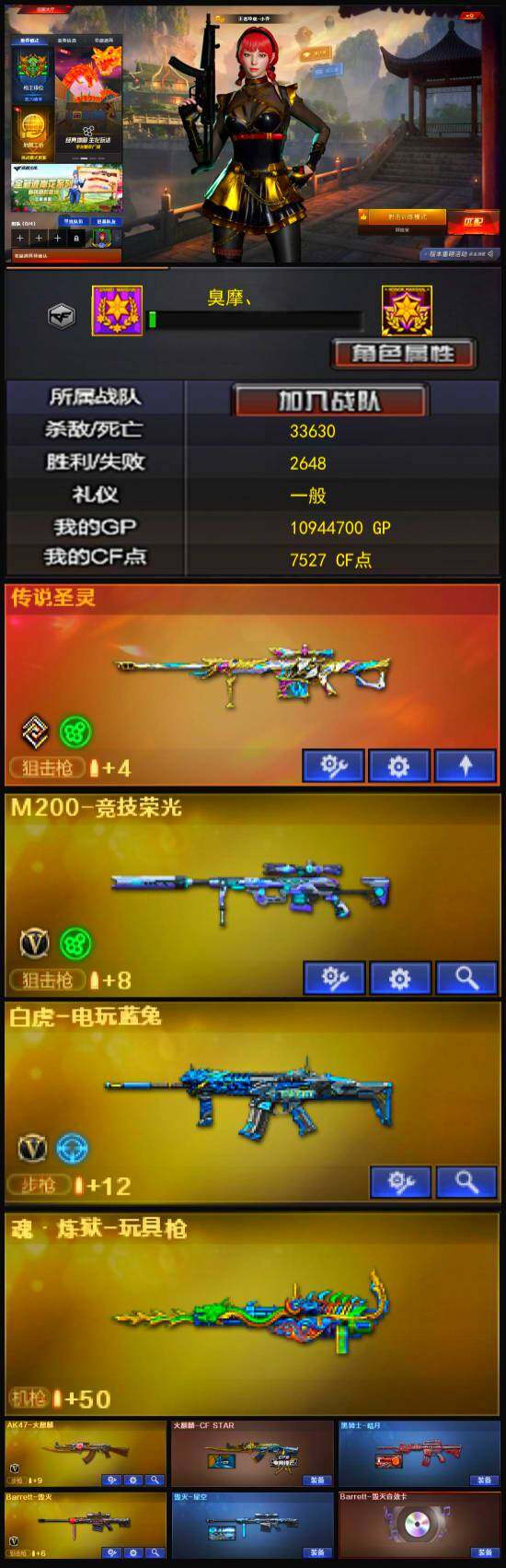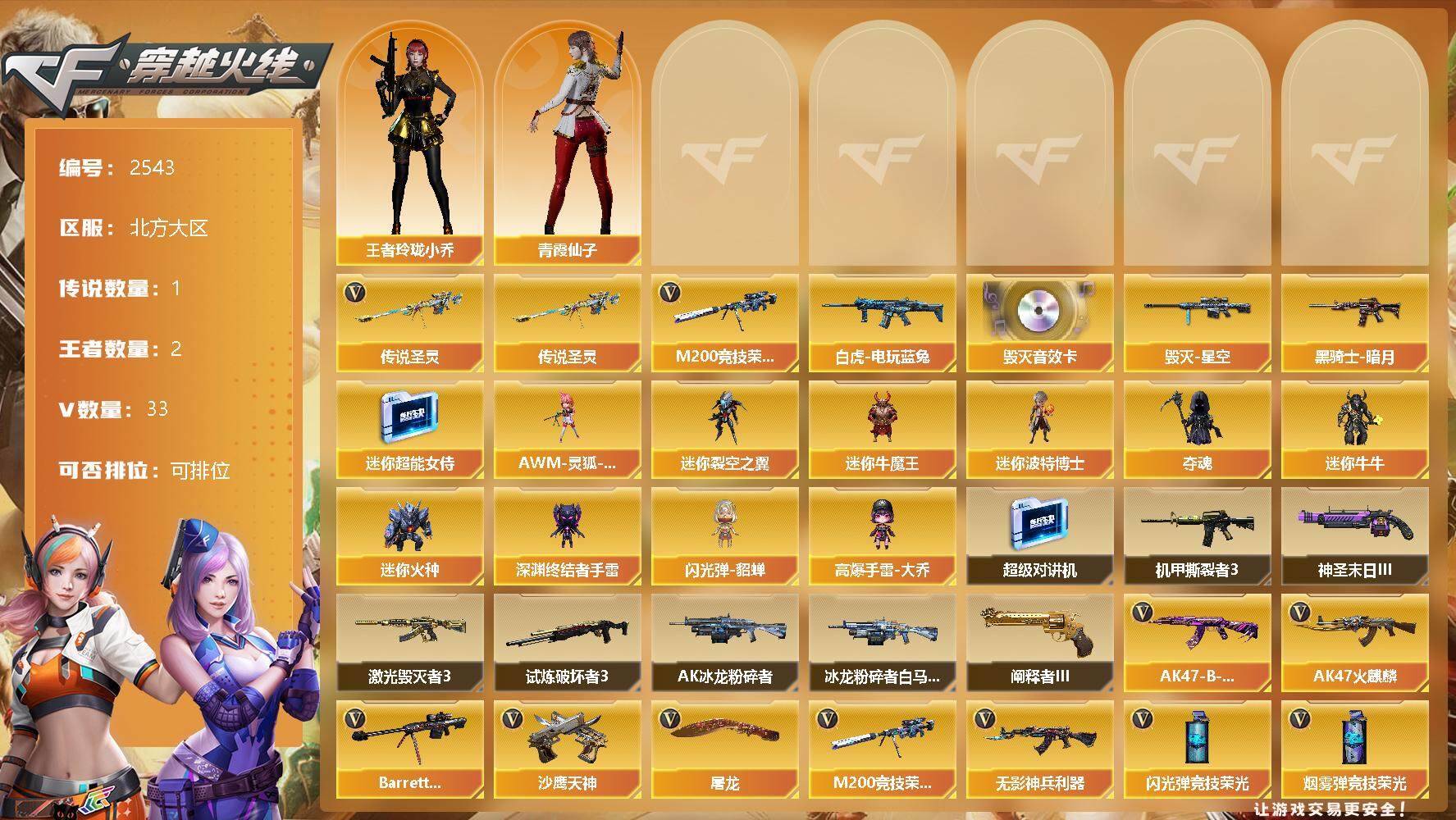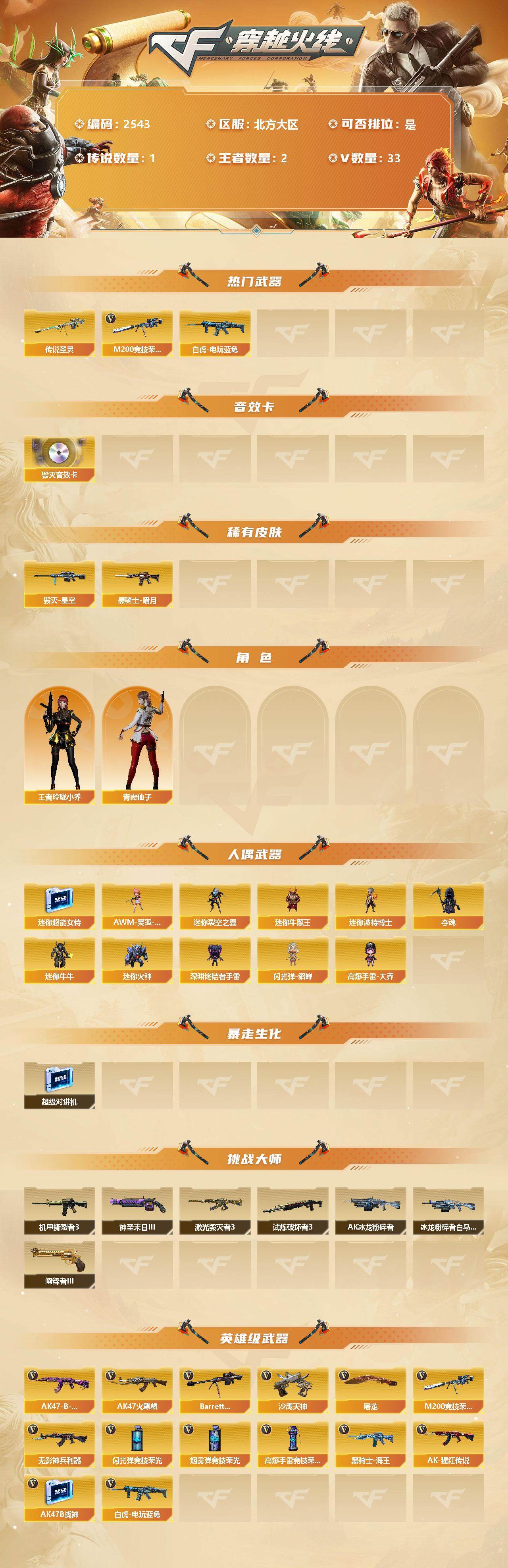 [12246954]【商品标题】:北方大区-33V-2王者-0炫金 【传说武器】:传说圣灵 【热门武器】:传说圣灵,M200-竞技荣光,白虎-电玩蓝兔 【音效卡】:Barrett-毁灭音效卡 【稀有皮肤】:黑骑士-暗月,毁灭-星空 【角色】:王者玲珑-小乔,青霞仙子 【人偶武器】:AWM-灵狐-15周年嘉年华,迷你超能女侍,迷你裂空之翼*3,迷你牛魔王,迷你波特博士*2,夺魂,迷你牛牛,迷你火种*2,深渊终结者手雷,闪光弹-貂蝉,高爆手雷-大乔 【暴走生化】:超级对讲机 【挑战大师】:机甲撕裂者III,神圣爆裂者-末日III,阐释者III,试炼破坏者III,激光毁灭者III,AK47-冰龙粉碎者,冰龙粉碎者-白马银枪*2 【英雄级武器】:M200-竞技荣光,高爆手雷-竞技荣光*4,烟雾弹-竞技荣光*5,闪光弹-竞技荣光*8,白虎-电玩蓝兔,无影-神兵利器,AK47-火麒麟,Barrett-毁灭,黑骑士-海王*2,AK-47-猩红传说*2,AK47-B-战神,AK47-B-常胜将军,沙鹰-天神,屠龙 【特殊枪械】: