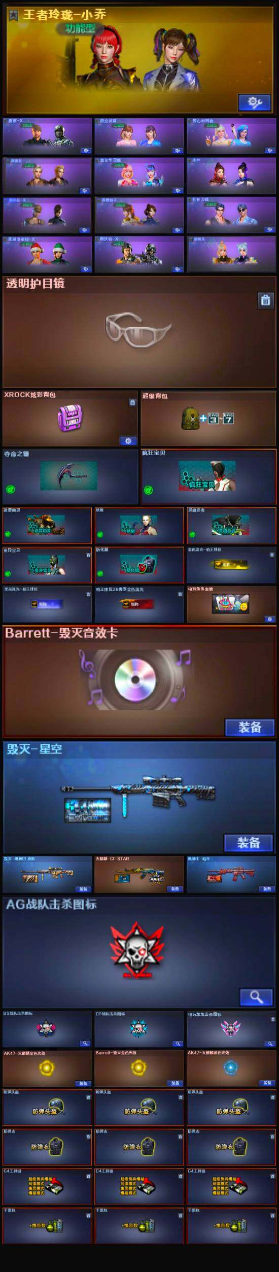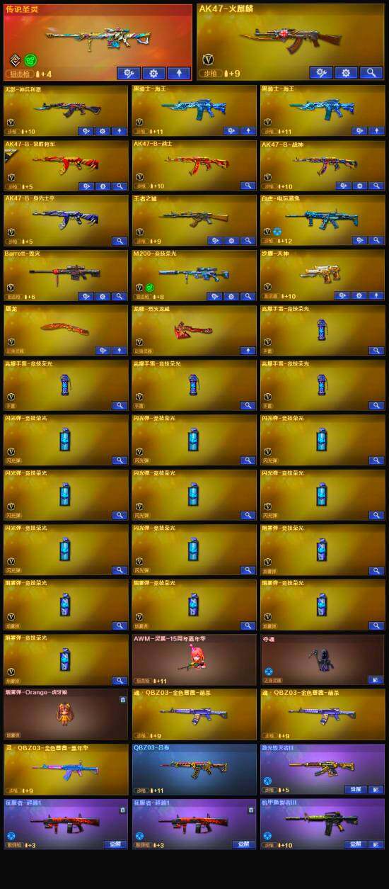【英雄级武器】:M200-竞技荣光,高爆手雷-竞技荣光*4,烟雾弹-竞技荣光*5,闪光弹-竞技荣光*8,白虎-电玩蓝兔,无影-神兵利器,AK47-火麒麟,Barrett-毁灭,黑骑士-海王*2,AK-47-猩红传说*2,AK47-B-战神,AK47-B-常胜将军,沙鹰-天神,屠龙