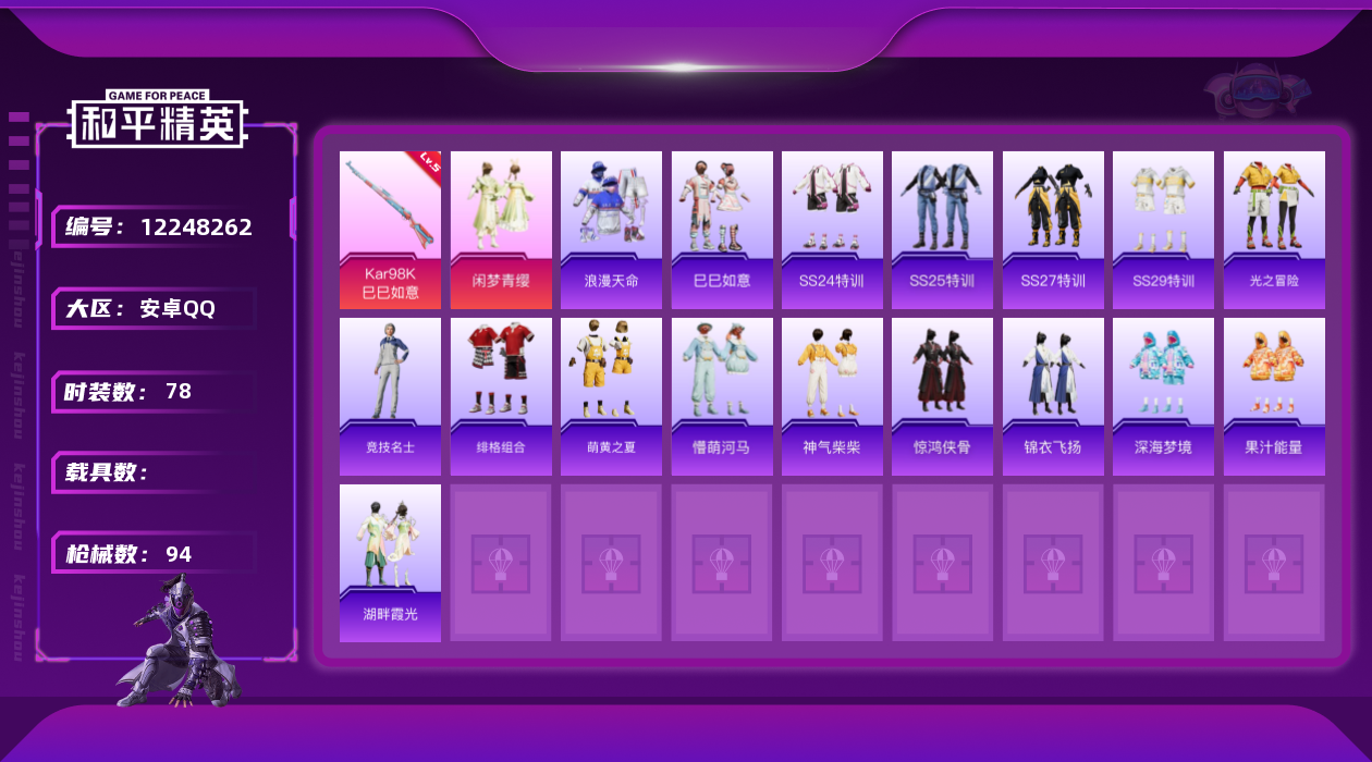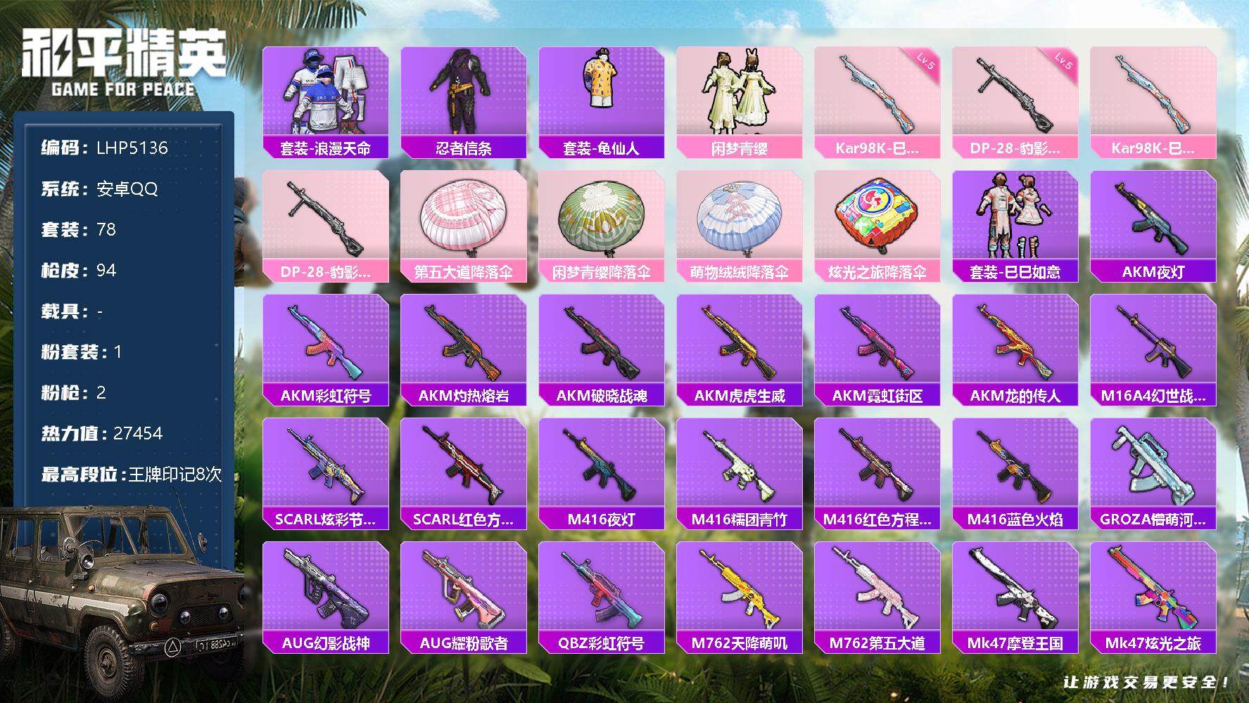 [12248262]地铁满天赋【特价急出/详情看图】:安卓 手Q-1粉装-2特效枪-2.7w热力值-8王牌印记-78套装-94枪皮【热门品类】:套装-浪漫天命,套装-忍者信条,套装-龟仙人【粉色套装】:粉装-闲梦青缨【粉色枪皮等级】:Kar98K-巳巳如意(五级),DP-28-豹影疾电(五级)
