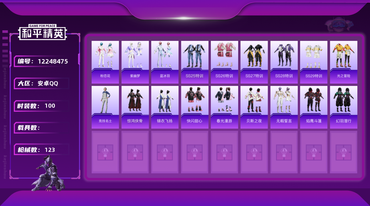 - [11883713]1红装 3粉装 5特效枪 8印记 可二次 可修改实名 优质装备:二级墨龙九天-敖渊(2级敖渊2级野人),墨龙九天-敖渊(野人),MG3梦幻舞会,AKM绿萝繁花,SCAR-L-锦绣绵绵,七级MG3-梦幻舞会,M416电玩时刻,M416墨龙九天 热门装扮:第五大道,繁龙极客,烟云彩露 五级特效枪:五级M416-电玩时刻,五级SCAR-L-锦绣绵绵,五级AKM-绿萝繁花 三级特效枪:三级M416-墨龙九天 紫色装扮:SS22特训,莱茵河畔,SS23特训,娇憨猪猪,萌趣咩咩,SS21特训,SS33特训套装,青涩时光,灵公主,SS20特训,SS15特训,SS14特训,都市漫游者,长空猛禽,霓虹街区,蓝色守护者,蓝色运动,魅力单车,鹤鸣,麻辣教官,龙的传人,龟仙人,柠萌假日,海岛探路者,涂山之恋,幻世战舞者,白熊同盟,破蛋小黄鸡,空岛之星,SS28特训,玉兔迎春,竞技名士,情公主,惊鸿侠骨,神气柴柴,懵萌河马,SS24特训(SS24特训套装),SS25特训,锦衣飞扬,焰鹰斗篷,幻羽潜行,幽夜迷踪,SS27特训,无暇誓言,华灯初上,SS26特训,春光漫游,快闪甜心,绯格组合,萌黄之夏 优质战备:墨龙九天降落伞,龙翔九天飞行器,江南烟雨降落伞,莲影清波降落伞,镜域双华降落伞,镜域双华-灵镜之阶,环太平洋降落伞,飒粉甜心降落伞,银刃赛罗降落伞