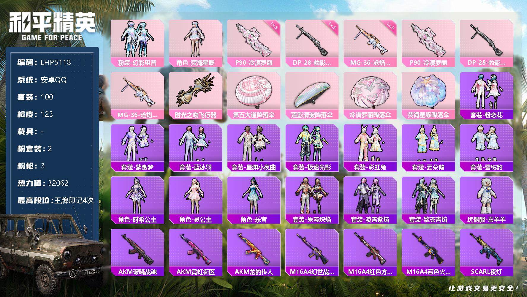 - PX_2088840- 可二次 安卓手Q-4王牌印记-4粉装-5特效枪-0载具-37278热力值-80套装-134枪皮-2卓越印记-0传奇印记, 【4粉装】,闲梦青缨,岚岚物语,青空秋雨,烟云彩露, 【5特效枪】,M416-电玩时刻-5级,Kar98K-巳巳如意-5级,Vector-环太平洋-7级,Vector-飒粉甜心-1级,汤姆逊-怪笑疯兔-5级, 【2稀有紫装】,浪漫天命,龟仙人, 【80稀