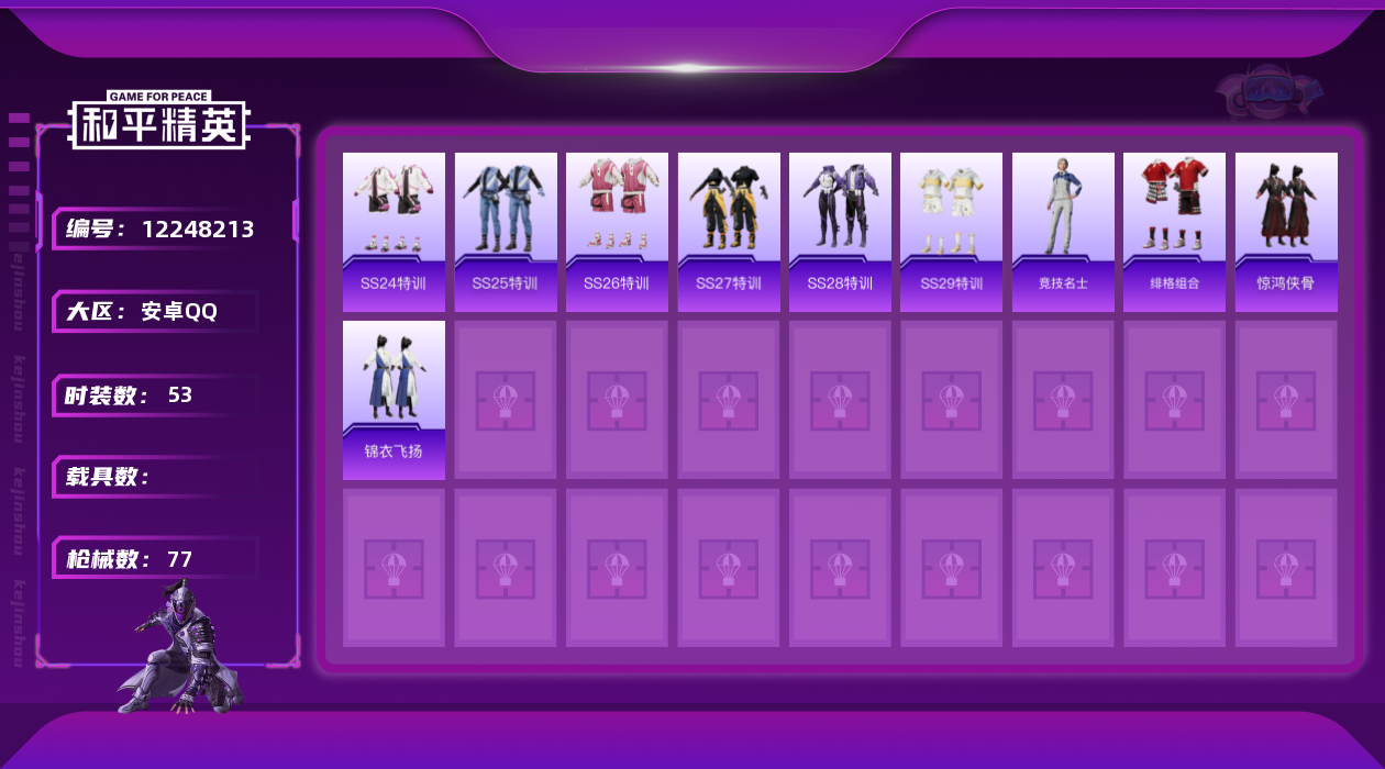 - PX_2085658- 安卓手Q-12王牌印记-有战神框-12粉装-8特效枪-1载具-91971热力值-212套装-276枪皮-4卓越印记-3传奇印记 【12粉装】,宝贝奶油派,缤纷油彩,洛天依,智耀战神,木曜青龙,复仇流浪者,猩猩队长,星云暗核,宙之时溯,天禅智恒,未来歌姬,瑰丽时代 【8特效枪】AKM-星际浪客-5级 SCAR-L-万古烈焰-6级 M416-风花雪月-7级 Kar98K-巳巳如