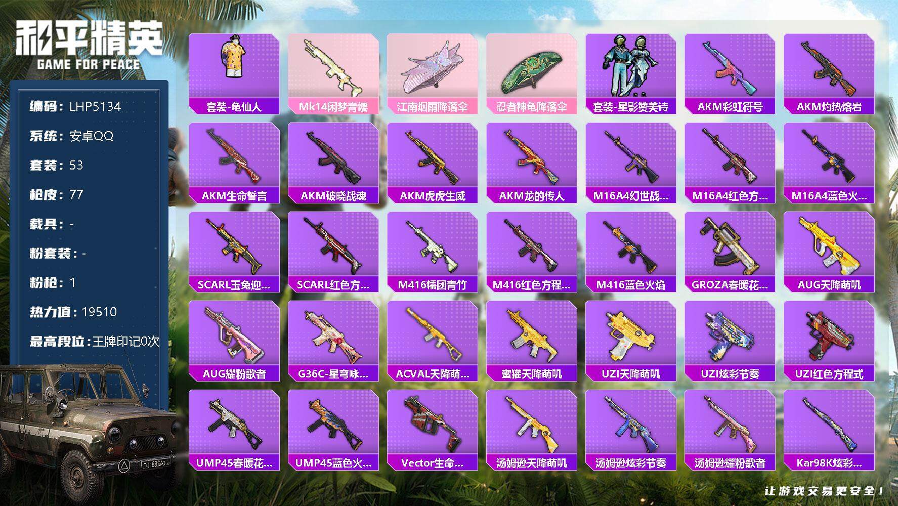 [12248213]【特价急出/详情看图】:安卓 手Q-1特效枪-1.9w热力值-1王牌印记-53套装-77枪皮【热门品类】:套装-龟仙人