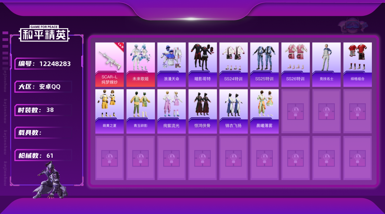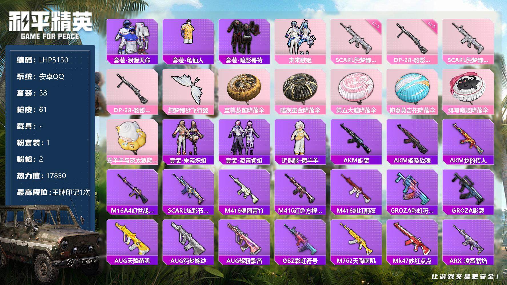 [12248283]【特价急出/详情看图】:安卓 手Q-1粉装-2特效枪-1粉色飞行器-1.7w热力值-1王牌印记-38套装-61枪皮【热门品类】:套装-浪漫天命,套装-龟仙人,套装-暗影哥特【粉色套装】:粉装-未来歌姬【粉色枪皮等级】:SCAR-L-纯梦嫁纱(五级),DP-28-豹影疾电(三级)【粉色飞行器】:纯梦嫁纱飞行翼
