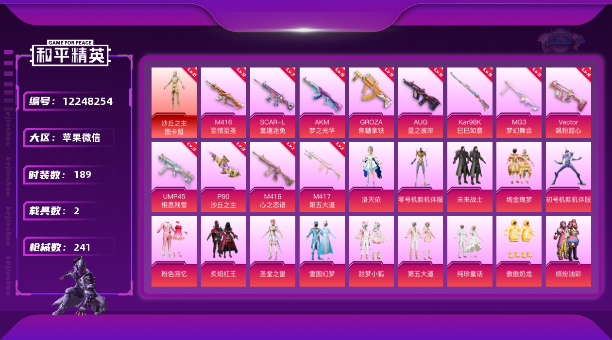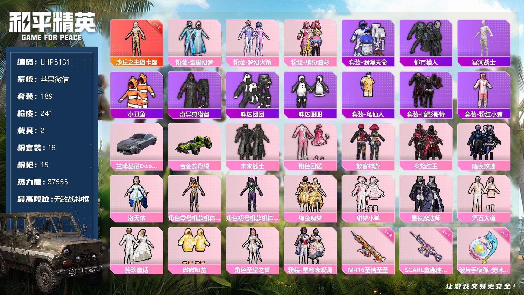 - [11819157]15粉装 15特效枪 1载具 6印记 可二次 可修改实名 身法装备:暗影哥特(红眼罩) 优质装备:玛莎拉蒂Quattroporte(夜幕蓝),M416五爪金龙,奇异狩猎者,梦幻火箭(新101)(新火箭少女101粉色套装),金属狂野,苍蓝魅影,AKM梦之光华,AUG超新星,SCAR-L-锦绣绵绵,M24镜域双华,PKM江南烟雨,七级AKM-梦之光华,Mk14精灵梦叶罗丽,Kar98K创世·救赎,UMP45-宇宙意志,SCAR-L-时空协奏,未来领航者,DP-28-千金淑猫,千金淑猫,GROZA-镜光银凌,SVD-月影灵韵,月影灵韵,AUG-暖羊咩咩,Kar98K-巳巳如意 热门装扮:炙焰赤龙,飓风飞鹰,旋转彩虹,呆萌星弥,镜光幻境,圣堂之誓,电波星,星空武士,创世·救赎,激萌罗小黑,浪漫波比 六级特效枪:六级M416-五爪金龙 五级特效枪:五级Mk14-精灵梦叶罗丽,五级Kar98K-巳巳如意,五级AUG-暖羊咩咩,五级SCAR-L-锦绣绵绵 四级特效枪:四级DP-28-千金淑猫,四级GROZA-镜光银凌,四级SVD-月影灵韵,四级Kar98K-创世·救赎,四级AUG-超新星 三级特效枪:三级SCAR-L-时空协奏,三级UMP45-宇宙意志,三级M24-镜域双华 二级特效枪:二级PKM-江南烟雨 紫色装扮:田园牧歌,轻风白浪,SS22特训,SS23特训,SS21特训,SS31特训套装,六六大吉,冷焰舞者,千禧之恋,SS30特训套装,SS20特训,梦起落英,青春冒险家,潮流游乐家,SS15特训,暗夜傀儡,梨园星光,暴风机械师,SS16特训,星河入梦,星梦畅游,治愈之星,科技之星,SS14特训,萌趣颜团子,微雨春柳,暖风夏荷,飞驰魅影,音速流光,SS19特训,薰款战斗服,瑞龙福将,团圆交子,醒狮腾龙,SS17特训,SS18特训,长空猛禽,霓虹街区,缤纷果语,街头潮人,骑行爱好者,魅力单车,黄色名流,龟仙人,童心宝龙,冰河战士,龙魂突击队,蝶变,香桃花海,沙漠毒蛇,活力之心,夏日倾情,夏日音浪,战地菁英,绮丽涂鸦,白色伏地魔,福星高照,空岛之星,空投萌叽,竞技达人朋克,炫蓝之夏,牛气满满,狂沙舞者,粉日山川,小熊娃娃,雏菊兔兔,萝兰蝴蝶,SS29特训,湖畔霞光,星途旅人,白光莹,纯真浪花,热情海星,曼妙人鱼,SS28特训,迎夏光舞,听雨铃兰,火种守护者(套装-火种守