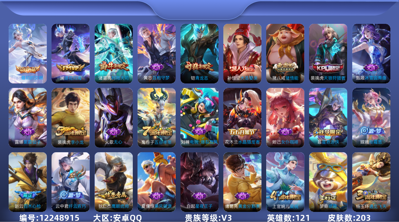 [12248915]【特价急出/详情看图】:安卓Q-V3-永恒钻石II段位-121英雄-203皮肤-1典藏-2传说-51史诗