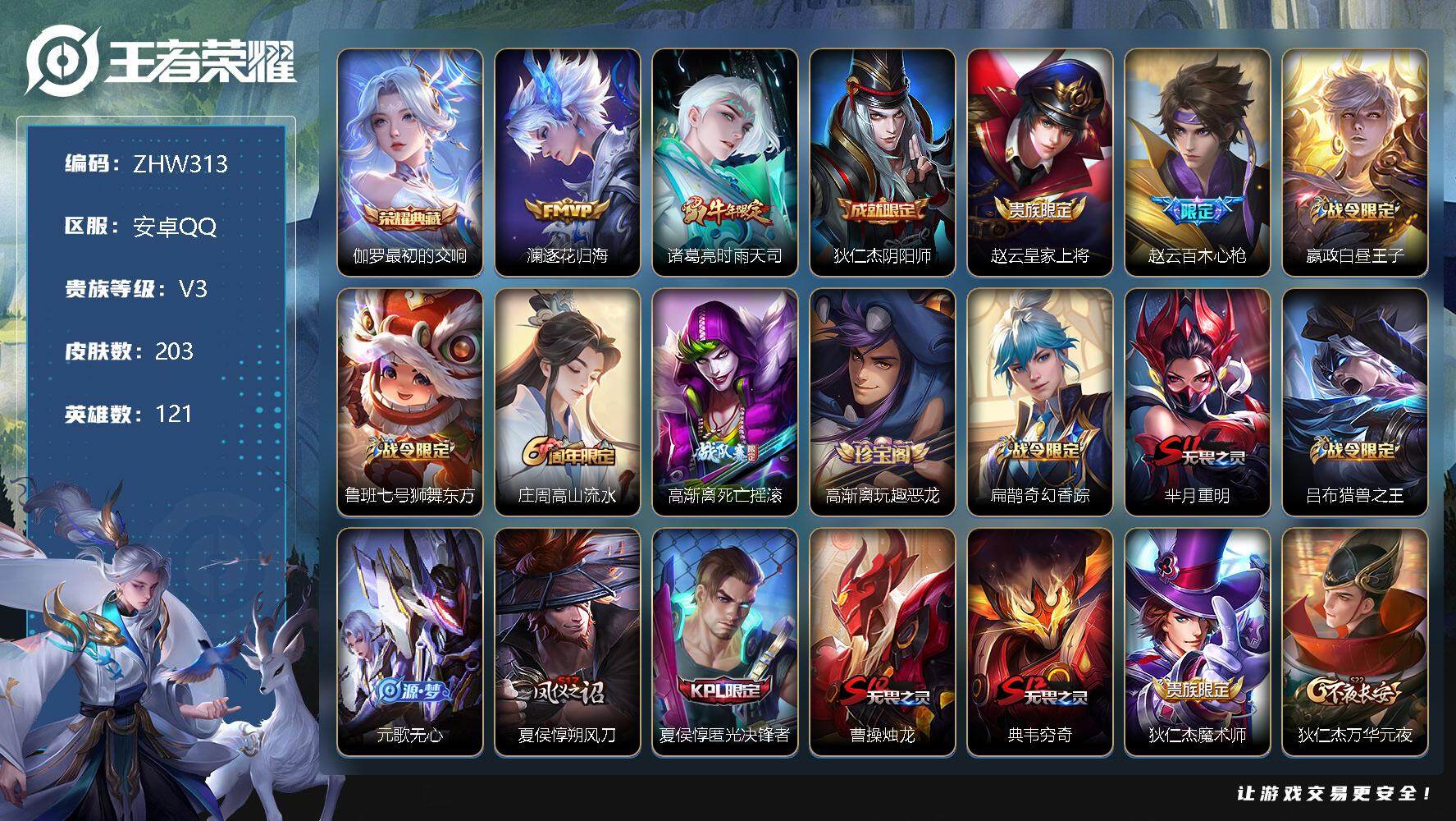 [12248915]【特价急出/详情看图】:安卓Q-V3-永恒钻石II段位-121英雄-203皮肤-1典藏-2传说-51史诗 【荣耀典藏】:伽罗最初的交响 【传说皮肤】:澜逐花归海,诸葛亮时雨天司 【限定皮肤】:狄仁杰阴阳师,赵云皇家上将,赵云百木心枪,嬴政白昼王子,鲁班七号狮舞东方,庄周高山流水,高渐离死亡摇滚,高渐离玩趣恶龙,扁鹊奇幻香踪,芈月重明,吕布猎兽之王,元歌无心,夏侯惇朔风刀,夏侯惇匿光决锋者,曹操烛龙,典韦穷奇,狄仁杰魔术师,狄仁杰万华元夜,达摩沙漠行僧,项羽海滩派对,老夫子醍醐杖,程咬金演武夺筹,兰陵王金庭之子,孙悟空大圣娶亲,牛魔御旌,李元芳云中旅人,钟馗神迹守卫,钟馗驱傩正仪,杨玉环遇见飞天,杨戬潮玩骑兵,雅典娜黎明之约,蔡文姬繁星吟游,太乙真人饕餮,太乙真人华丽摇滚,鬼谷子原初探秘者,鬼谷子五谷丰年,诸葛亮时雨天司,铠青龙志,苏烈千军破阵,百里玄策原初追逐者,弈星混沌棋,梦奇顽趣,沈梦溪大漠名商,明世隐疑决卦,裴擒虎天狼狩猎者,裴擒虎李小龙,裴擒虎擒涛扼浪,狂铁御狮,米莱狄御霄,云中君纤云弄巧,盾山御銮,猪八戒猪悟能,上官婉儿梁祝,嫦娥拒霜思,嫦娥暖冬兔眠,鲁班大师探海日志,桑启海盐诗旅,暃星界游侠,艾琳女武神,阿古朵江河有灵,张良古海寻踪,鬼谷子天穹祈灯,沈梦溪龙舞盛年,刘邦剑破天穹 【年限皮肤】:铠青龙志,诸葛亮时雨天司 【赛季限定】:芈月重明,夏侯惇朔风刀,曹操烛龙,典韦穷奇,狄仁杰万华元夜,达摩沙漠行僧,老夫子醍醐杖,程咬金演武夺筹,兰陵王金庭之子,张良古海寻踪,牛魔御旌,李元芳云中旅人,钟馗驱傩正仪,雅典娜黎明之约,太乙真人饕餮,鬼谷子原初探秘者,苏烈千军破阵,百里玄策原初追逐者,弈星混沌棋,梦奇顽趣,沈梦溪大漠名商,明世隐疑决卦,裴擒虎擒涛扼浪,狂铁御狮,米莱狄御霄,盾山御銮,鲁班大师探海日志,桑启海盐诗旅,鬼谷子天穹祈灯,刘邦剑破天穹 【战令限定】:嬴政白昼王子,鲁班七号狮舞东方,扁鹊奇幻香踪,吕布猎兽之王,钟馗神迹守卫,杨戬潮玩骑兵,嫦娥暖冬兔眠,暃星界游侠 【史诗皮肤】:露娜紫霞仙子,赵云皇家上将,赵云未来纪元,貂蝉圣诞恋歌,甄姬冰雪圆舞曲,王昭君偶像歌手,狄仁杰魔术师,廉颇地狱岩魂,宫本武藏鬼剑武藏,孙尚香水果甜心,嬴政暗夜贵公子,妲己女仆咖啡,墨子金属风暴,吕布圣诞狂欢,花木兰水晶猎龙者,刘邦德古拉伯爵,夏侯惇乘风破浪,小乔缤纷独角兽,兰