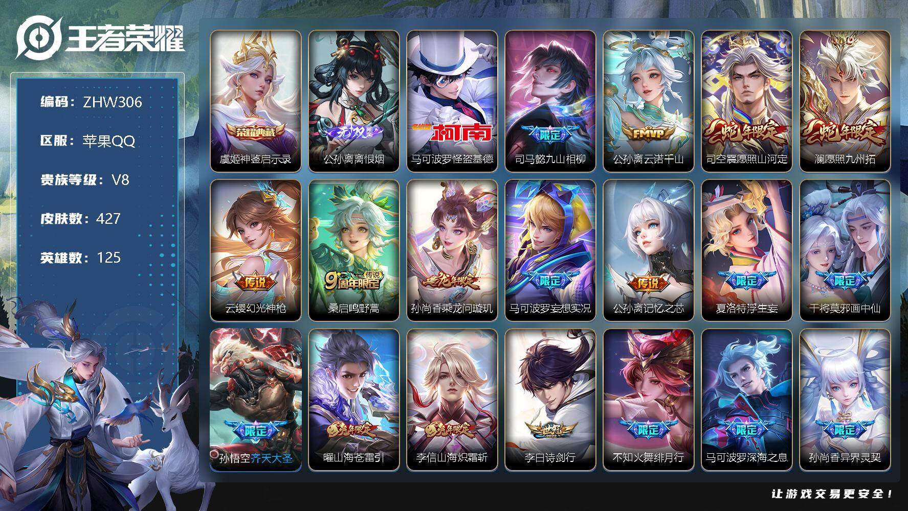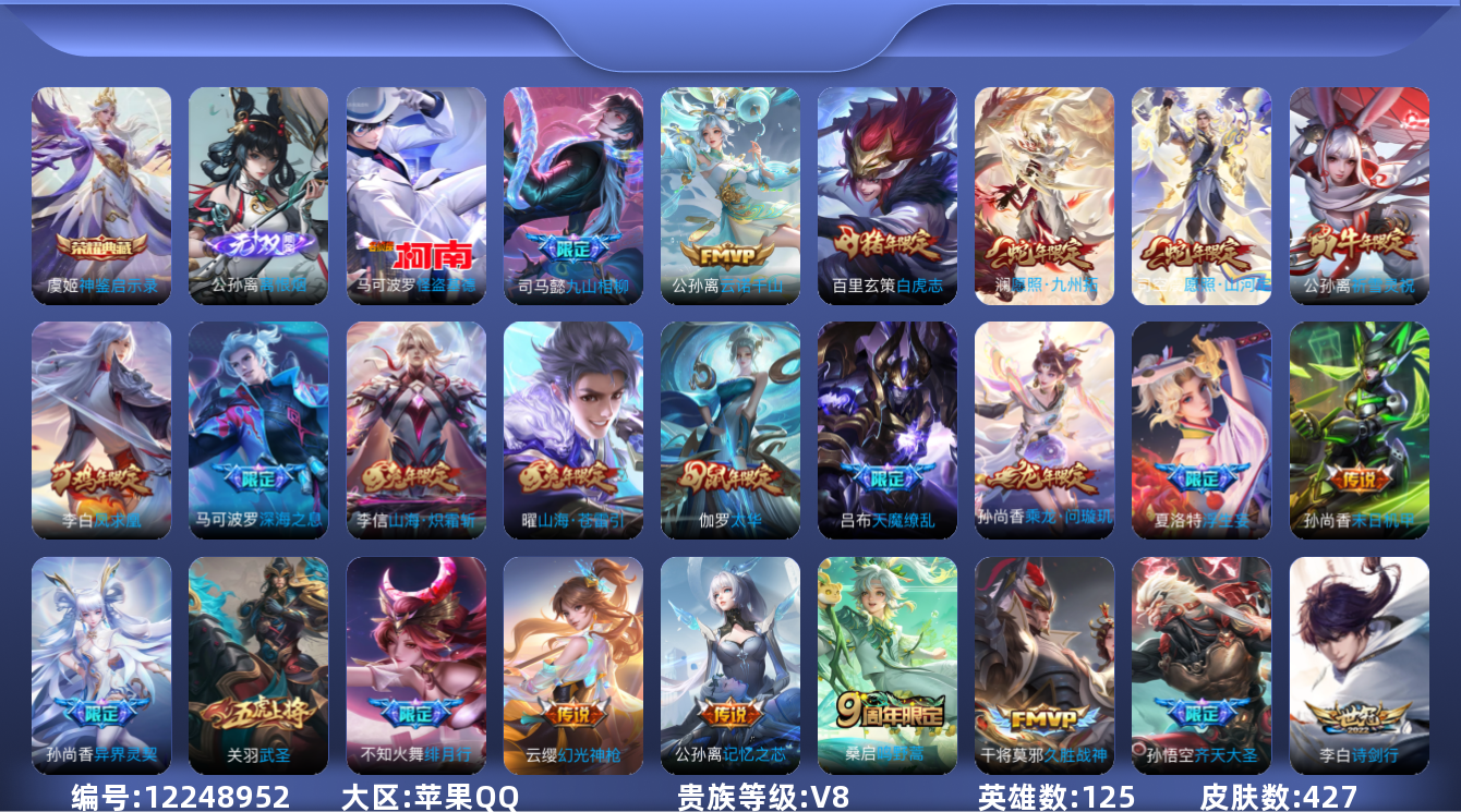[12248952]发育路52段/中路36段【特价急出/详情看图】:苹果Q-V8-至尊星耀III段位-125英雄-427皮肤-1典藏-1无双-1珍品传说-30传说-127史诗 【荣耀典藏】:虞姬神鉴启示录 【无双皮肤】:公孙离离恨烟 【珍品传说】:马可波罗怪盗基德 【传说皮肤】:司马懿九山相柳,公孙离云诺千山,司空震愿照山河定,澜愿照九州拓,云缨幻光神枪,桑启鸣野蒿,孙尚香乘龙问璇玑,马可波罗妄想实况,公孙离记忆之芯,夏洛特浮生妄,干将莫邪画中仙,孙悟空齐天大圣,曜山海苍雷引,李信山海炽霜斩,李白诗剑行,不知火舞绯月行,马可波罗深海之息,孙尚香异界灵契,李元芳飞鸢探春,公孙离祈雪灵祝,虞姬启明星使,孙悟空零号赤焰,关羽武圣,伽罗太华,貂蝉猫影幻舞,干将莫邪久胜战神,百里玄策白虎志,李白凤求凰,孙尚香末日机甲,吕布天魔缭乱 【限定皮肤】:白起狰,公孙离离恨烟,蒙犽顽岩魄,蔡文姬夏日便利店,大乔绒语心约,虞姬夏日便利店,姜子牙天穹之誓,杨戬破阵退雄兵,狄仁杰阴阳师,赵云皇家上将,赵云引擎之心,墨子神迹守卫,妲己时之彼端,嬴政白昼王子,孙尚香蔷薇恋人,孙尚香异界灵契,鲁班七号狮舞东方,庄周高山流水,高渐离死亡摇滚,高渐离玩趣恶龙,阿轲迷踪丽影,钟无艳超时空战士,扁鹊奇幻香踪,白起夜都怪侠,芈月重明,芈月幻夜卜梦,吕布天魔缭乱,吕布猎兽之王,周瑜赤莲之焰,元歌云间偶戏,元歌无心,夏侯惇朔风刀,甄姬游园惊梦,甄姬落雪兰心,曹操烛龙,典韦穷奇,马可波罗逐梦之星,马可波罗暗影游猎,马可波罗深海之息,马可波罗山海玄木吟,马可波罗妄想实况,狄仁杰魔术师,狄仁杰万华元夜,达摩星际陆战队,达摩沙漠行僧,项羽海滩派对,老夫子醍醐杖,老夫子航海奇遇记,关羽冰锋战神,关羽武圣,关羽百相守梦,程咬金演武夺筹,露娜一生所爱,刘邦夺宝奇兵,韩信飞衡,王昭君午后时光,兰陵王驯魔猎人,兰陵王金庭之子,不知火舞绯月行,亚瑟潮玩骑士王,孙悟空美猴王,孙悟空至尊宝,孙悟空大圣娶亲,孙悟空零号赤焰,孙悟空孙行者,孙悟空齐天大圣,牛魔御旌,后羿辉光之辰,后羿圣弓游侠,李元芳银河之约,李元芳云中旅人,虞姬霸王别姬,虞姬启明星使,钟馗神迹守卫,钟馗驱傩正仪,杨玉环遇见飞天,杨玉环寅虎心曲,杨戬潮玩骑兵,干将莫邪冰霜恋舞曲,干将莫邪真爱魔法,干将莫邪画中仙,雅典娜单词大作战,雅典娜黎明之约,蔡文姬繁星吟游,太乙真人华丽摇滚,鬼谷子原初探