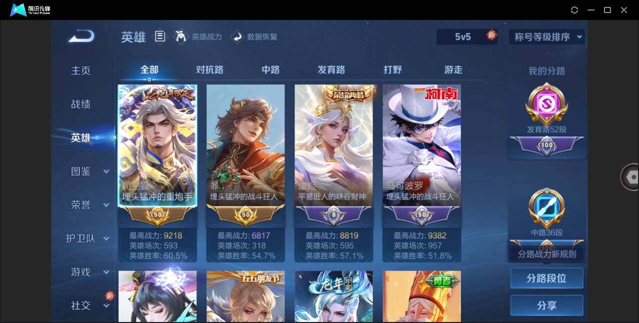 [12248952]发育路52段/中路36段【特价急出/详情看图】:苹果Q-V8-至尊星耀III段位-125英雄-427皮肤-1典藏-1无双-1珍品传说-30传说-127史诗