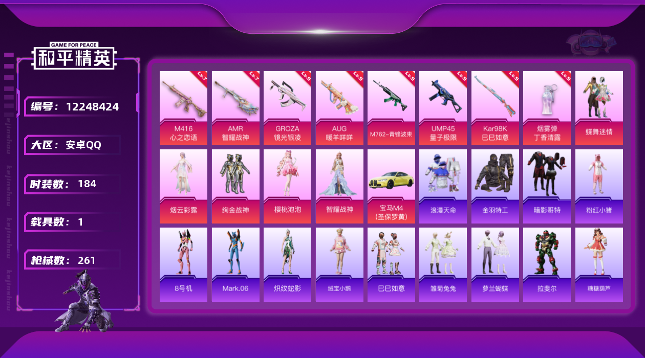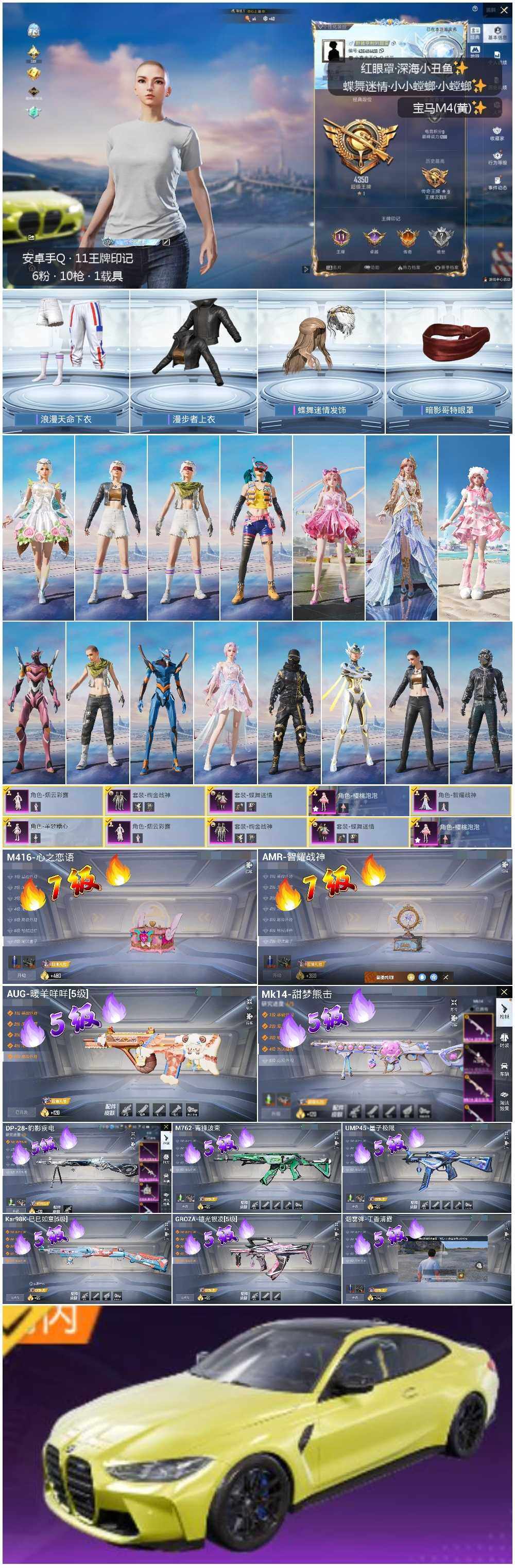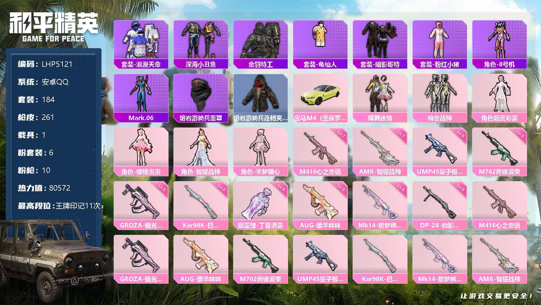 [12248424]地铁满天赋【特价急出/详情看图】:安卓 手Q-6粉装-10特效枪-1载具-8w热力值-11王牌印记-184套装-261枪皮【热门品类】:套装-浪漫天命,套装-深海小丑鱼,套装-金羽特工,套装-龟仙人,套装-暗影哥特,套装-粉红小猪,角色-8号机,角色-Mark.06,熔岩游骑兵面罩,熔岩游骑兵连帽夹克【粉色载具】:宝马M4(圣保罗黄)【粉色套装】:粉装-蝶舞迷情,粉装-绚金战神,角色-烟云彩露,角色-樱桃泡泡,角色-智耀战神,角色-羊梦糖心【粉色枪皮等级】:M416-心之恋语(七级),GROZA-镜光银凌(五级),AUG-暖羊咩咩(五级),M762-青锋波束(五级),UMP45-量子极限(五级),Kar98K-巳巳如意(五级),Mk14-甜梦熊击(五级),AMR-智耀战神(七级),DP-28-豹影疾电(五级),烟雾弹-丁香清露(五级)