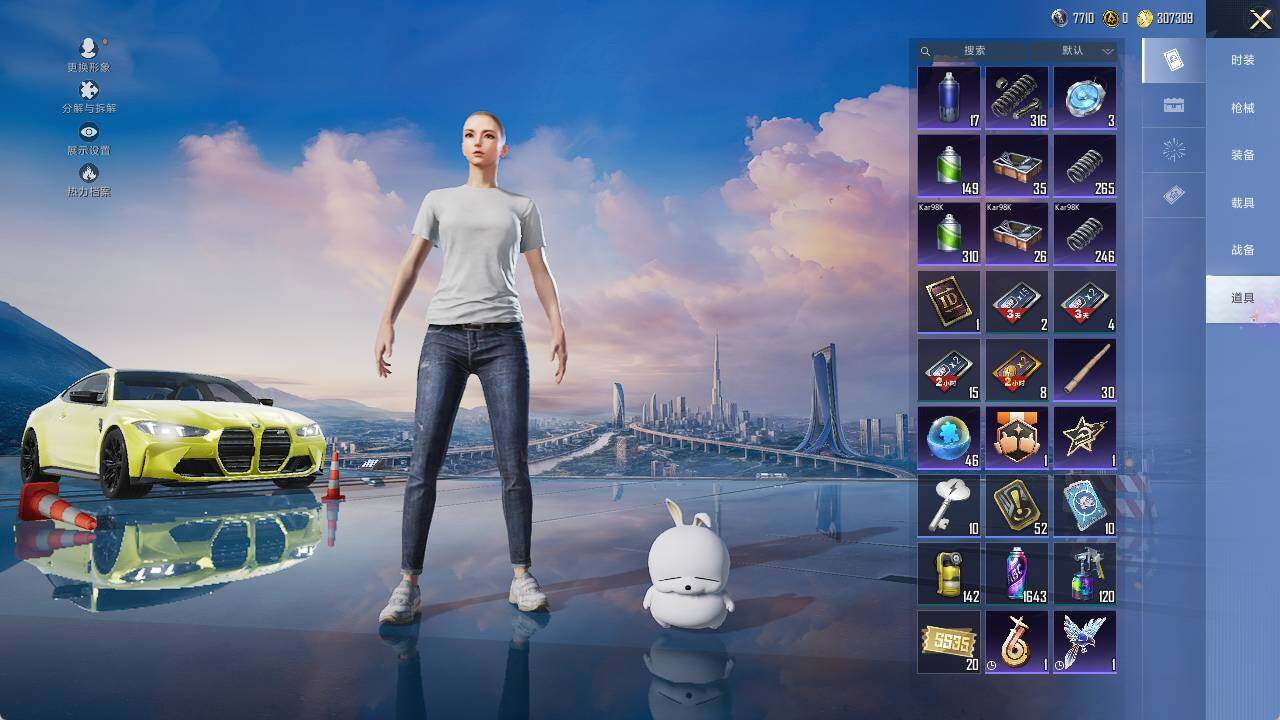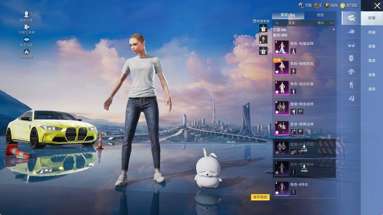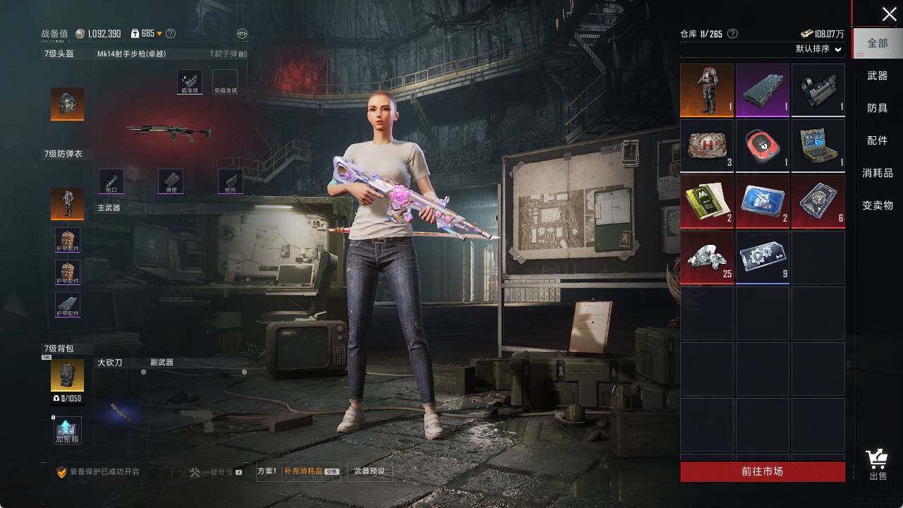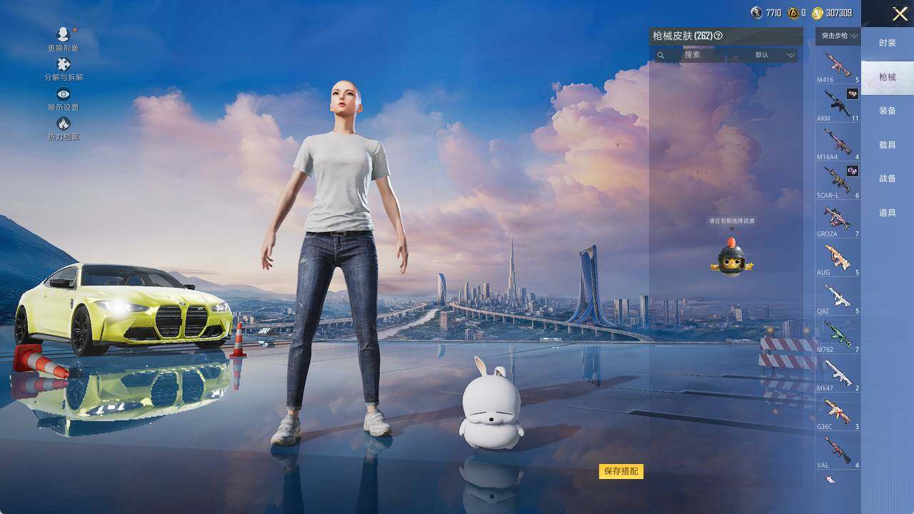 M416-心之恋语,GROZA-镜光银凌,AUG-暖羊咩咩,M762-青锋波束,UMP45-量子极限,Kar98K-巳巳如意,烟雾弹-丁香清露