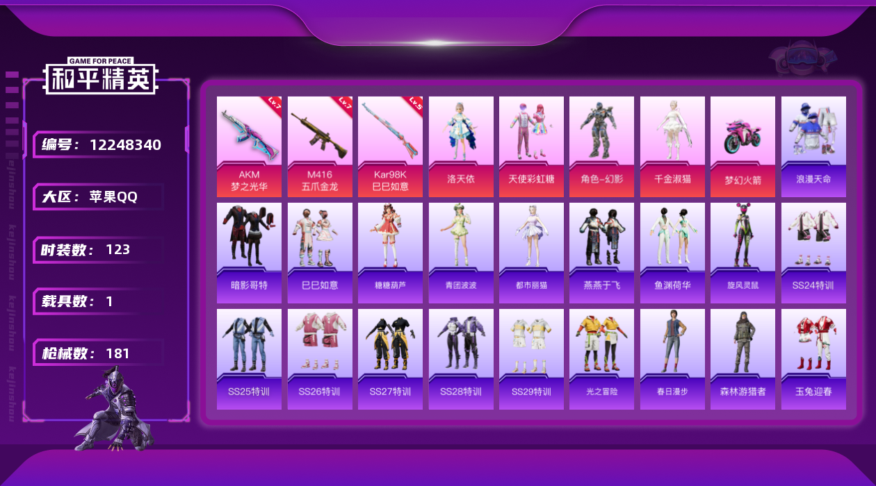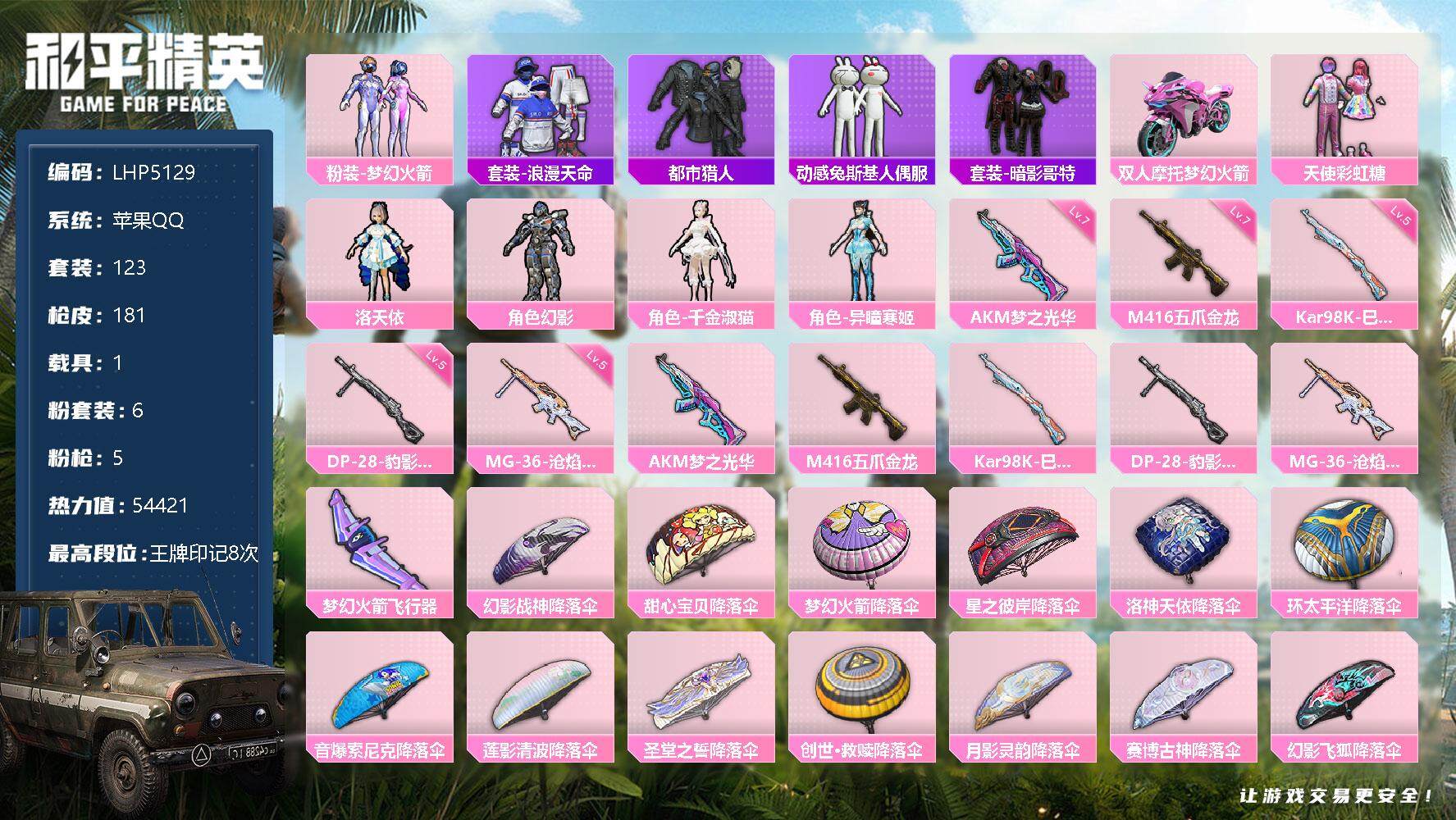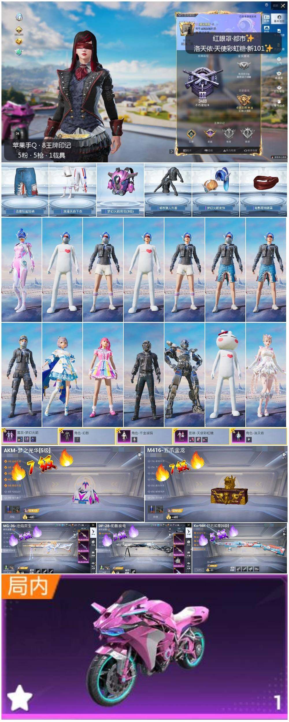 [12248340]素材身法号【特价急出/详情看图】:苹果 手Q-6粉装-5特效枪-1载具-1粉色飞行器-5.4w热力值-8王牌印记-123套装-181枪皮【热门品类】:粉装-梦幻火箭,套装-浪漫天命,套装-都市猎人,套装-动感兔斯基人偶服,套装-暗影哥特【粉色载具】:双人摩托-梦幻火箭【粉色套装】:粉装-天使彩虹糖,粉装-梦幻火箭,角色-洛天依,角色-幻影,角色-千金淑猫,角色-异瞳寒姬【粉色枪皮等级】:AKM-梦之光华(七级),M416-五爪金龙(七级),Kar98K-巳巳如意(五级),DP-28-豹影疾电(五级),MG-36-沧焰双生(五级)【粉色飞行器】:梦幻火箭飞行器