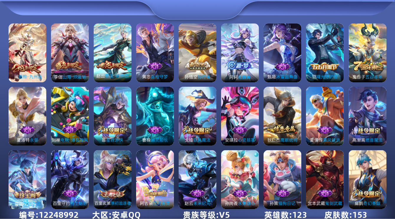 [12248992]【特价急出/详情看图】:安卓Q-V5-至尊星耀III段位-123英雄-153皮肤-3传说-34史诗