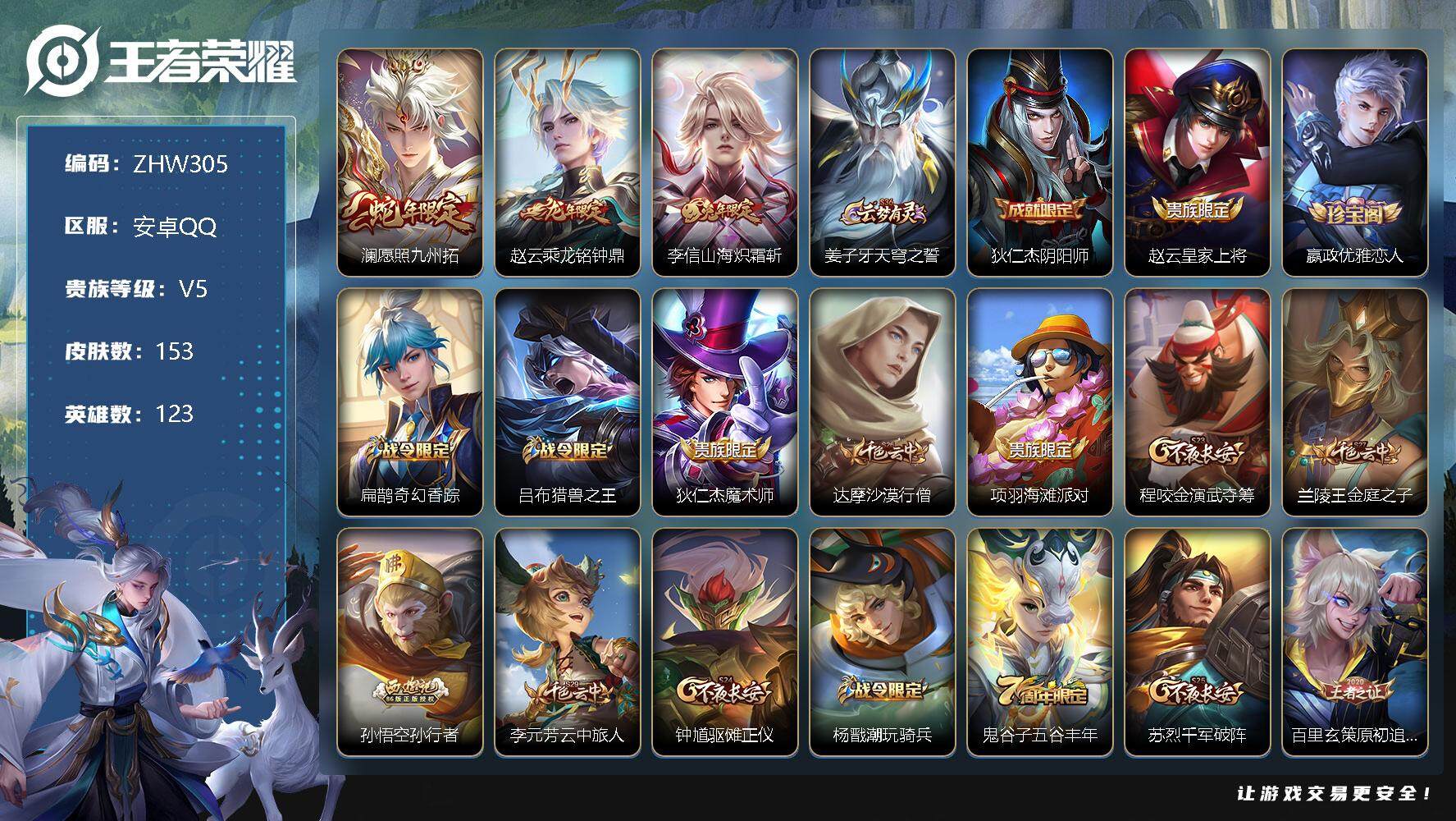 [12248992]【特价急出/详情看图】:安卓Q-V5-至尊星耀III段位-123英雄-153皮肤-3传说-34史诗 【传说皮肤】:澜愿照九州拓,赵云乘龙铭钟鼎,李信山海炽霜斩 【限定皮肤】:姜子牙天穹之誓,狄仁杰阴阳师,赵云皇家上将,嬴政优雅恋人,扁鹊奇幻香踪,吕布猎兽之王,狄仁杰魔术师,达摩沙漠行僧,项羽海滩派对,程咬金演武夺筹,兰陵王金庭之子,孙悟空孙行者,李元芳云中旅人,钟馗驱傩正仪,杨戬潮玩骑兵,鬼谷子五谷丰年,苏烈千军破阵,百里玄策原初追逐者,沈梦溪大漠名商,裴擒虎擒涛扼浪,李信山海炽霜斩,嫦娥暖冬兔眠,西施玲珑珍味,鲁班大师探海日志,桑启海盐诗旅,暃星界游侠,戈娅驭风魔法,阿古朵江河有灵,张良古海寻踪,高渐离燃音魔法,妲己灵卜魔法,鬼谷子天穹祈灯,赵云乘龙铭钟鼎,刘邦剑破天穹,程咬金群星魔术团,周瑜熔金海岸 【年限皮肤】:李信山海炽霜斩,赵云乘龙铭钟鼎 【赛季限定】:达摩沙漠行僧,程咬金演武夺筹,兰陵王金庭之子,张良古海寻踪,李元芳云中旅人,钟馗驱傩正仪,苏烈千军破阵,百里玄策原初追逐者,沈梦溪大漠名商,裴擒虎擒涛扼浪,鲁班大师探海日志,桑启海盐诗旅,鬼谷子天穹祈灯,刘邦剑破天穹,姜子牙天穹之誓 【战令限定】:扁鹊奇幻香踪,吕布猎兽之王,杨戬潮玩骑兵,嫦娥暖冬兔眠,西施玲珑珍味,暃星界游侠,戈娅驭风魔法,高渐离燃音魔法,妲己灵卜魔法 【史诗皮肤】:赵云皇家上将,赵云未来纪元,貂蝉圣诞恋歌,甄姬冰雪圆舞曲,王昭君偶像歌手,狄仁杰魔术师,宫本武藏鬼剑武藏,孙尚香水果甜心,嬴政优雅恋人,妲己魅力维加斯,刘禅绅士熊喵,曹操幽灵船长,张飞乱世虎臣,夏侯惇乘风破浪,安琪拉心灵骇客,百里守约特工魅影,铠曙光守护者,李元芳逐浪之夏,孙策猫狗日记,狄仁杰鹰眼统帅,百里玄策原初追逐者,孙悟空孙行者,夏洛特永昼,鬼谷子五谷丰年,暃星界游侠,扁鹊奇幻香踪,刘禅电玩爆裂旋风,戈娅驭风魔法,阿古朵江河有灵,妲己灵卜魔法,高渐离燃音魔法,孙膑茶境仙,弈星万物之道,阿轲化蝶舞,黄忠百相守梦 【其他皮肤】:项羽海滩派对,韩信教廷特使,露娜哥特玫瑰,赵云白执事,赵云忍炎影,芈月红桃皇后,白起白色死神,扁鹊救世之瞳,庄周鲤鱼之梦,安琪拉玩偶对对碰,妲己少女阿狸,典韦黄金武士,亚瑟死亡骑士,达摩拳王,花木兰兔女郎,刘备万事如意,宫本武藏万象初新,狄仁杰阴阳师,刘备汉昭烈帝,钟无艳海滩丽影,狂铁命运角斗场,老