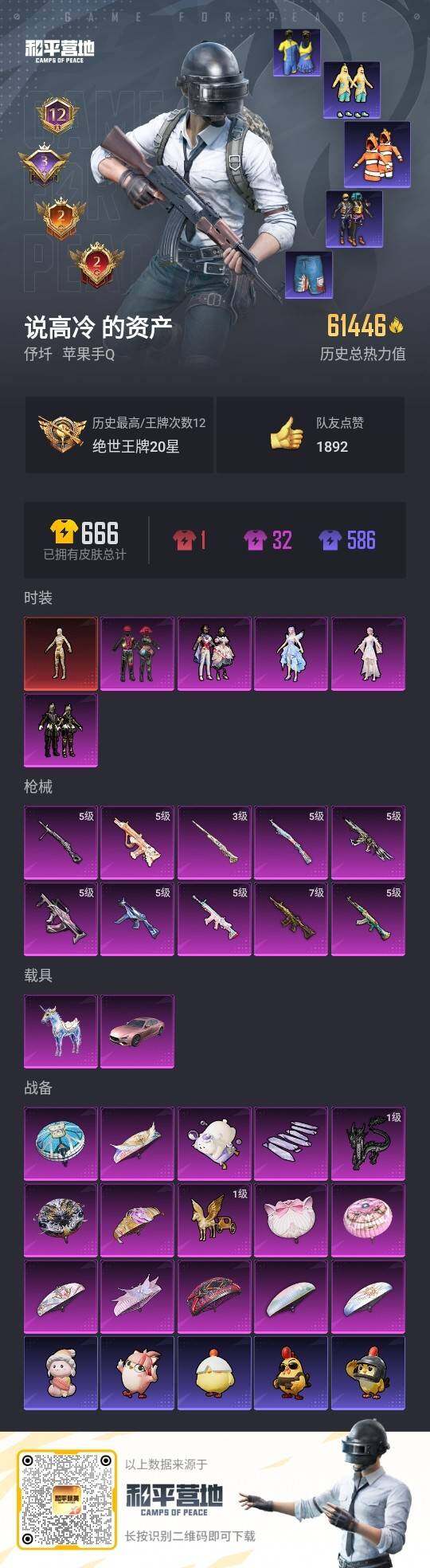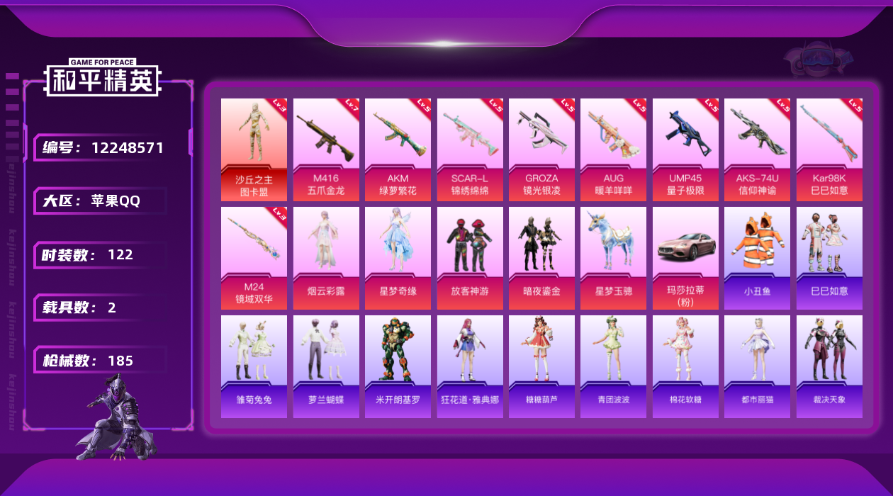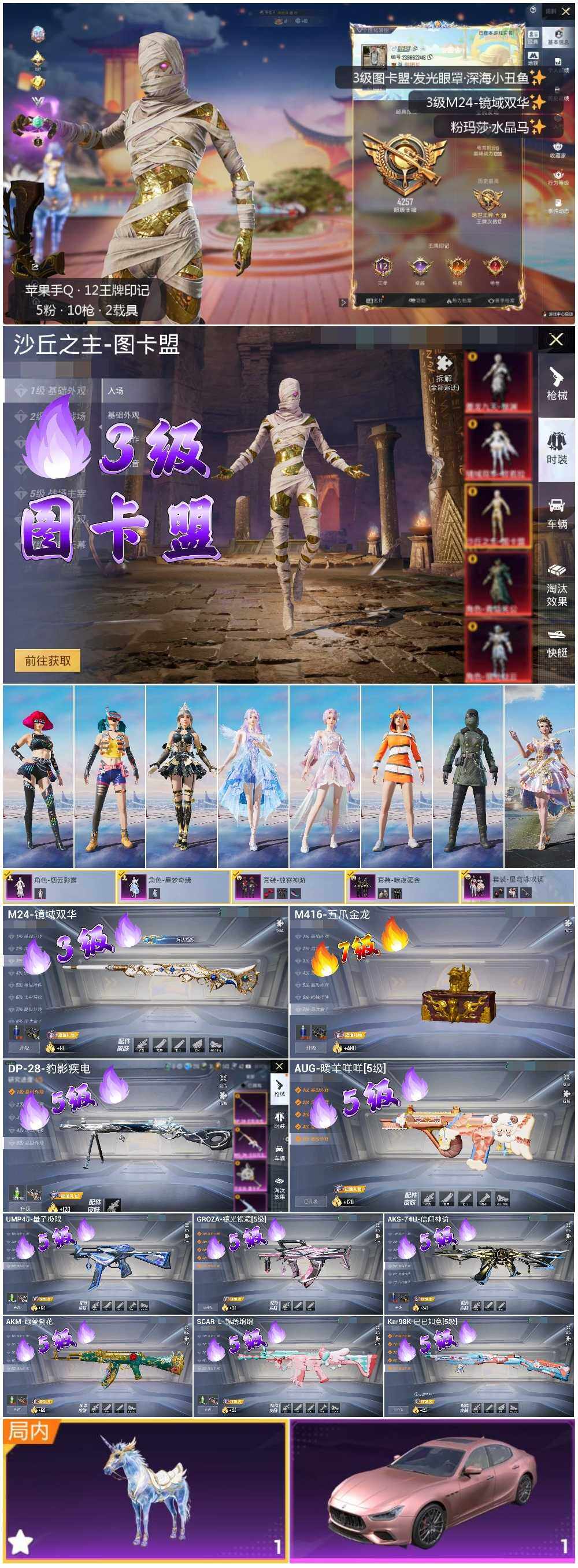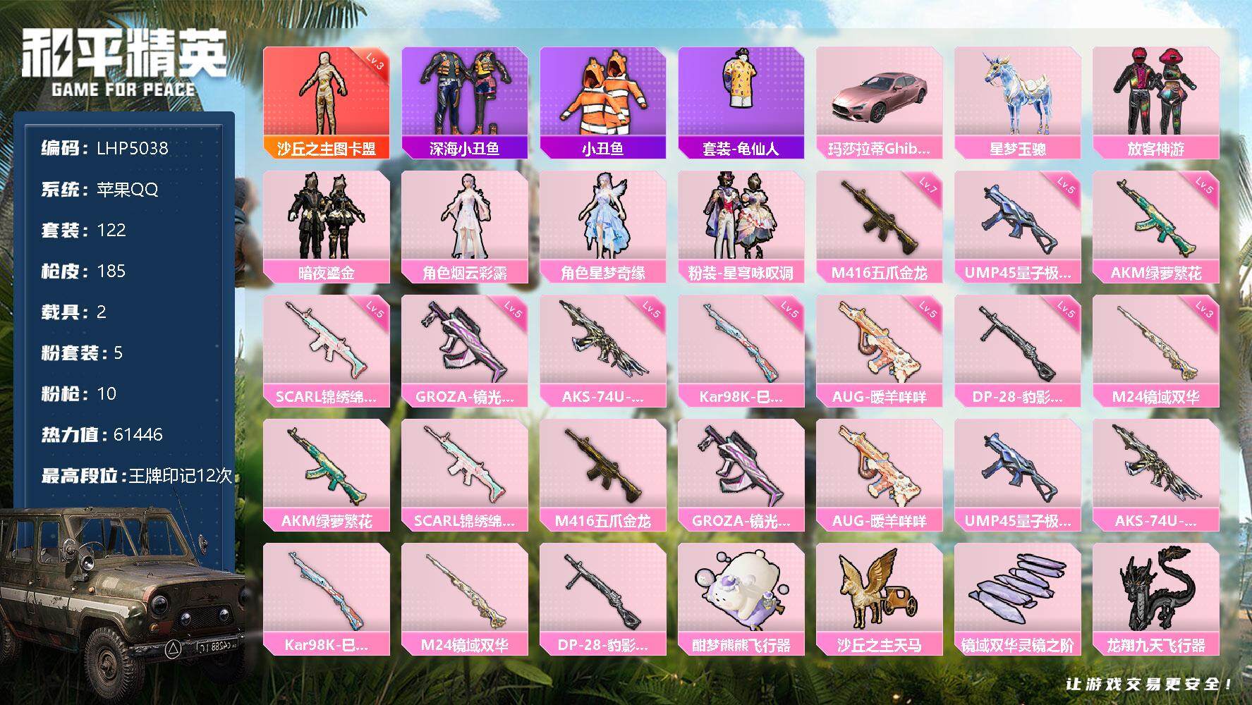 [12248571]素材身法号/绝世印记2【特价急出/详情看图】:苹果 手Q-1神装-5粉装-10特效枪-2载具-4粉色飞行器-6.1w热力值-12王牌印记-122套装-185枪皮【红色神装等级】:沙丘之主-图卡盟(三级)【热门品类】:套装-深海小丑鱼,套装-小丑鱼,套装-龟仙人【粉色载具】:玛莎拉蒂Ghibli(粉),星梦玉骢【粉色套装】:粉装-放客神游,粉装-暗夜鎏金,角色-烟云彩露,角色-星梦奇缘,粉装-星穹咏叹调【粉色枪皮等级】:AKM-绿萝繁花(五级),SCAR-L-锦绣绵绵(五级),M416-五爪金龙(七级),GROZA-镜光银凌(五级),AUG-暖羊咩咩(五级),UMP45-量子极限(五级),AKS-74U-信仰神谕(五级),Kar98K-巳巳如意(五级),M24-镜域双华(三级),DP-28-豹影疾电(五级)【粉色飞行器】:酣梦熊熊飞行器,沙丘之主天马,镜域双华-灵镜之阶,龙翔九天飞行器