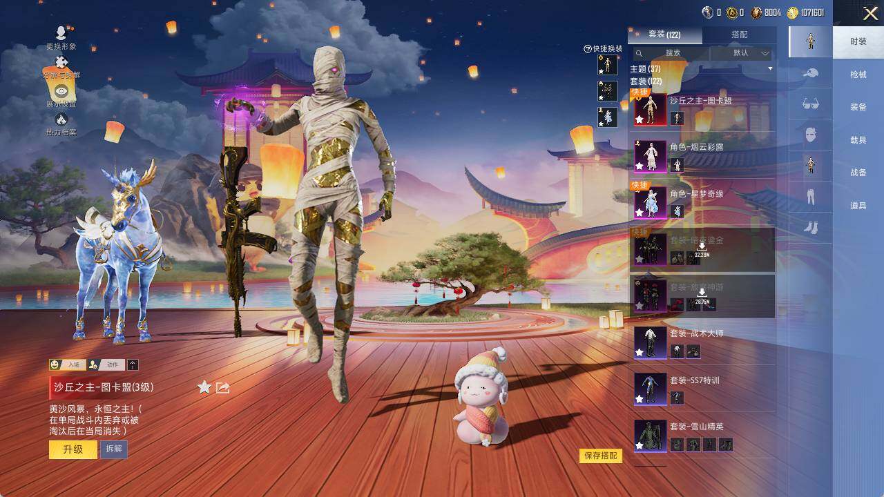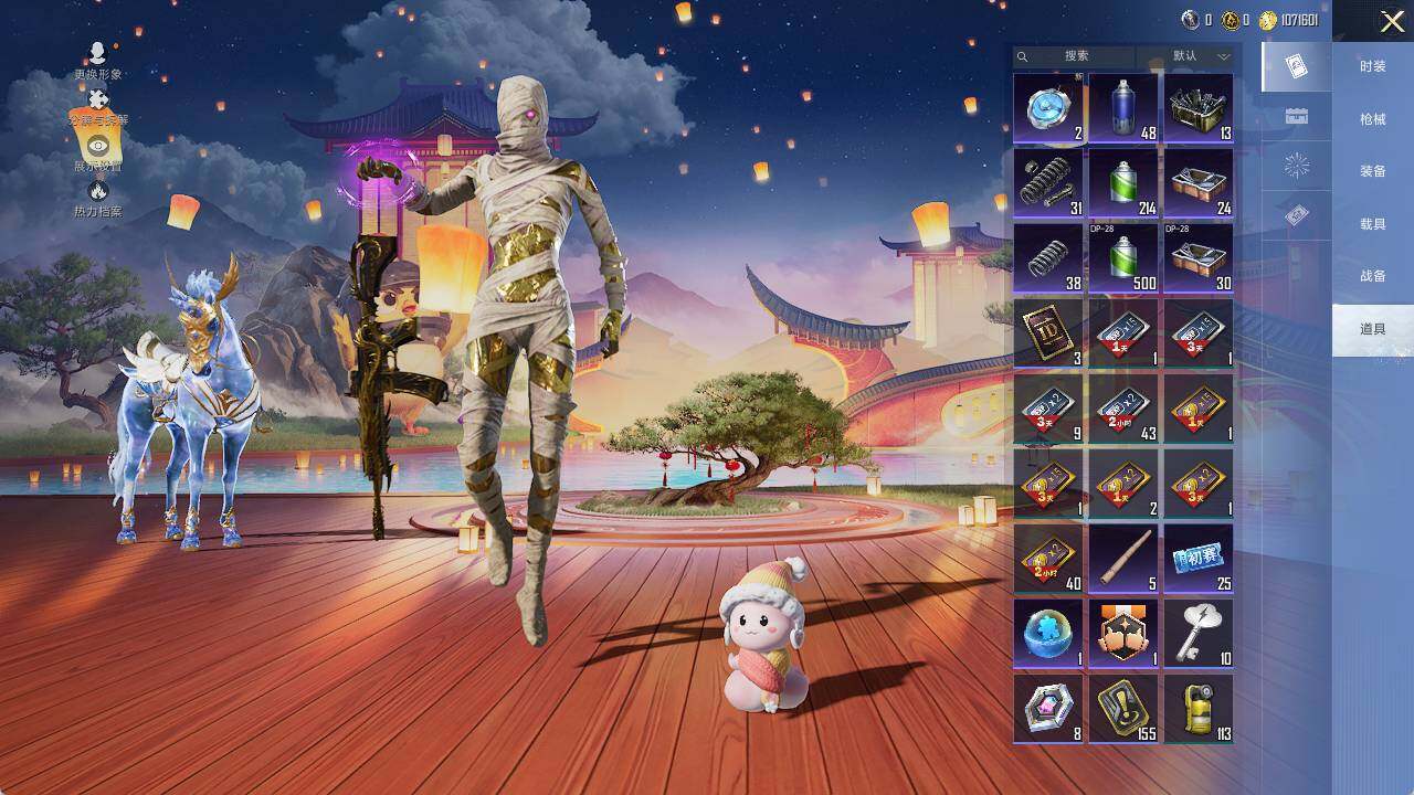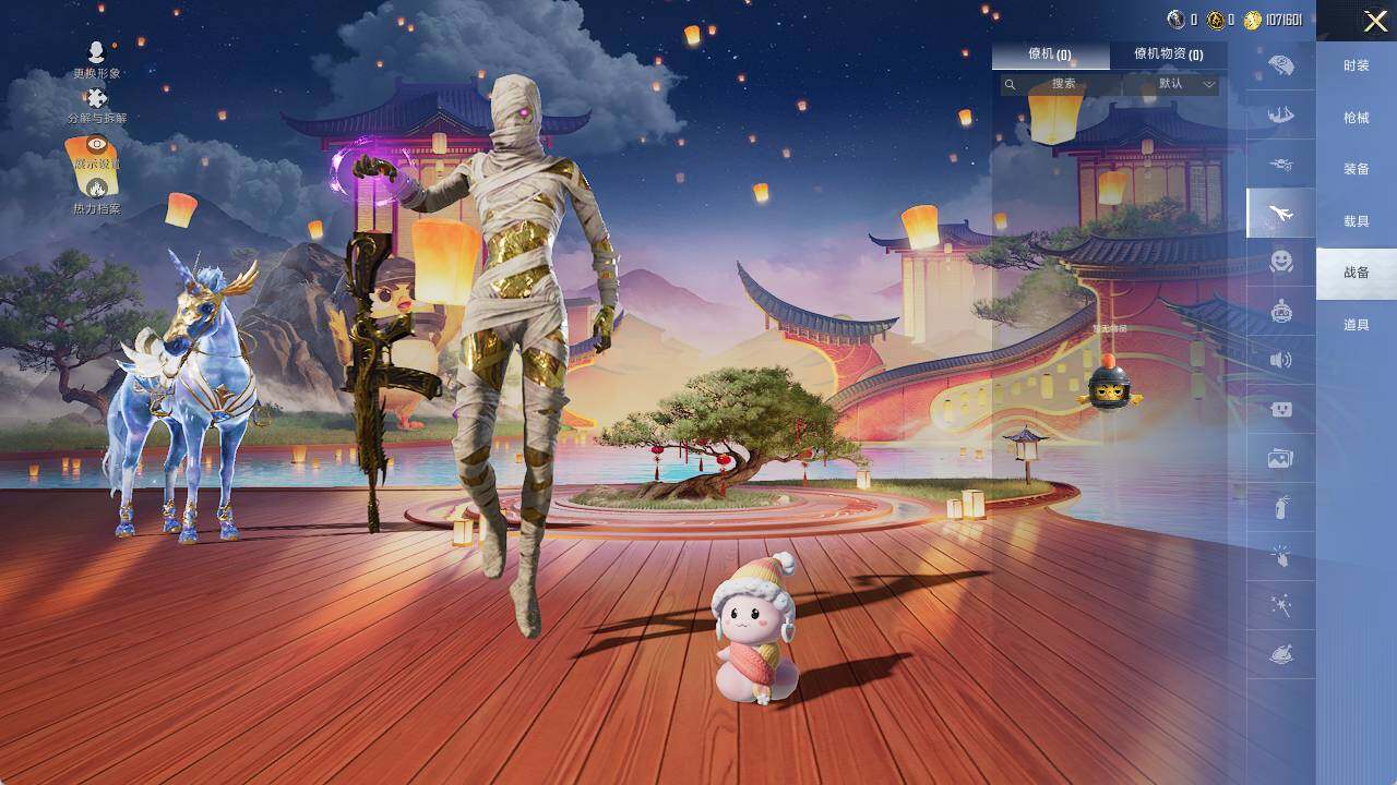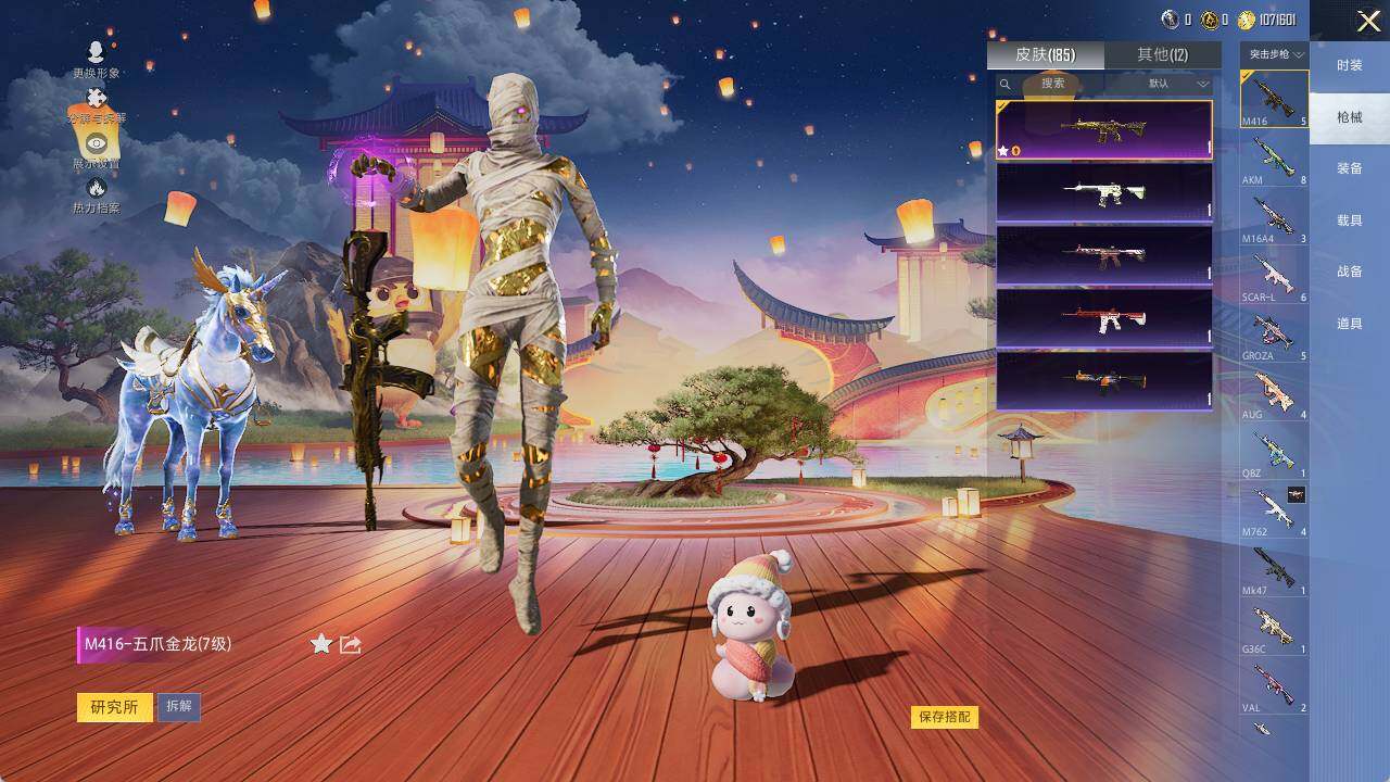 AKM-绿萝繁花,M416-五爪金龙,GROZA-镜光银凌,AUG-暖羊咩咩,UMP45-量子极限,AKS-74U-信仰神谕,Kar98K-巳巳如意,M24-镜域双华
