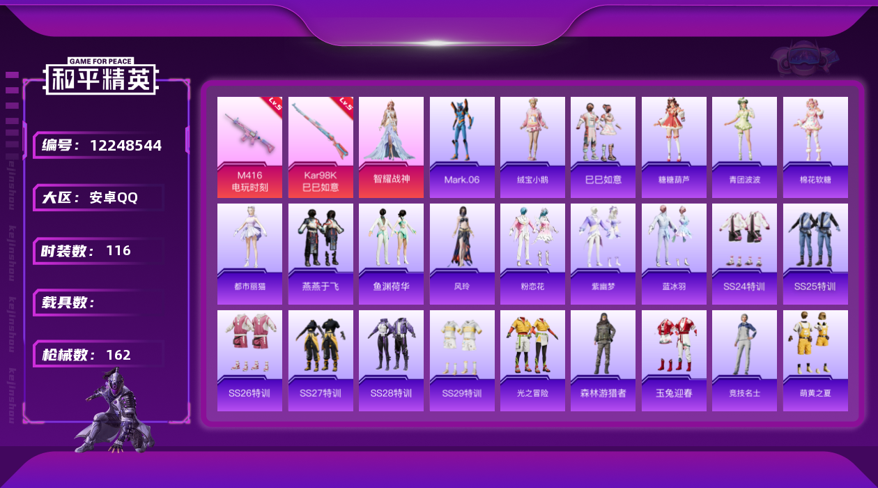 [12248544]【特价急出/详情看图】:安卓 手Q-1粉装-3特效枪-4.2w热力值-6王牌印记-116套装-162枪皮【热门品类】:套装-龟仙人,角色-Mark.06【粉色套装】:角色-智耀战神【粉色枪皮等级】:M416-电玩时刻(五级),Kar98K-巳巳如意(五级),镰刀-幽影之判(五级)