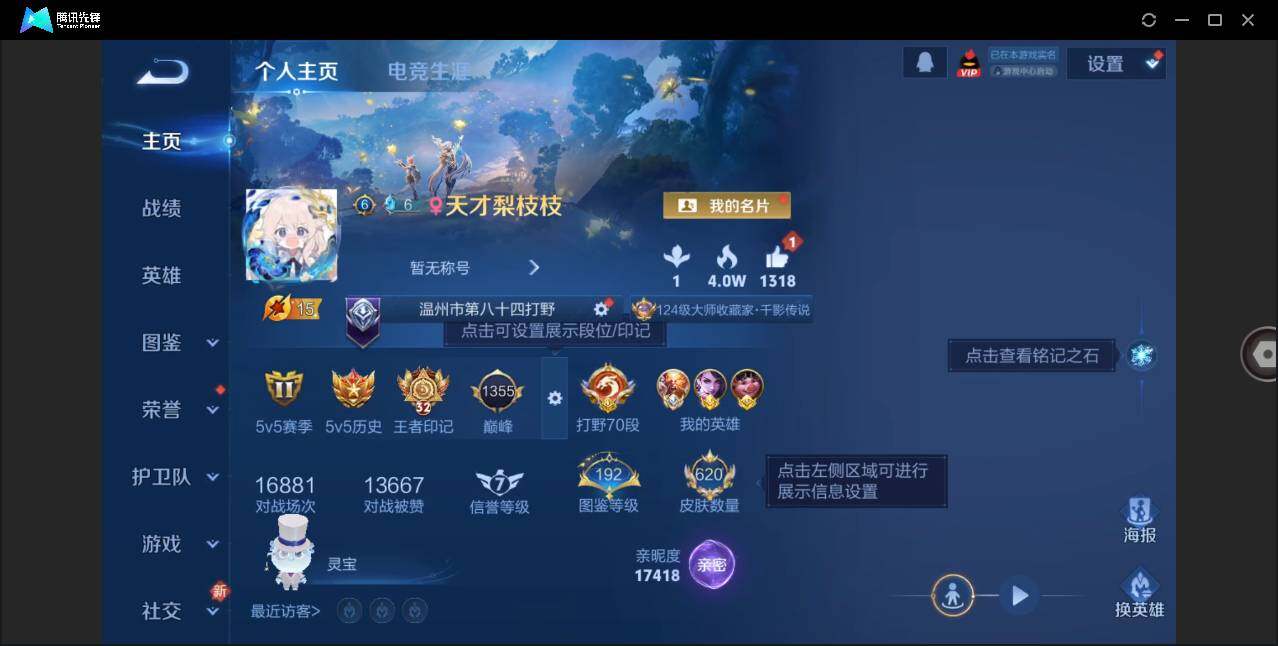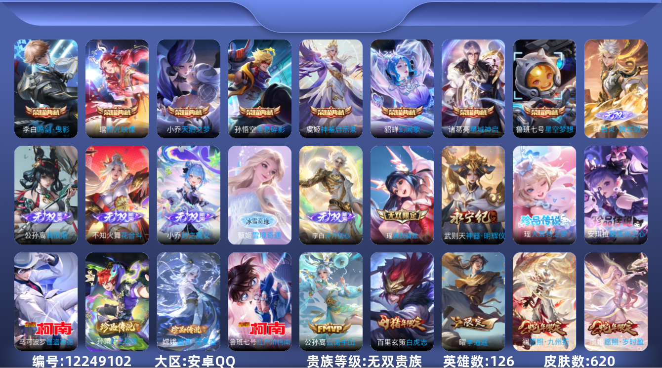 - PX_2093858-实名: 可修改 贵族等级: V7 英雄数: 104 皮肤数: 101 荣耀水晶: 最初的交响 无双皮: 雪境奇遇-甄姬 珍品传说: 江户川柯南,怪盗基德 传说皮: 绛天战甲,幻光神枪 限定皮: 引擎之心,鸣野蒿,愿照·山河定