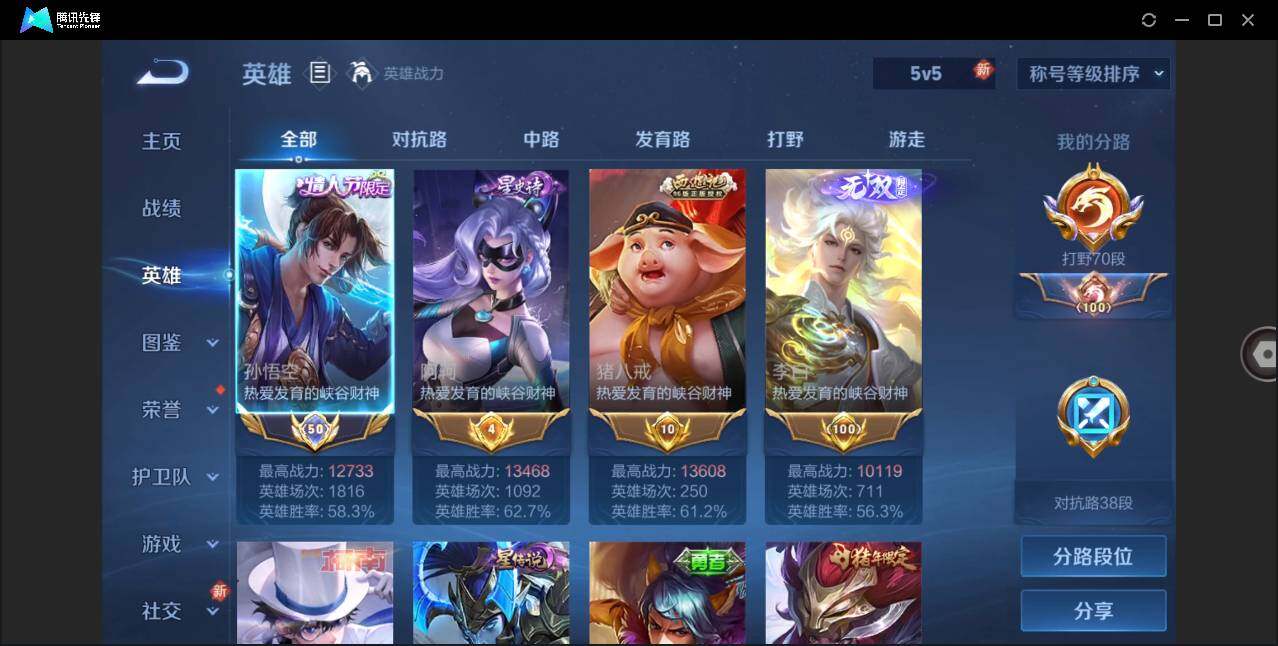 [12249102]打野70段/对抗路38段【特价急出/详情看图】:安卓Q-V11-至尊星耀II段位-126英雄-620皮肤-8典藏-8无双-6珍品传说-110传说-217史诗