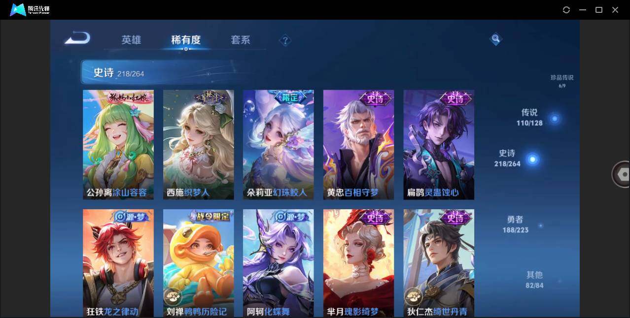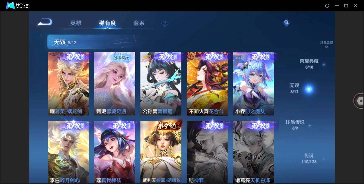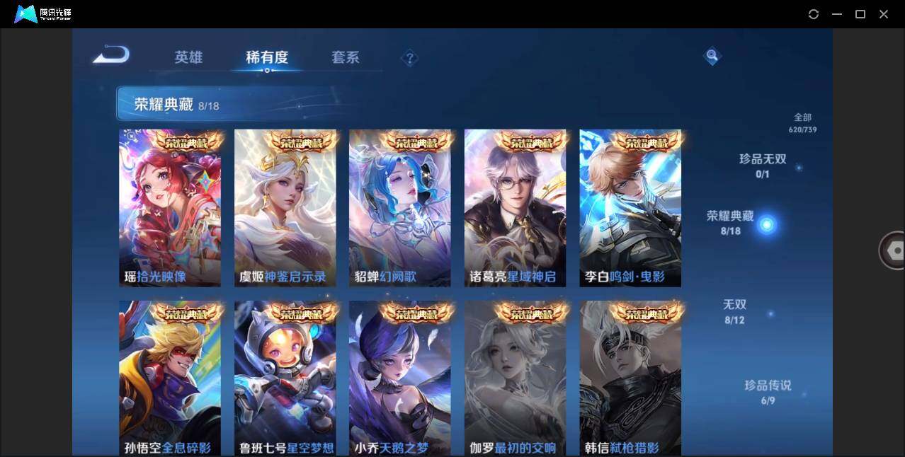 【荣耀典藏】:武则天英雄,孙悟空全息碎影,小乔天鹅之梦,鲁班七号星空梦想,李白鸣剑曳影,诸葛亮星域神启,貂蝉幻阙歌,虞姬神鉴启示录,瑶拾光映像