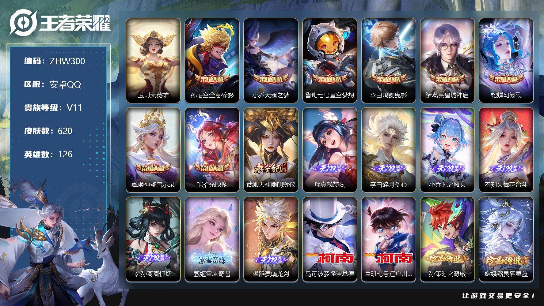[12249102]打野70段/对抗路38段【特价急出/详情看图】:安卓Q-V11-至尊星耀II段位-126英雄-620皮肤-8典藏-8无双-6珍品传说-110传说-217史诗 【荣耀典藏】:武则天英雄,孙悟空全息碎影,小乔天鹅之梦,鲁班七号星空梦想,李白鸣剑曳影,诸葛亮星域神启,貂蝉幻阙歌,虞姬神鉴启示录,瑶拾光映像 【无双皮肤】:武则天神器明辉仪,瑶真我赫兹,李白碎月剑心,小乔时之魔女,不知火舞花合斗,公孙离离恨烟,甄姬雪境奇遇,曜器灵螭龙剑 【珍品传说】:马可波罗怪盗基德,鲁班七号江户川柯南,孙策时之奇旅,嫦娥器灵落星盏,瑶大耳狗之梦,安琪拉酷洛米之心 【传说皮肤】:公孙离云诺千山,西施续相思,杨玉环星之鸣奏,司空震愿照山河定,女娲愿照千秋盛,妲己愿照众生和,澜愿照九州拓,蔡文姬愿照福禄聚,虞姬愿照岁时盈,云缨幻光神枪,裴擒虎祥瑞亨通,嬴政玄雷天君,王昭君映山客,桑启鸣野蒿,庄周牧神诗旅,夏侯惇霜北刀,铠冥王哈迪斯,朵莉亚心动手记,墨子黄金天蝎座,海月金乌负日,亚连落雪白狼,吕布曦玄引,典韦战鼓燎原,孙尚香乘龙问璇玑,孙策乘龙淬吴钩,赵云乘龙铭钟鼎,马超琥珀纪元,铠琥珀纪元,澜逐花归海,艾琳觅芳踪,露娜霜月吟,孙膑小动物乐团,大乔时之奇旅,鲁班七号时之奇旅,兰陵王影龙天霄,吕布遇见神鼓,宫本武藏惊梅引,上官婉儿妄想奇谈,马可波罗妄想实况,东皇太一灼幽烈阳,公孙离记忆之芯,夏洛特浮生妄,干将莫邪画中仙,花木兰燃星之曲,虞姬无限倾心,项羽无限倾心,伽罗炽翼辉光,孙悟空齐天大圣,小乔山海琳琅生,曜山海苍雷引,李信山海炽霜斩,吕布怒海麟威,李白诗剑行,狄仁杰神器狴犴令,不知火舞绯月行,王昭君星穹之声,百里守约碎云,橘右京枫霜尽,娜可露露前尘镜,孙尚香音你闪耀,马可波罗深海之息,后羿无尽星芒,马超无双飞将,大乔挚爱花嫁,孙策挚爱之约,露娜启示之音,蔡文姬花朝如约,女娲补天,孙策末日机甲,瑶时之祈愿,裴擒虎寅虎赤拳,孙尚香异界灵契,赵云淬星耀世,王昭君乞巧织情,西施游龙清影,曜李逍遥 ,周瑜音你心动,小乔音你心动,李元芳飞鸢探春,兰陵王默契交锋,公孙离祈雪灵祝,诸葛亮时雨天司,铠绛天战甲,镜炽阳神光,虞姬启明星使,孙悟空零号赤焰,关羽武圣,曜云鹰飞将,李信一念神魔,刘备时之恋人,伽罗太华,貂蝉猫影幻舞,张良黄金白羊座,干将莫邪久胜战神,虞姬云霓雀翎,达摩黄金狮子座,百里玄策白虎志,花木兰冠