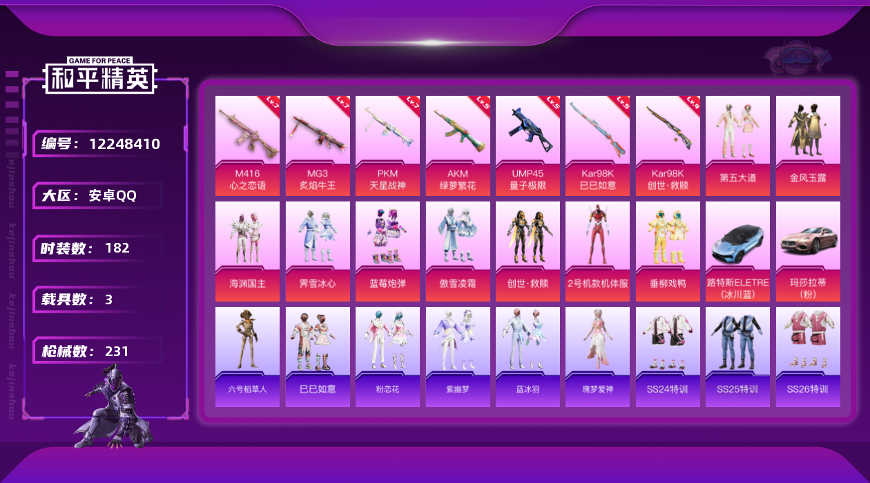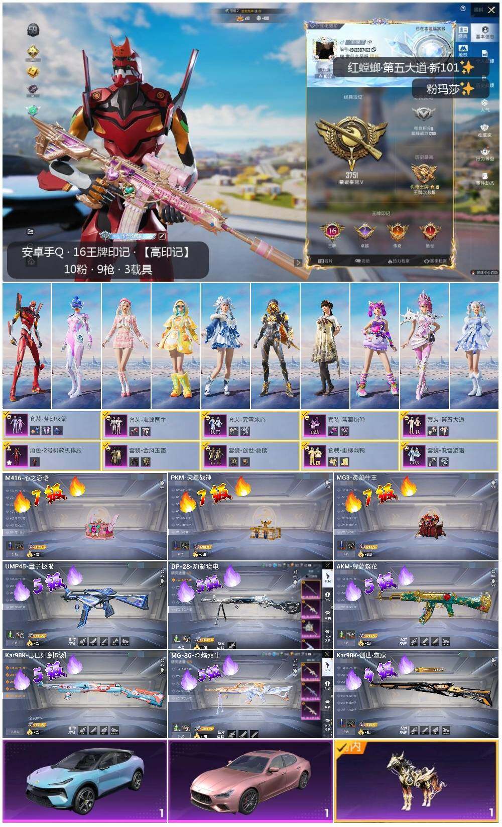 [12248410]素材身法号/绝世印记1【特价急出/详情看图】:安卓 手Q-10粉装-9特效枪-3载具-4粉色飞行器-8w热力值-16王牌印记-182套装-231枪皮【热门品类】:粉装-梦幻火箭,套装-龟仙人,角色-六号稻草人【粉色载具】:路特斯ELETRE(冰川蓝),玛莎拉蒂Ghibli(粉),黑曜夜骑【粉色套装】:粉装-梦幻火箭,粉装-金风玉露,粉装-海渊国主,角色-2号机款机体服,粉装-蓝莓炮弹,粉装-傲雪凌霜,粉装-霁雪冰心,粉装-垂柳戏鸭,粉装-第五大道,套装-创世·救赎【粉色枪皮等级】:AKM-绿萝繁花(五级),M416-心之恋语(七级),UMP45-量子极限(五级),Kar98K-创世·救赎(四级),Kar98K-巳巳如意(五级),DP-28-豹影疾电(五级),MG3-炙焰牛王(七级),PKM-天星战神(七级),MG-36-沧焰双生(五级)【粉色飞行器】:梦幻火箭飞行器,天之羽翼飞行器,灵猫魔法师飞行器