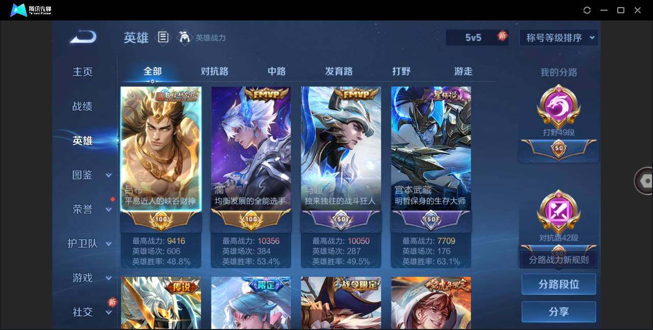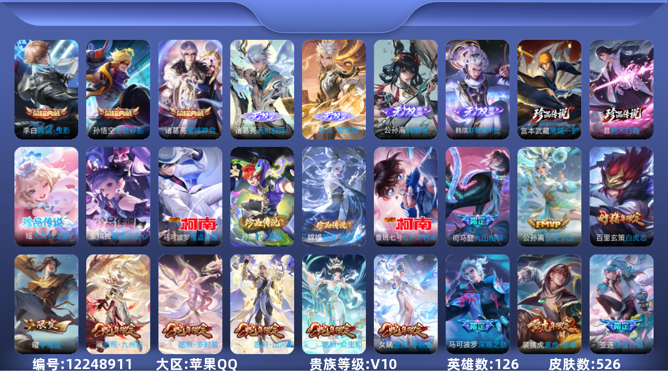 [12248911]打野49段/对抗路42段【特价急出/详情看图】:苹果Q-V10-至尊星耀III段位-126英雄-526皮肤-3典藏-4无双-8珍品传说-76传说-176史诗