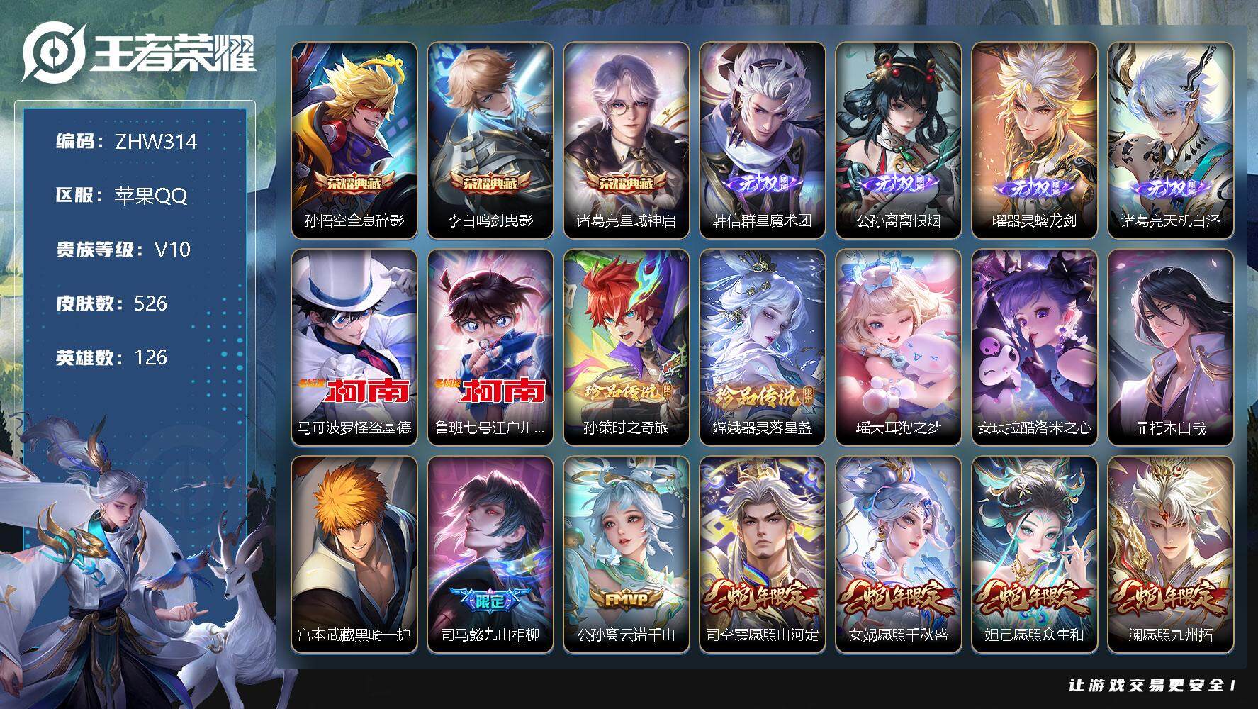 - [11548077]V10 6典藏 1无双 1珍品传说 40传说 126英雄 418皮肤 典藏英雄武则天 可修改实名 优质装备:天鹅之梦(小乔典藏),倪克斯神谕(宇宙婆娘),鸣剑·曳影,星域神启(倪克斯贼亮),银白咏叹调(倪克斯侍卫),青丘·九尾(妲己无双),拾光映像(瑶典藏),器灵·落星盏,黄金射手座,冠军飞将,云鹰飞将(小将军),绛天战甲(鸡嘴战神),猫影幻舞,久胜战神,炽阳神光,一念神魔,云霓雀翎,末日机甲-孙尚香(绿蚂蚱),仲夏夜之梦(大飞蛾),地狱之眼,音你心动-周瑜,胖达荣荣,李逍遥,乞巧织情,时之恋人-刘备(电焊工),游龙清影(小青龙),淬星耀世,超时空战士-狄仁杰,挚爱之约,挚爱花嫁,无双飞将,碎云,神器·狴犴令,炽翼辉光(娃娃菜牛角包),燃星之曲,浮生妄,记忆之芯(机甲兔),青丘·九尾,艾琳觅芳踪,涂山容容 传说皮:幻光神枪 珍宝阁皮:万物之道,优雅恋人,玩趣恶龙 限定皮:愿照·千秋盛(女娲年限),鸣野蒿,至尊宝,凤求凰(白切鸡),太华(伽罗年限),傲雪梅枪,星穹之声,白晶晶,诗剑行,匿光决锋者,怒海麟威,降魔,五谷丰年,青龙志(铠年限),天狼绘梦者,李小龙,玄武志(苏烈年限),朱雀志(守约年限),如梦令-后羿,大圣娶亲,匿光追影者,玉兔公主,启示之音,神器·万象笔,山海·玄木吟(马可年限) 史诗皮:灵蛊蚀心,星界战将,龙之律动,石田雨龙,茶境仙,破空之剑,百相守梦-百里守约,百相守梦-黄忠,遇见神鹿,紫霞仙子,苍穹之光,电玩小子(小书包),白龙吟,黄金分割率,特工魅影,千年之狐,永昼,江河有灵,魅语,百解令(蒙犽),高渐离燃音魔法,蒙恬荣光圣徽,无限星赏官,冰冠公主,青蛇,偶像歌手,白蛇,晚萤,电玩·爆裂旋风,暗夜猫娘,龙骑士(小龙虾),末日机甲-吕布,猫狗日记-孙策,猫狗日记-大乔,时之恋人-孙尚香,乱世虎臣,节奏热浪,修罗,女仆咖啡,摇滚巨星,水果甜心,绅士熊喵,天才门将,星夜王子,心灵骇客,时之奇旅-安琪拉,功夫厨神,德古拉伯爵,暗隐猎兽者,幽灵船长,鬼剑武藏,暗渊魔法,心灵战警,乐园奇幻夜,天秀·启明,舞动绿茵,地狱岩魂,诗语江南,纤云弄巧,繁星吟游(呼啦呼啦),拒霜思,缤纷独角兽,乘风破浪,逐浪之夏,龙鼓争鸣,月团寄思,水晶猎龙者,曙光守护者,热力回旋,箭羽风息,金属风暴,原初追逐者,圣诞狂欢,圣诞恋歌,鹰眼统帅,暗夜贵公子,魅力维加斯,黎明之约,雪