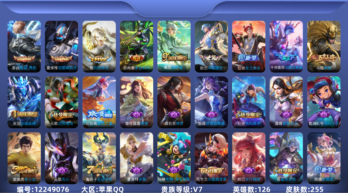 [12249076]【特价急出/详情看图】:苹果Q-V7-至尊星耀V段位-126英雄-255皮肤-2典藏-4传说-69史诗