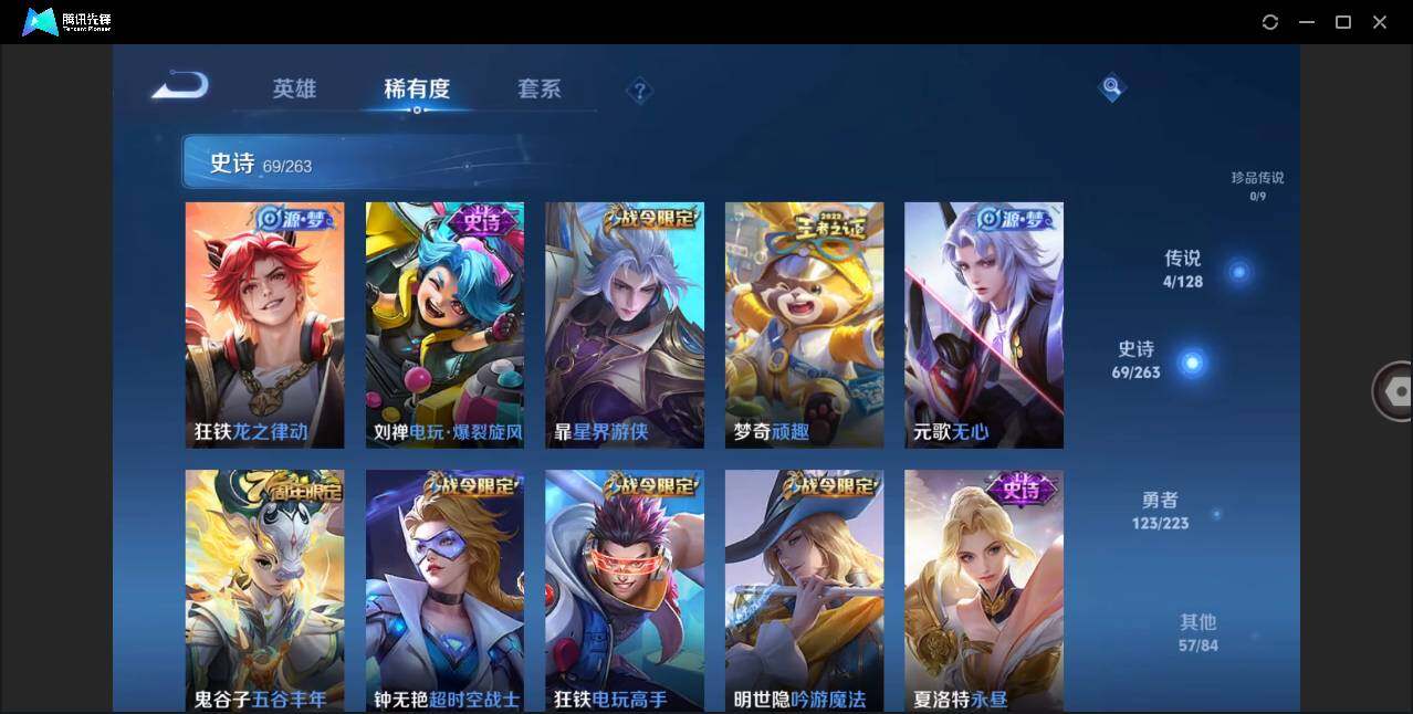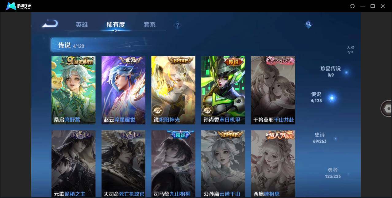 - [11443635]V7 9传说 123英雄 210皮肤 可修改实名 优质装备:冠军飞将,云鹰飞将(小将军),久胜战神,炽阳神光,一念神魔,音你心动-小乔,零号·赤焰,无双飞将,霜月吟 珍宝阁皮:胡桃夹子,女武神 限定皮:高山流水,五谷丰年,梁祝,李小龙,辉光之辰,孙行者,玉兔公主,山海·玄木吟(马可年限) 史诗皮:蔬乡物语(鲁班七号),苍穹之光,黄金分割率,特工魅影,永昼,江河有灵,百解令(蒙犽),高渐离燃音魔法,电玩·爆裂旋风,猫狗日记-孙策,乱世虎臣,节奏热浪,修罗,女仆咖啡,摇滚巨星,水果甜心,绅士熊喵,星夜王子,暗隐猎兽者,幽灵船长,鬼剑武藏,地狱岩魂,纤云弄巧,拒霜思,缤纷独角兽,乘风破浪,逐浪之夏,水晶猎龙者,曙光守护者,金属风暴,圣诞狂欢,圣诞恋歌,鹰眼统帅,魅力维加斯,无心,未来纪元-赵云