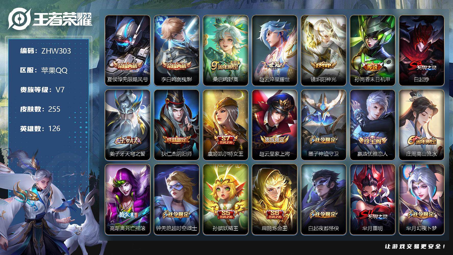 [12249076]【特价急出/详情看图】:苹果Q-V7-至尊星耀V段位-126英雄-255皮肤-2典藏-4传说-69史诗 【荣耀典藏】:夏侯惇无限飓风号,李白鸣剑曳影 【传说皮肤】:桑启鸣野蒿,赵云淬星耀世,镜炽阳神光,孙尚香末日机甲 【限定皮肤】:白起狰,姜子牙天穹之誓,狄仁杰阴阳师,虞姬凯尔特女王,赵云皇家上将,墨子神迹守卫,嬴政优雅恋人,庄周高山流水,高渐离死亡摇滚,钟无艳超时空战士,孙膑妖精王,扁鹊炼金王,白起夜都怪侠,芈月重明,芈月幻夜卜梦,元歌云间偶戏,元歌无心,夏侯惇朔风刀,甄姬落雪兰心,曹操烛龙,典韦穷奇,狄仁杰魔术师,狄仁杰万华元夜,达摩星际陆战队,达摩沙漠行僧,项羽海滩派对,老夫子醍醐杖,老夫子航海奇遇记,关羽冰锋战神,程咬金演武夺筹,王昭君午后时光,兰陵王金庭之子,亚瑟潮玩骑士王,李元芳云中旅人,钟馗驱傩正仪,杨玉环遇见飞天,干将莫邪冰霜恋舞曲,雅典娜黎明之约,蔡文姬繁星吟游,太乙真人饕餮,太乙真人华丽摇滚,鬼谷子原初探秘者,鬼谷子五谷丰年,黄忠火炮绅士,苏烈千军破阵,百里玄策原初追逐者,弈星混沌棋,梦奇顽趣,公孙离蜜橘之夏,沈梦溪大漠名商,明世隐疑决卦,明世隐吟游魔法,裴擒虎李小龙,裴擒虎擒涛扼浪,狂铁御狮,狂铁电玩高手,米莱狄御霄,米莱狄胡桃异想国,云中君纤云弄巧,伽罗天狼溯光者,盾山御銮,上官婉儿梁祝,嫦娥拒霜思,嫦娥暖冬兔眠,鲁班大师探海日志,桑启海盐诗旅,暃星界游侠,艾琳女武神,鬼谷子天穹祈灯,周瑜熔金海岸 【年限皮肤】:马超神威 【赛季限定】:孙膑妖精王,扁鹊炼金王,白起狰,芈月重明,夏侯惇朔风刀,曹操烛龙,典韦穷奇,狄仁杰万华元夜,达摩沙漠行僧,老夫子醍醐杖,程咬金演武夺筹,兰陵王金庭之子,李元芳云中旅人,虞姬凯尔特女王,钟馗驱傩正仪,雅典娜黎明之约,太乙真人饕餮,鬼谷子原初探秘者,苏烈千军破阵,百里玄策原初追逐者,弈星混沌棋,梦奇顽趣,沈梦溪大漠名商,明世隐疑决卦,裴擒虎擒涛扼浪,狂铁御狮,米莱狄御霄,盾山御銮,鲁班大师探海日志,桑启海盐诗旅,鬼谷子天穹祈灯,姜子牙天穹之誓 【战令限定】:墨子神迹守卫,钟无艳超时空战士,白起夜都怪侠,芈月幻夜卜梦,元歌云间偶戏,甄姬落雪兰心,达摩星际陆战队,老夫子航海奇遇记,王昭君午后时光,亚瑟潮玩骑士王,黄忠火炮绅士,明世隐吟游魔法,狂铁电玩高手,米莱狄胡桃异想国,嫦娥暖冬兔眠,暃星界游侠 【史诗皮肤】:鲁班