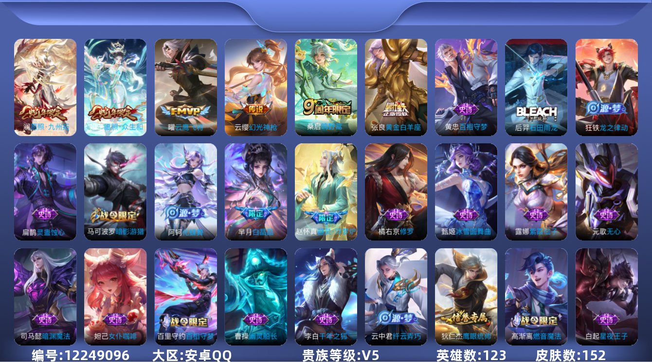 - [12114741]V7 1典藏 1珍品传说 11传说 125英雄 267皮肤 可修改实名 优质装备:弑枪猎影(韩信典藏),怪盗基德,云鹰飞将(小将军),炽阳神光,一念神魔,涂山容容 传说皮:乘龙·问璇玑(孙尚香年限),貂蝉曦玄引,幻光神枪 珍宝阁皮:妄想食味,玩趣恶龙 限定皮:愿照·九州拓(澜年限),逐霄战戟,陌上桑,鸣野蒿,时雨天司(水龙头),遇见飞天,诗剑行,齐天大圣,五谷丰年,梁祝,李小龙,美猴王,女儿国国王,玉兔公主 史诗皮:器灵·浮梦炉,化蝶舞,石田雨龙,怒海争锋,埋骨钱,芈月浮光幕影,决胜骁骑,上官婉儿群星魔术团,蔬乡物语(鲁班七号),乘龙·聚宝船(安琪拉年限),百相守梦-百里守约,星界特工,百相守梦-黄忠,紫霞仙子,电玩小子(小书包),黄金分割率,特工魅影,江河有灵,魅语,百解令(蒙犽),高渐离燃音魔法,冰冠公主,偶像歌手,电玩·爆裂旋风,暗夜猫娘,龙骑士(小龙虾),末日机甲-吕布,猫狗日记-孙策,猫狗日记-大乔,乱世虎臣,节奏热浪,修罗,女仆咖啡,摇滚巨星,水果甜心,天才门将,星夜王子,功夫厨神,德古拉伯爵,暗隐猎兽者,幽灵船长,鬼剑武藏,心灵战警,舞动绿茵,地狱岩魂,纤云弄巧,缤纷独角兽,乘风破浪,逐浪之夏,水晶猎龙者,曙光守护者,金属风暴,原初追逐者,圣诞恋歌,鹰眼统帅,暗夜贵公子,魅力维加斯,黎明之约