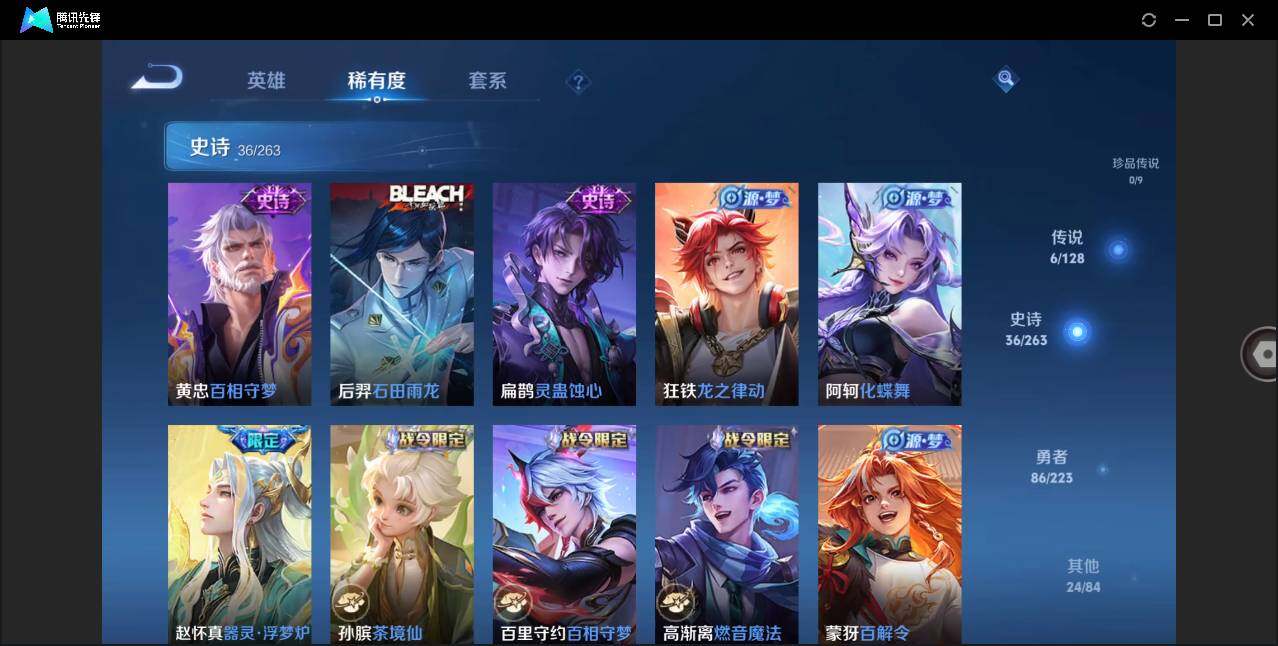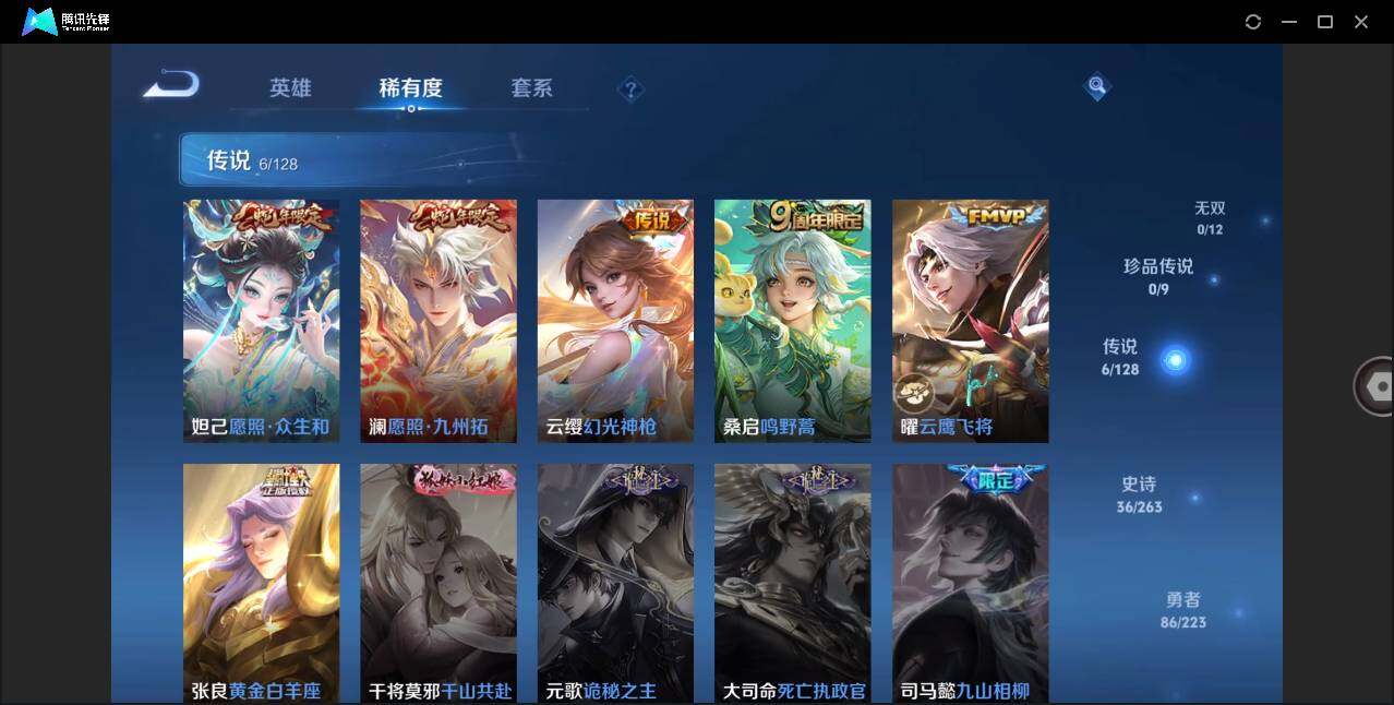 - [11877049]V6 6传说 123英雄 137皮肤 可修改实名 优质装备:冠军飞将,久胜战神,一念神魔,零号·赤焰 珍宝阁皮:蔷薇恋人,女武神 限定皮:鸣野蒿,五谷丰年,御风骁将(吕布年限),默契交锋-兰陵王,默契交锋-花木兰 史诗皮:紫霞仙子,黄金分割率,千年之狐,江河有灵,修罗,水果甜心,德古拉伯爵,幽灵船长,鬼剑武藏,缤纷独角兽,乘风破浪,金属风暴,圣诞恋歌,鹰眼统帅,无心