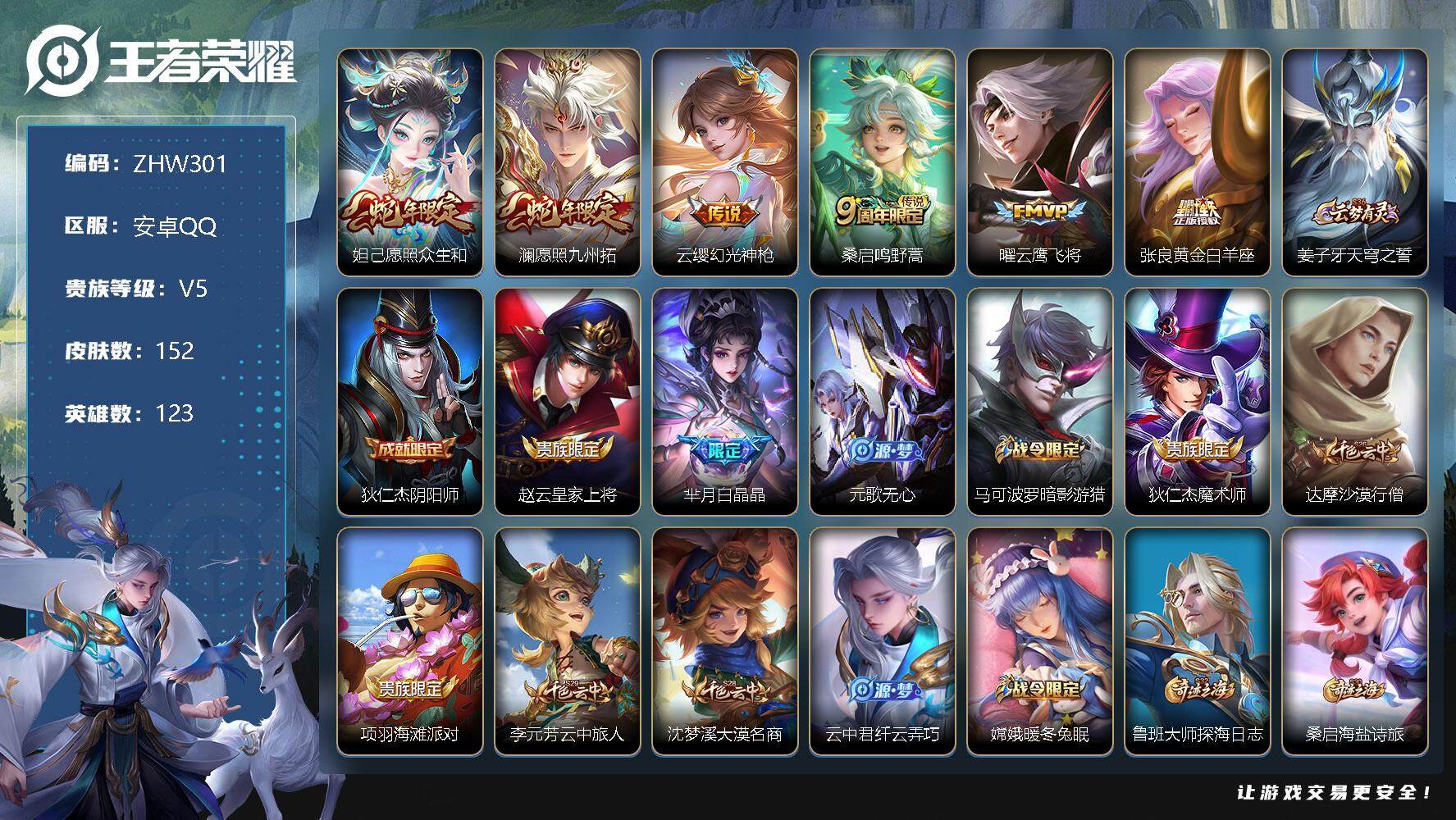 [12249096]【特价急出/详情看图】:安卓Q-V5-永恒钻石III段位-123英雄-152皮肤-6传说-36史诗 【传说皮肤】:妲己愿照众生和,澜愿照九州拓,云缨幻光神枪,桑启鸣野蒿,曜云鹰飞将,张良黄金白羊座 【限定皮肤】:姜子牙天穹之誓,狄仁杰阴阳师,赵云皇家上将,芈月白晶晶,元歌无心,马可波罗暗影游猎,狄仁杰魔术师,达摩沙漠行僧,项羽海滩派对,李元芳云中旅人,沈梦溪大漠名商,云中君纤云弄巧,嫦娥暖冬兔眠,鲁班大师探海日志,桑启海盐诗旅,艾琳女武神,张良古海寻踪,蒙犽百解令,高渐离燃音魔法,妲己灵卜魔法,鬼谷子天穹祈灯,沈梦溪龙舞盛年,刘邦剑破天穹,程咬金群星魔术团,周瑜熔金海岸 【赛季限定】:达摩沙漠行僧,张良古海寻踪,李元芳云中旅人,沈梦溪大漠名商,鲁班大师探海日志,桑启海盐诗旅,鬼谷子天穹祈灯,刘邦剑破天穹,姜子牙天穹之誓 【战令限定】:马可波罗暗影游猎,嫦娥暖冬兔眠,高渐离燃音魔法,妲己灵卜魔法 【史诗皮肤】:露娜紫霞仙子,赵云皇家上将,赵云未来纪元,甄姬冰雪圆舞曲,王昭君偶像歌手,狄仁杰魔术师,宫本武藏鬼剑武藏,孙尚香水果甜心,嬴政摇滚巨星,妲己女仆咖啡,墨子金属风暴,曹操幽灵船长,李白千年之狐,小乔缤纷独角兽,亚瑟心灵战警,程咬金功夫厨神,白起星夜王子,阿轲节奏热浪,狄仁杰鹰眼统帅,橘右京修罗,马可波罗暗影游猎,云中君纤云弄巧,芈月白晶晶,杨戬天秀启明,司马懿暗渊魔法,元歌无心,蒙犽百解令,妲己灵卜魔法,高渐离燃音魔法,百里守约百相守梦,孙膑茶境仙,赵怀真器灵浮梦炉,阿轲化蝶舞,狂铁龙之律动,扁鹊灵蛊蚀心,后羿石田雨龙,黄忠百相守梦 【其他皮肤】:项羽海滩派对,韩信教廷特使,韩信街头霸王,阿轲爱心护理,赵云白执事,赵云忍炎影,艾琳女武神,牛魔西部大镖客,庄周鲤鱼之梦,宫本武藏未来纪元,姜子牙时尚教父,妲己少女阿狸,典韦黄金武士,亚瑟死亡骑士,达摩拳王,花木兰兔女郎,张飞五福同心,甄姬花好人间,刘备万事如意,宫本武藏万象初新,后羿阿尔法小队,狄仁杰阴阳师,刘备纽约教父,关羽龙腾万里,孙尚香沉稳之力,诸葛亮掌控之力,李白敏锐之力,明世隐虹云星官,吕布野性能量,沈梦溪鲨炮海盗猫,姜子牙炽热元素使,哪吒次元突破,狂铁特工战影,鲁班大师乓乓大师,达摩沙漠行僧,程咬金无双福将,刘禅唤灵魔甲,米莱狄契约魔法,沈梦溪大漠名商,蒙恬蔚蓝守将,李元芳云中旅人,桑启海盐诗旅,嫦娥暖冬