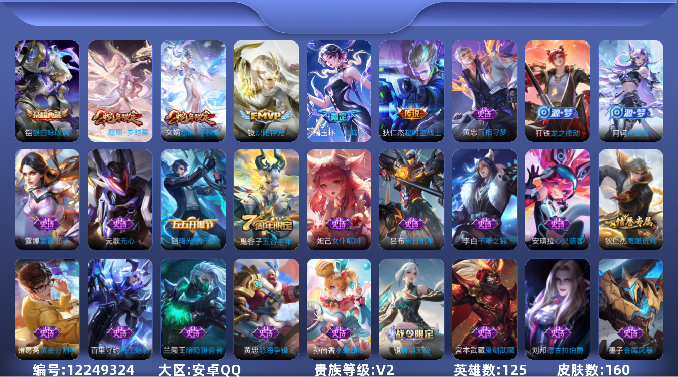 [12249324]【特价急出/详情看图】:安卓Q-V2-永恒钻石IV段位-125英雄-160皮肤-1典藏-5传说-30史诗