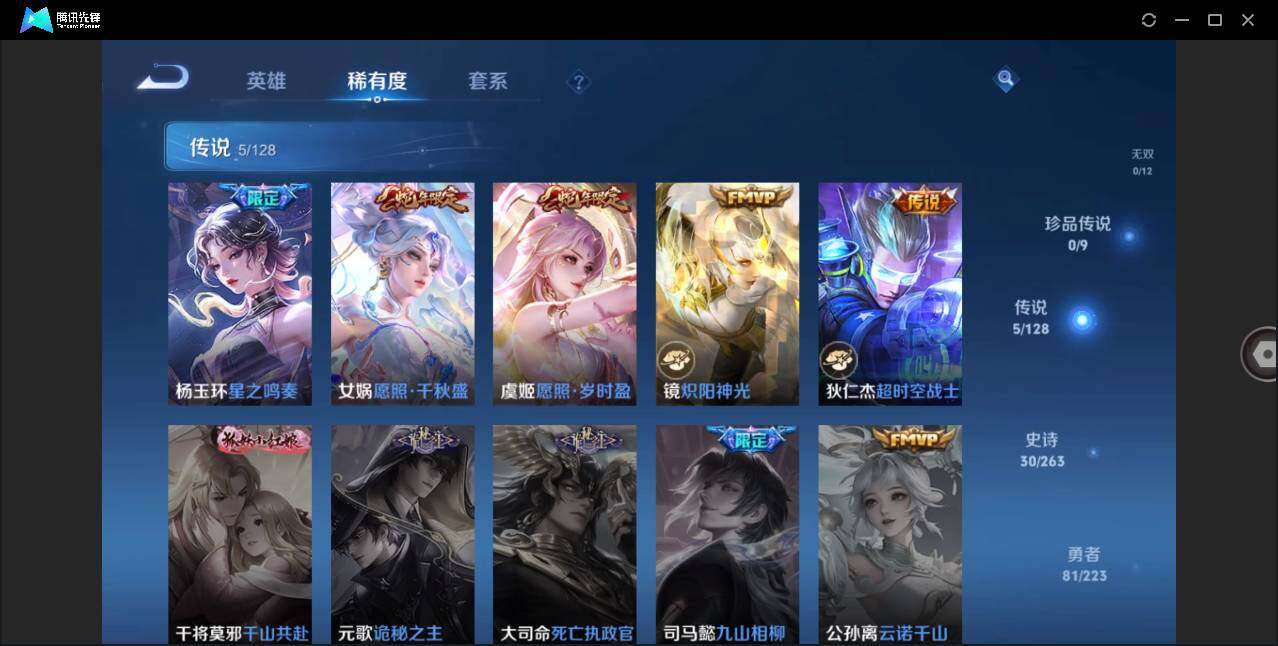 - [11656877]V6 7传说 93英雄 79皮肤 可修改实名 优质装备:云鹰飞将(小将军),绛天战甲(鸡嘴战神),零号·赤焰,李逍遥,淬星耀世,末日机甲-孙策 珍宝阁皮:蔷薇恋人 限定皮:时雨天司(水龙头),青龙志(铠年限),天狼绘梦者,李小龙 史诗皮:无限星赏官,乱世虎臣,节奏热浪,修罗,纤云弄巧,繁星吟游(呼啦呼啦),缤纷独角兽,乘风破浪,龙鼓争鸣,曙光守护者,圣诞狂欢,鹰眼统帅,魅力维加斯