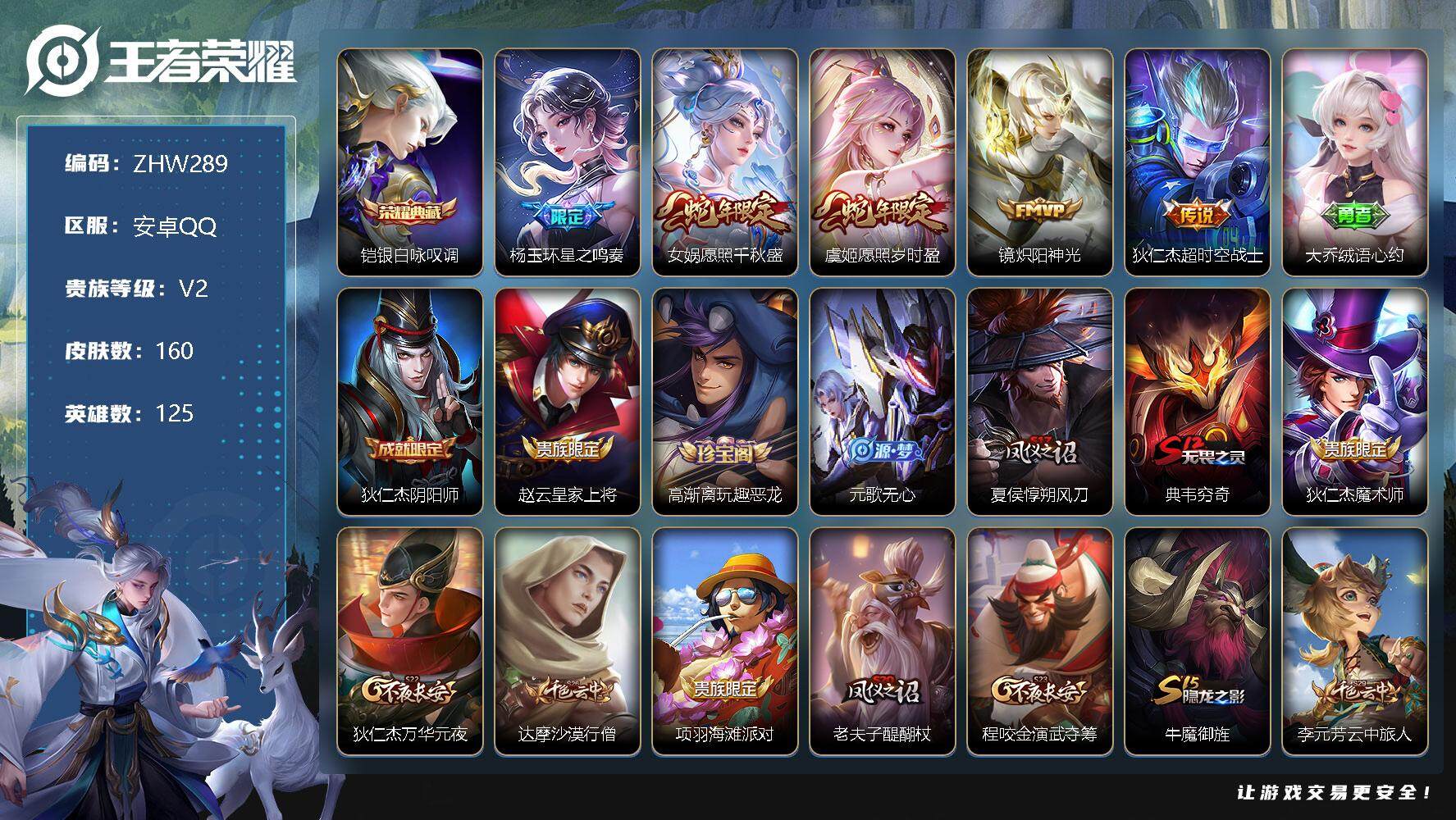 [12249324]【特价急出/详情看图】:安卓Q-V2-永恒钻石IV段位-125英雄-160皮肤-1典藏-5传说-30史诗 【荣耀典藏】:铠银白咏叹调 【传说皮肤】:杨玉环星之鸣奏,女娲愿照千秋盛,虞姬愿照岁时盈,镜炽阳神光,狄仁杰超时空战士 【限定皮肤】:大乔绒语心约,狄仁杰阴阳师,赵云皇家上将,高渐离玩趣恶龙,元歌无心,夏侯惇朔风刀,典韦穷奇,狄仁杰魔术师,狄仁杰万华元夜,达摩沙漠行僧,项羽海滩派对,老夫子醍醐杖,程咬金演武夺筹,牛魔御旌,李元芳云中旅人,钟馗驱傩正仪,鬼谷子原初探秘者,鬼谷子五谷丰年,苏烈千军破阵,弈星混沌棋,沈梦溪大漠名商,明世隐疑决卦,狂铁御狮,米莱狄御霄,伽罗天狼溯光者,盾山御銮,刘邦剑破天穹,程咬金群星魔术团,关羽决胜骁骑,镜青焰无极,项羽苍威无极,刘备异域游侠,周瑜熔金海岸 【赛季限定】:夏侯惇朔风刀,典韦穷奇,狄仁杰万华元夜,达摩沙漠行僧,老夫子醍醐杖,程咬金演武夺筹,牛魔御旌,李元芳云中旅人,钟馗驱傩正仪,鬼谷子原初探秘者,苏烈千军破阵,弈星混沌棋,沈梦溪大漠名商,明世隐疑决卦,狂铁御狮,米莱狄御霄,盾山御銮,刘邦剑破天穹 【战令限定】:镜青焰无极,项羽苍威无极 【史诗皮肤】:露娜紫霞仙子,赵云皇家上将,王昭君偶像歌手,狄仁杰魔术师,宫本武藏鬼剑武藏,孙尚香水果甜心,嬴政摇滚巨星,妲己魅力维加斯,妲己女仆咖啡,墨子金属风暴,李白千年之狐,吕布末日机甲,张飞乱世虎臣,刘邦德古拉伯爵,兰陵王暗隐猎兽者,诸葛亮黄金分割率,安琪拉心灵骇客,百里守约特工魅影,铠曙光守护者,狄仁杰鹰眼统帅,伽罗天狼溯光者,鬼谷子五谷丰年,元歌无心,镜青焰无极,关羽决胜骁骑,黄忠怒海争锋,孙膑茶境仙,阿轲化蝶舞,狂铁龙之律动,黄忠百相守梦 【其他皮肤】:项羽海滩派对,韩信教廷特使,韩信街头霸王,露娜哥特玫瑰,达摩大发明家,赵云忍炎影,白起白色死神,牛魔西部大镖客,扁鹊化身博士,宫本武藏未来纪元,安琪拉玩偶对对碰,孙膑天使之翼,姜子牙时尚教父,妲己少女阿狸,典韦黄金武士,亚瑟死亡骑士,花木兰兔女郎,甄姬花好人间,刘备万事如意,宫本武藏万象初新,狄仁杰阴阳师,关羽龙腾万里,王昭君幻想奇妙夜,狂铁命运角斗场,老夫子功夫老勺,典韦穷奇,狂铁御狮,米莱狄御霄,张良幽兰居士,牛魔御旌,盾山御銮,高渐离玩趣恶龙,沈梦溪鲨炮海盗猫,姜子牙炽热元素使,夏侯惇朔风刀,弈星混沌棋,明世隐疑决卦,盾