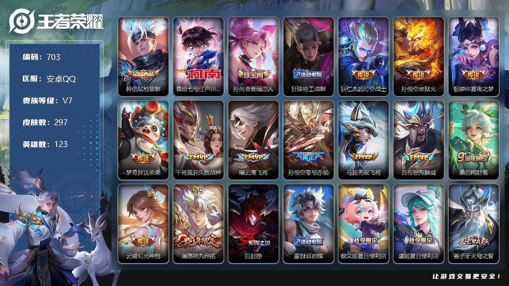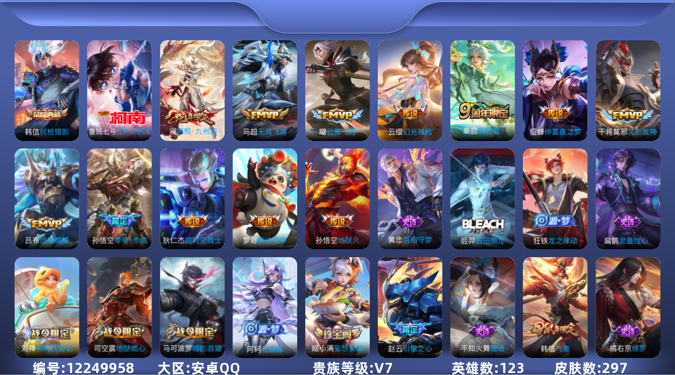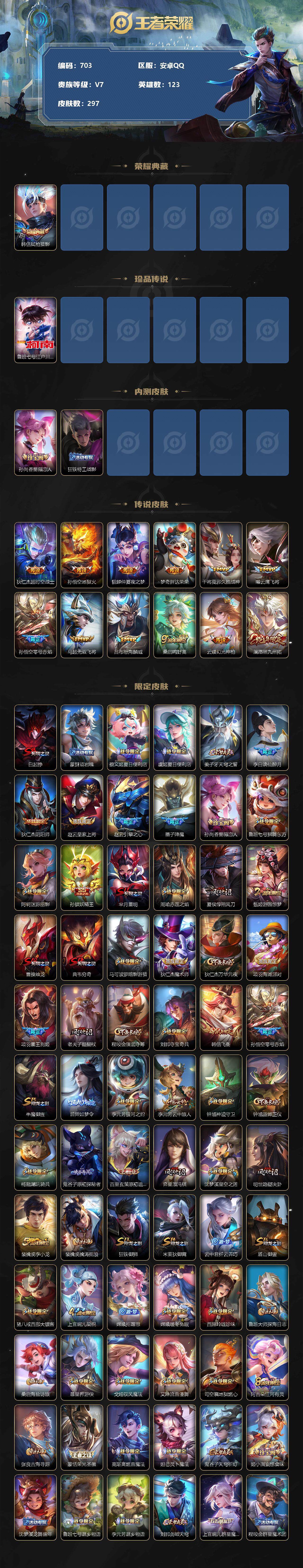 [12249958]【商品标题】:安卓Q-V7-永恒钻石I段位-123英雄-297皮肤-1典藏-0珍品无双-0无双-1珍品传说-12传说-83史诗