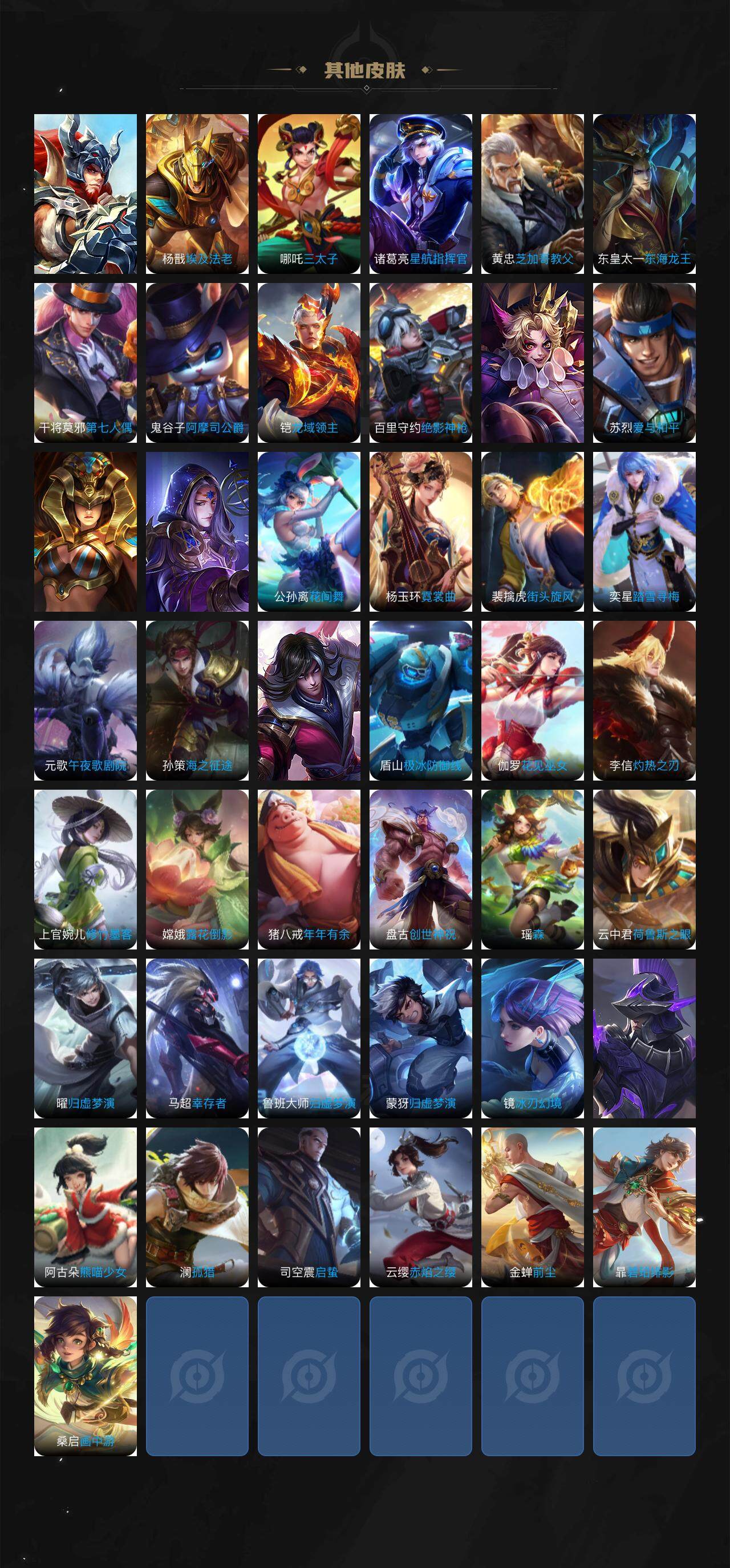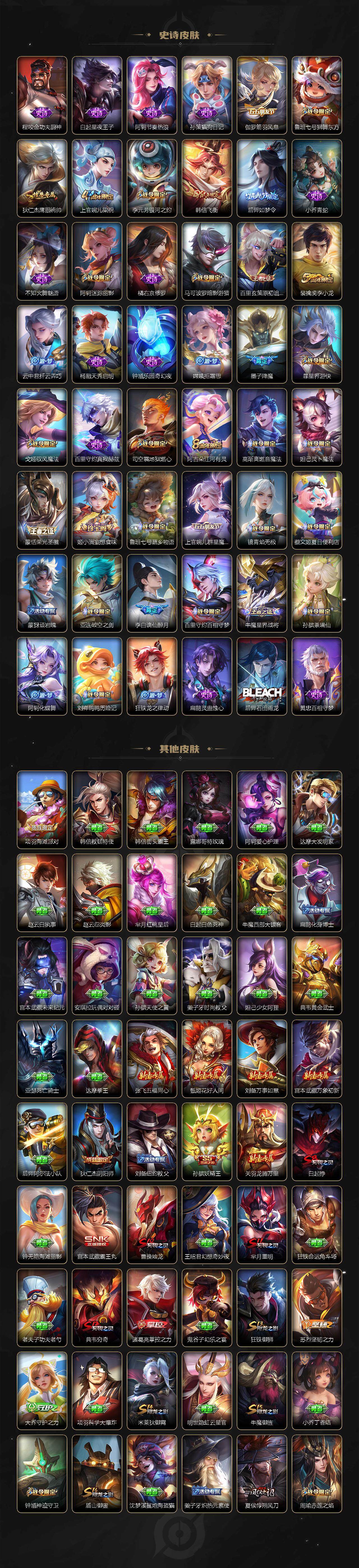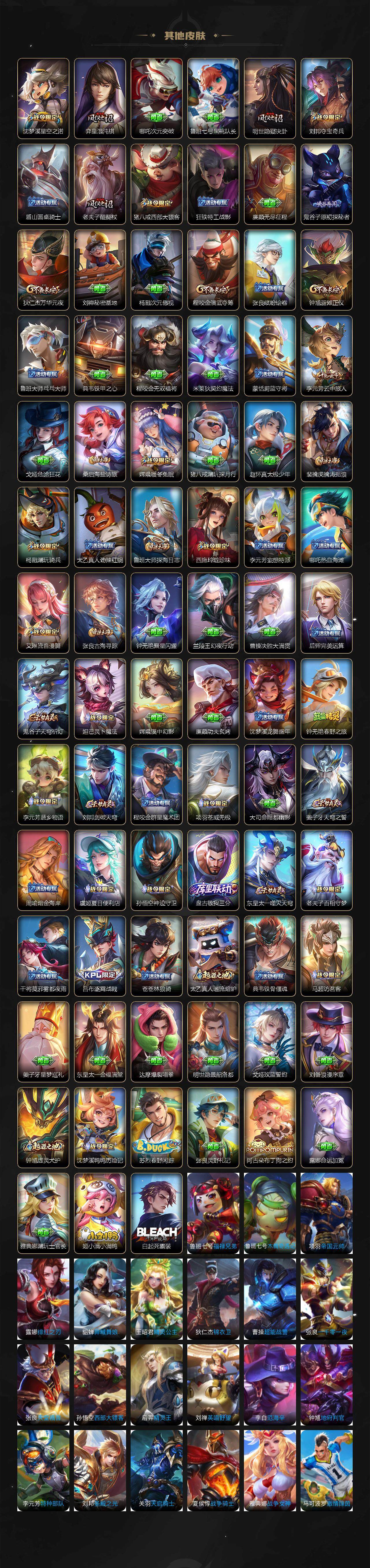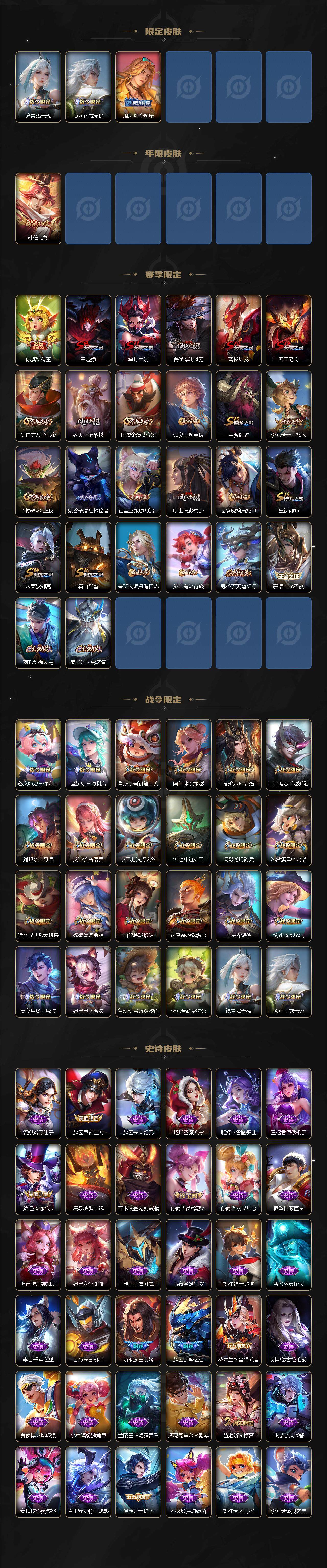 【限定皮肤】:白起狰,蒙犽顽岩魄,蔡文姬夏日便利店,虞姬夏日便利店,姜子牙天穹之誓,李白谪仙醉月,狄仁杰阴阳师,赵云皇家上将,赵云引擎之心,墨子降魔,孙尚香蔷薇恋人,鲁班七号狮舞东方,阿轲迷踪丽影,孙膑妖精王,芈月重明,周瑜赤莲之焰,夏侯惇朔风刀,甄姬游园惊梦,曹操烛龙,典韦穷奇,马可波罗暗影游猎,狄仁杰魔术师,狄仁杰万华元夜,项羽海滩派对,项羽霸王别姬,老夫子醍醐杖,程咬金演武夺筹,刘邦夺宝奇兵,韩信飞衡,孙悟空零号赤焰,牛魔御旌,后羿如梦令,李元芳银河之约,李元芳云中旅人,钟馗神迹守卫,钟馗驱傩正仪,杨戬潮玩骑兵,鬼谷子原初探秘者,百里玄策原初追逐者,弈星混沌棋,沈梦溪星空之诺,明世隐疑决卦,裴擒虎李小龙,裴擒虎擒涛扼浪,狂铁御狮,米莱狄御霄,云中君纤云弄巧,盾山御銮,猪八戒西部大镖客,上官婉儿梁祝,嫦娥拒霜思,嫦娥暖冬兔眠,西施玲珑珍味,鲁班大师探海日志,桑启海盐诗旅,暃星界游侠,戈娅驭风魔法,艾琳流音漫舞,司空震地狱燃心,阿古朵江河有灵,张良古海寻踪,蒙恬荣光圣徽,高渐离燃音魔法,妲己灵卜魔法,鬼谷子天穹祈灯,姬小满妄想食味,沈梦溪龙舞盛年,鲁班七号蔬乡物语,李元芳蔬乡物语,刘邦剑破天穹,上官婉儿群星魔术团,程咬金群星魔术团,镜青焰无极,项羽苍威无极,周瑜熔金海岸