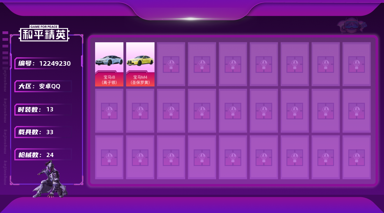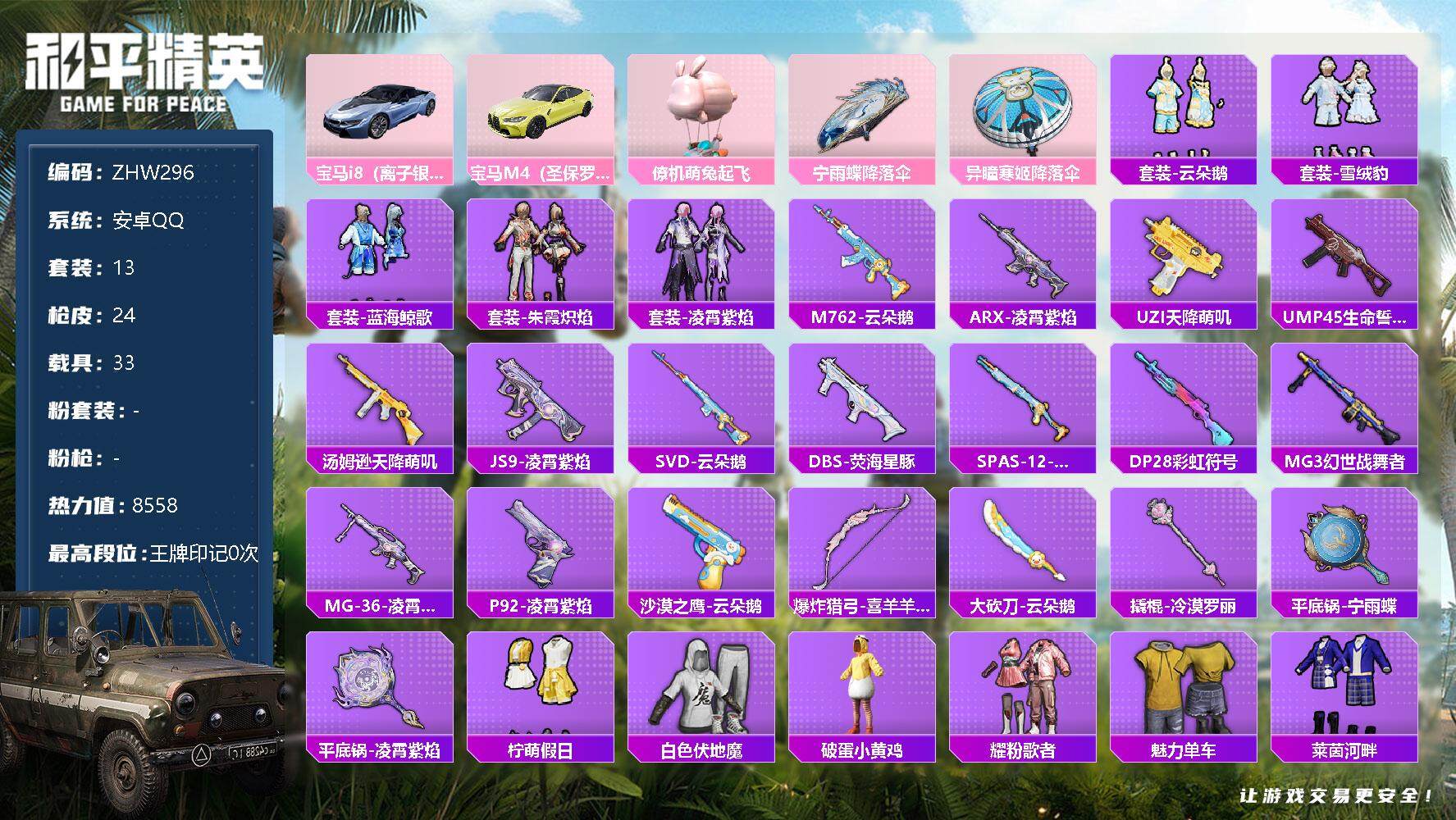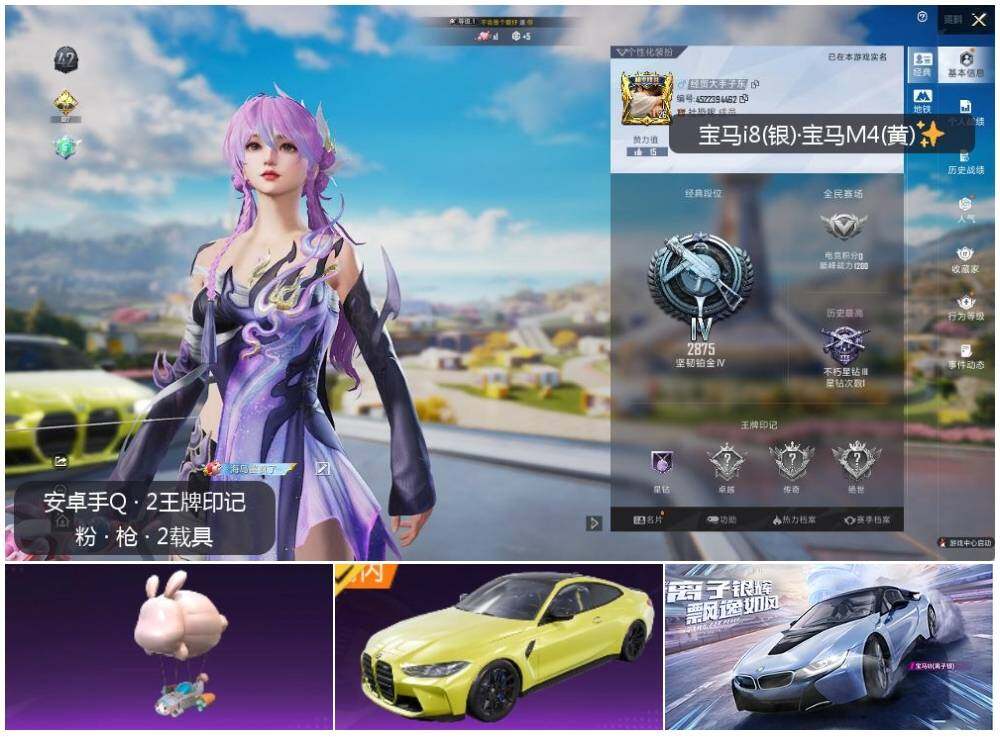 [12249230]【特价急出/详情看图】:安卓 手Q-3载具-8558热力值-2王牌印记-13套装-24枪皮【粉色载具】:宝马i8(离子银),宝马M4(圣保罗黄),僚机-萌兔起飞