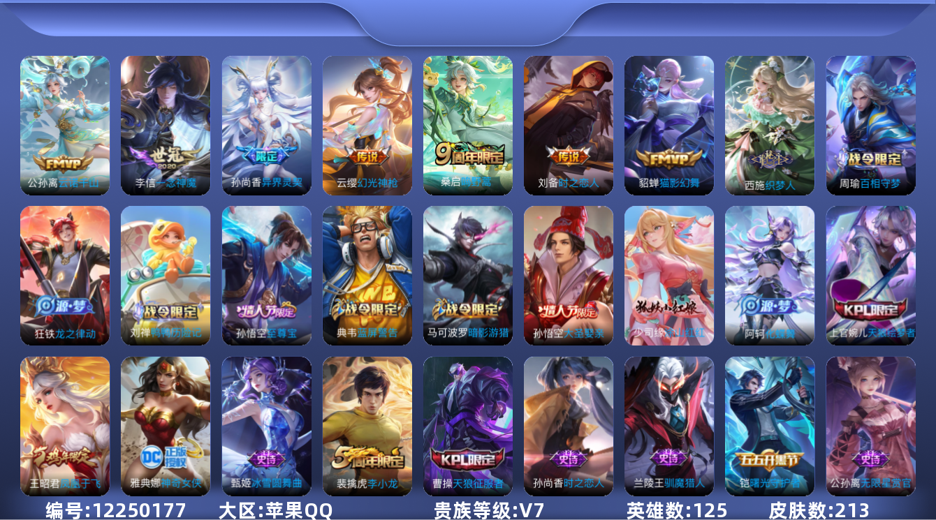 [12250177]V7 7传说 125英雄 213皮肤 可修改实名 优质装备:猫影幻舞,一念神魔,时之恋人-刘备(电焊工) 传说皮:云诺千山,幻光神枪 限定皮:鸣野蒿,至尊宝,凤凰于飞,异界灵契(白毛香),遇见飞天,高山流水,梁祝,天狼征服者,天狼绘梦者,李小龙,大圣娶亲,神奇女侠 史诗皮:鸭鸭历险记-刘禅,化蝶舞,龙之律动,百相守梦-周瑜,涂山红红,织梦人,无限星赏官,青蛇,时之恋人-孙尚香,节奏热浪,水果甜心,星夜王子,暗隐猎兽者,幽灵船长,鬼剑武藏,舞动绿茵,纤云弄巧,繁星吟游(呼啦呼啦),拒霜思,乘风破浪,曙光守护者,箭羽风息,金属风暴,圣诞恋歌,鹰眼统帅,魅力维加斯,未来纪元-赵云