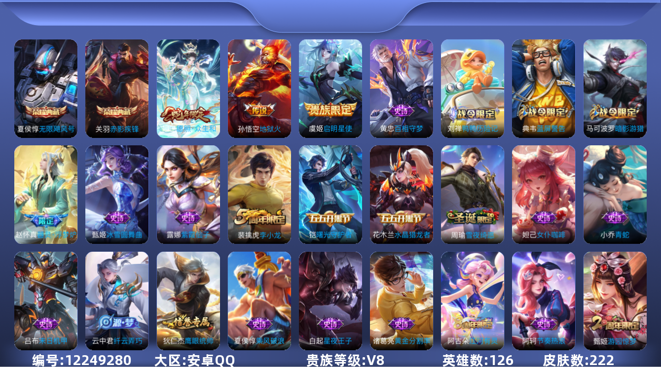 [12249280]【特价急出/详情看图】:安卓Q-V8-至尊星耀V段位-126英雄-222皮肤-2典藏-3传说-46史诗
