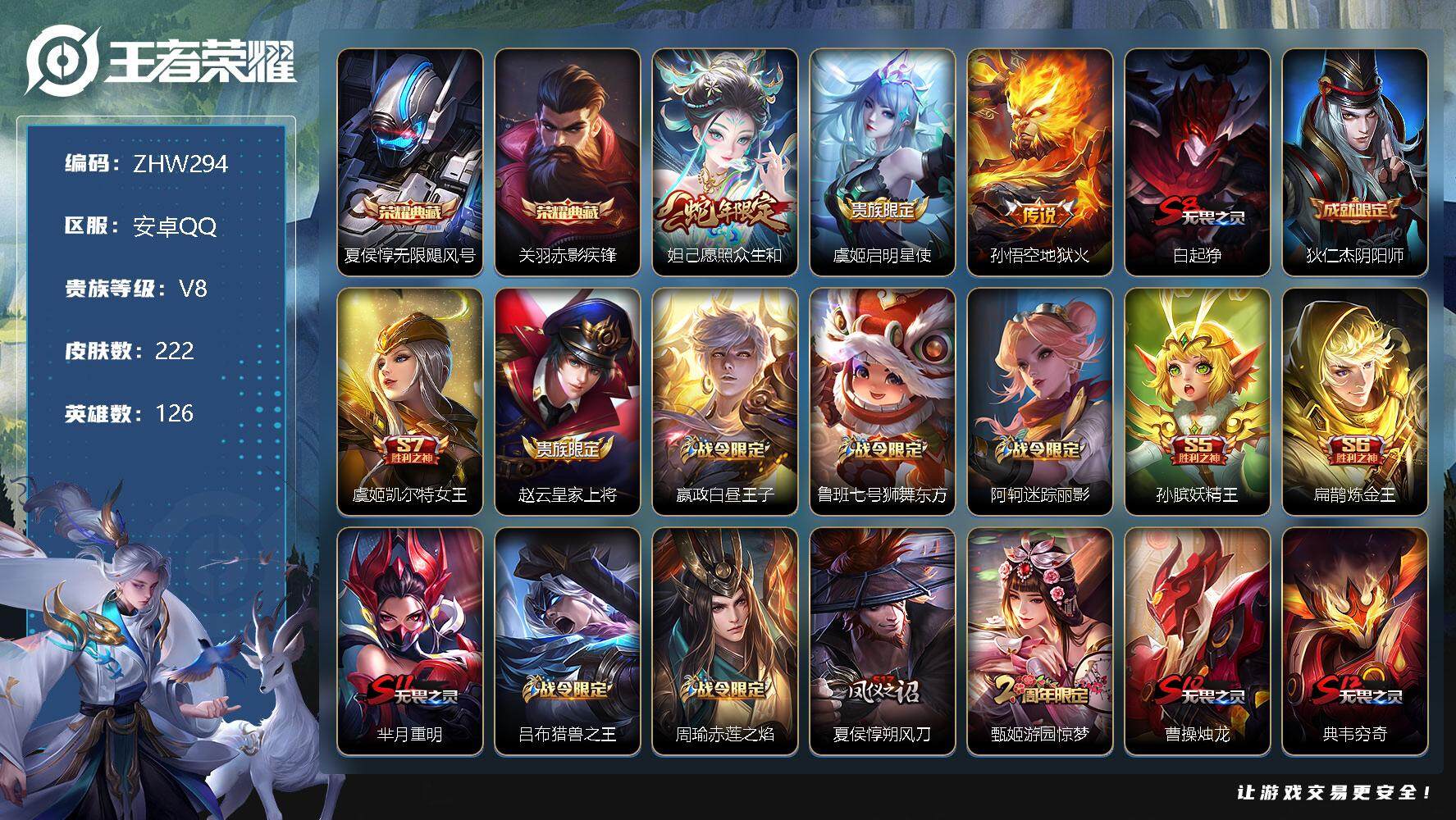 [12249280]【特价急出/详情看图】:安卓Q-V8-至尊星耀V段位-126英雄-222皮肤-2典藏-3传说-46史诗 【荣耀典藏】:夏侯惇无限飓风号,关羽赤影疾锋 【传说皮肤】:妲己愿照众生和,虞姬启明星使,孙悟空地狱火 【限定皮肤】:白起狰,狄仁杰阴阳师,虞姬凯尔特女王,赵云皇家上将,嬴政白昼王子,鲁班七号狮舞东方,阿轲迷踪丽影,孙膑妖精王,扁鹊炼金王,芈月重明,吕布猎兽之王,周瑜赤莲之焰,夏侯惇朔风刀,甄姬游园惊梦,曹操烛龙,典韦穷奇,典韦蓝屏警告,马可波罗暗影游猎,狄仁杰魔术师,达摩沙漠行僧,项羽海滩派对,老夫子醍醐杖,刘邦夺宝奇兵,兰陵王金庭之子,牛魔御旌,李元芳银河之约,虞姬启明星使,钟馗神迹守卫,女娲朔望之晖,蔡文姬繁星吟游,太乙真人饕餮,鬼谷子原初探秘者,弈星混沌棋,沈梦溪星空之诺,明世隐疑决卦,裴擒虎李小龙,狂铁御狮,米莱狄御霄,云中君纤云弄巧,盾山御銮,猪八戒西部大镖客,桑启海盐诗旅,阿古朵江河有灵,张良古海寻踪,蒙犽百解令,鬼谷子天穹祈灯,沈梦溪龙舞盛年 【赛季限定】:孙膑妖精王,扁鹊炼金王,白起狰,芈月重明,夏侯惇朔风刀,曹操烛龙,典韦穷奇,达摩沙漠行僧,老夫子醍醐杖,兰陵王金庭之子,张良古海寻踪,牛魔御旌,虞姬凯尔特女王,太乙真人饕餮,鬼谷子原初探秘者,弈星混沌棋,明世隐疑决卦,狂铁御狮,米莱狄御霄,盾山御銮,桑启海盐诗旅,鬼谷子天穹祈灯 【战令限定】:嬴政白昼王子,鲁班七号狮舞东方,阿轲迷踪丽影,吕布猎兽之王,周瑜赤莲之焰,典韦蓝屏警告,马可波罗暗影游猎,刘邦夺宝奇兵,李元芳银河之约,钟馗神迹守卫,女娲朔望之晖,沈梦溪星空之诺,猪八戒西部大镖客 【史诗皮肤】:露娜紫霞仙子,赵云皇家上将,貂蝉圣诞恋歌,甄姬冰雪圆舞曲,王昭君偶像歌手,狄仁杰魔术师,廉颇地狱岩魂,宫本武藏鬼剑武藏,孙尚香水果甜心,嬴政摇滚巨星,妲己魅力维加斯,妲己女仆咖啡,吕布圣诞狂欢,吕布末日机甲,张飞乱世虎臣,花木兰水晶猎龙者,刘邦德古拉伯爵,夏侯惇乘风破浪,兰陵王暗隐猎兽者,诸葛亮黄金分割率,甄姬游园惊梦,雅典娜冰冠公主,铠曙光守护者,蔡文姬舞动绿茵,刘禅天才门将,李元芳逐浪之夏,程咬金功夫厨神,白起星夜王子,阿轲节奏热浪,嬴政白昼王子,典韦蓝屏警告,鲁班七号狮舞东方,狄仁杰鹰眼统帅,蔡文姬繁星吟游,李元芳银河之约,小乔青蛇,阿轲迷踪丽影,马可波罗暗影游猎,裴擒虎李小龙,云中君纤云弄