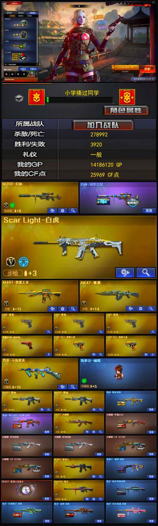 【热门武器】:Scar Light-白虎,M200-幻神,金色蔷薇-古蛇迷踪,修罗-古蛇迷踪,荣耀世冠-雷神,荣耀世冠-柯尔特,M4A1-黑骑士,斯泰尔-蝴蝶,COP-白鲨,USP-雷暴*3,COP 357-雷霆王者,荣耀世冠-龙啸